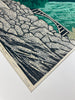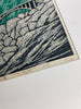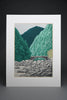 Executed using traditional Japanese woodblock techniques, the print displays meticulous carving and precise registration. The layered printing reveals fine surface textures, particularly in the rocky foreground and the striated mountainsides, where repeated geometric cuts suggest foliage, shadow, and depth. These tactile qualities reward close viewing and underscore the artist’s technical discipline.