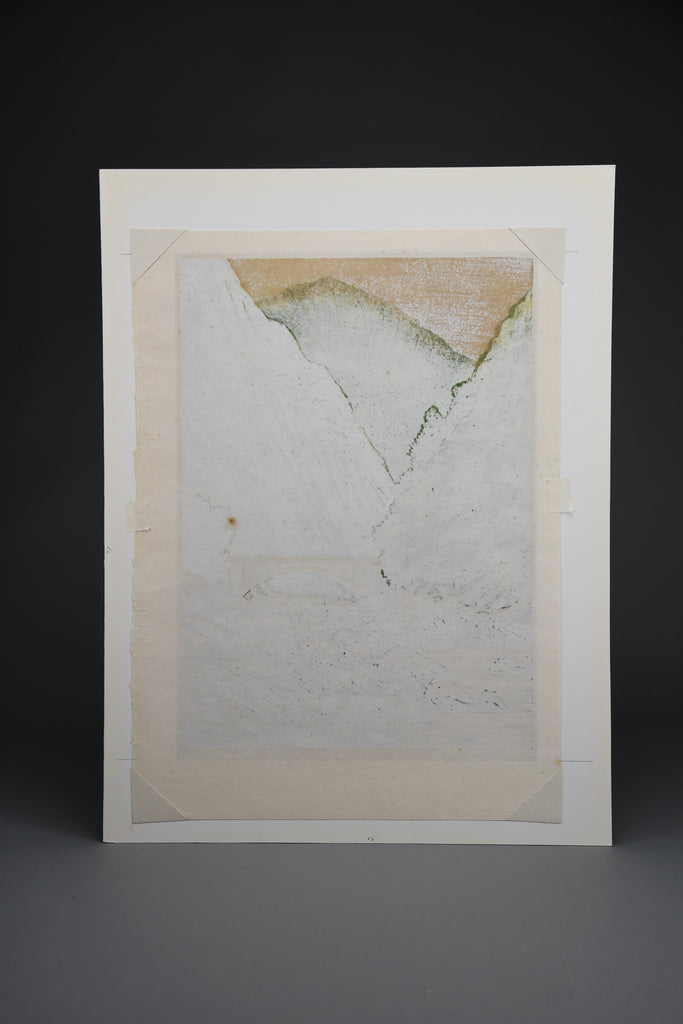 Fujita Fumio’s landscapes are admired for their ability to bridge tradition and modernity. While firmly rooted in classical Japanese aesthetics—particularly the legacy of shin-hanga and sōsaku-hanga—his work also speaks to a modern sensibility through its graphic clarity and calm abstraction. As such, Bridge in the Valley works equally well in a traditional collection of Japanese prints or in a contemporary interior, where its disciplined composition and natural palette bring quiet authority to a space.