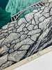 The scene unfolds within a secluded mountain valley, where steep, patterned slopes converge toward a central bridge spanning a rocky riverbed. The interplay between natural forms and human intervention is subtle and poetic: the bridge does not dominate the landscape but exists in harmony with it, reinforcing a sense of balance and timelessness. Fujita’s use of deeply saturated greens, softened by muted earth tones and pale stone textures, creates a restrained palette that feels both meditative and visually rich.