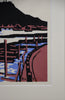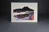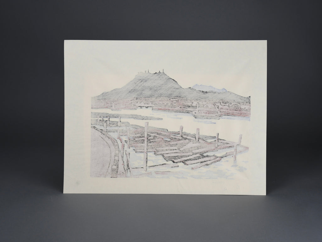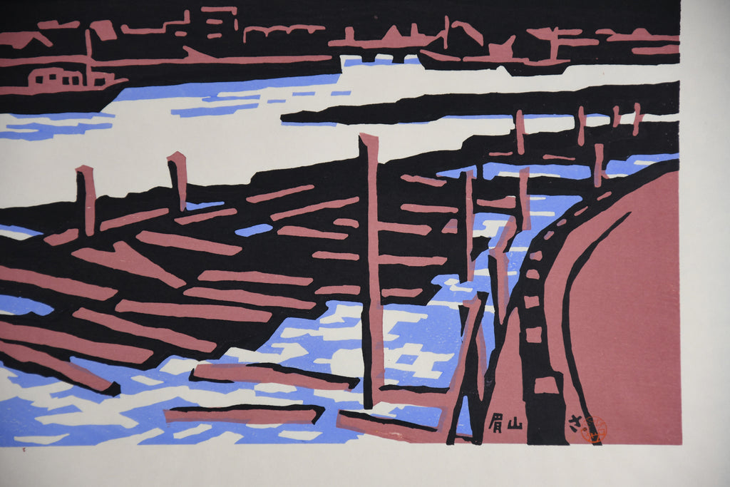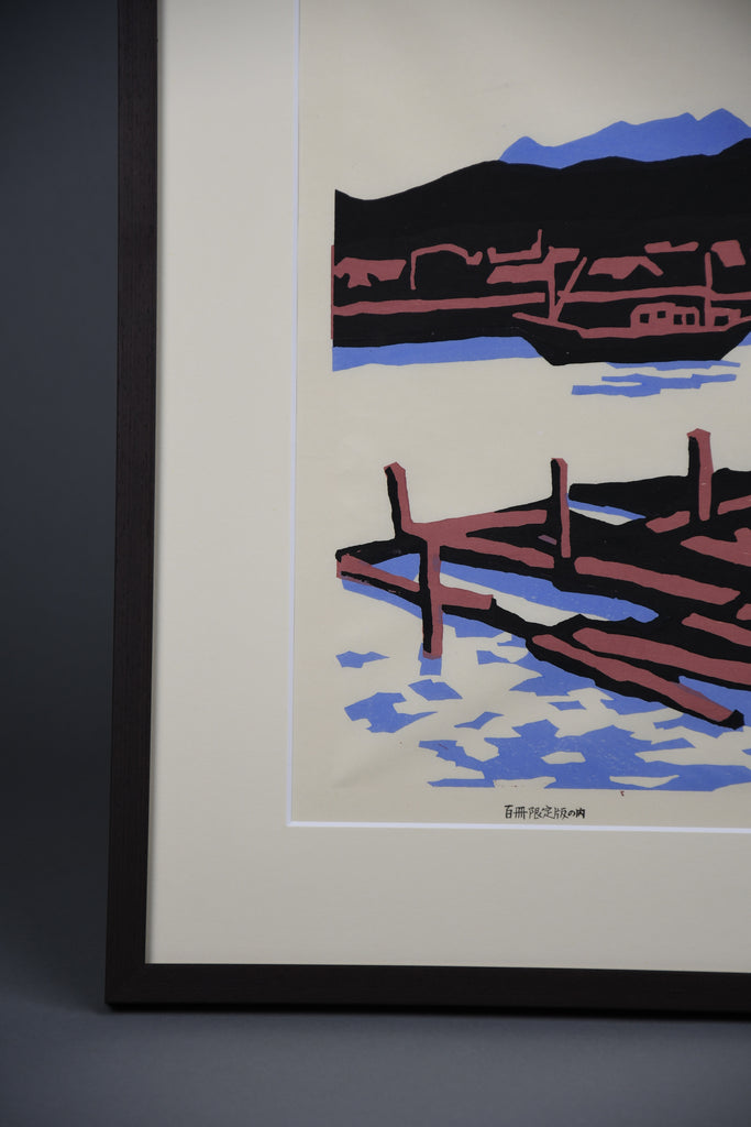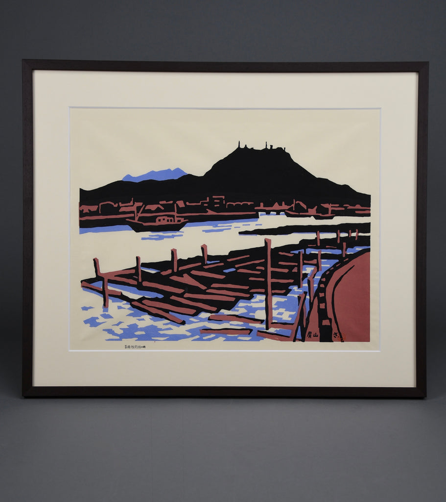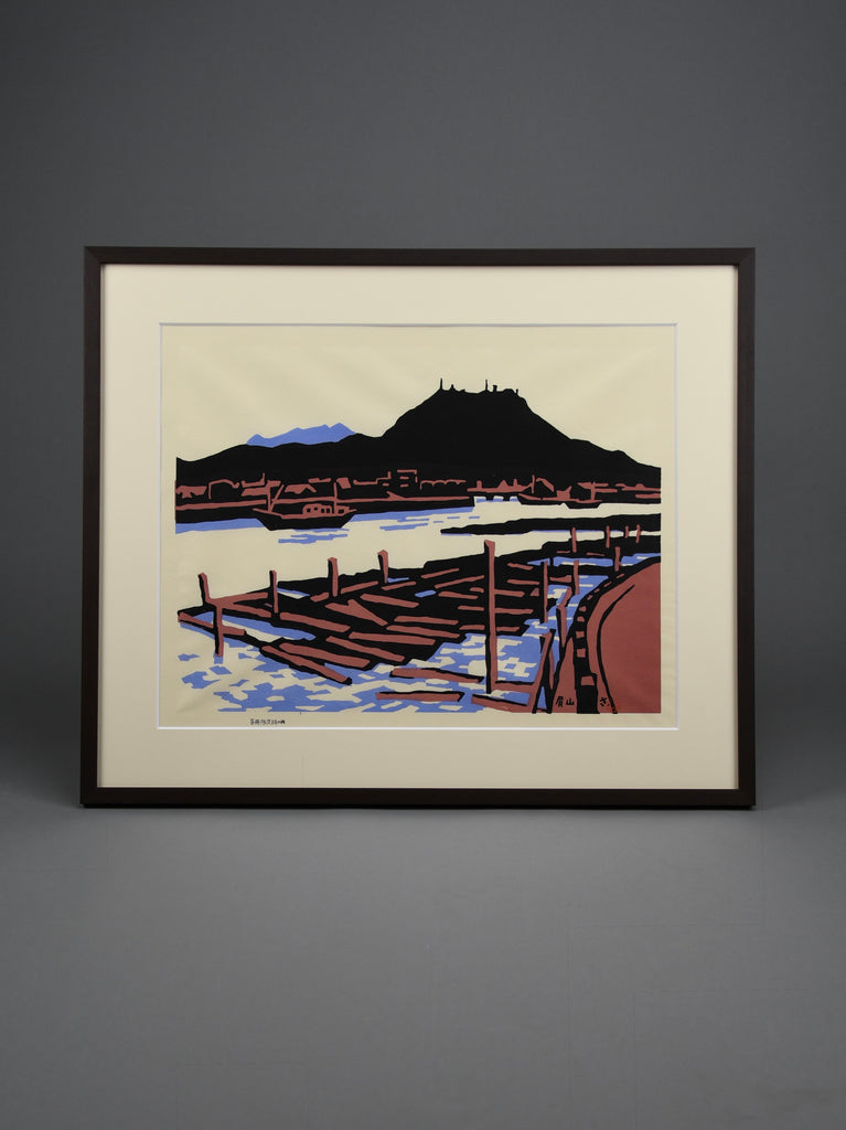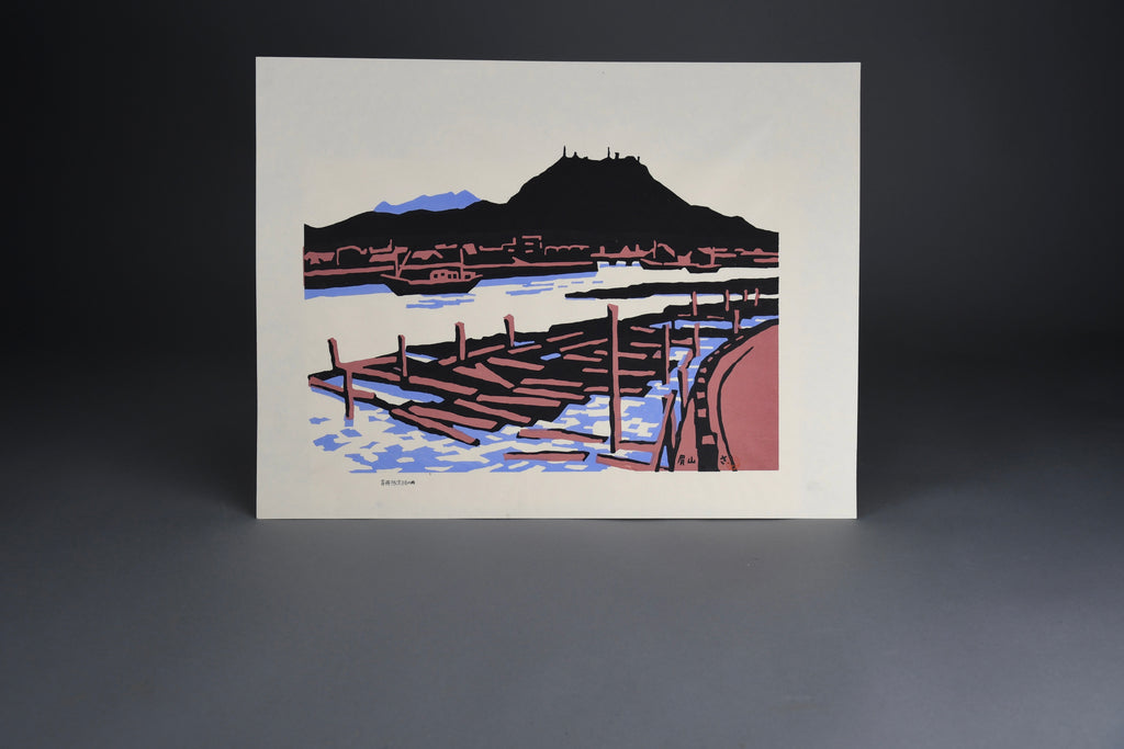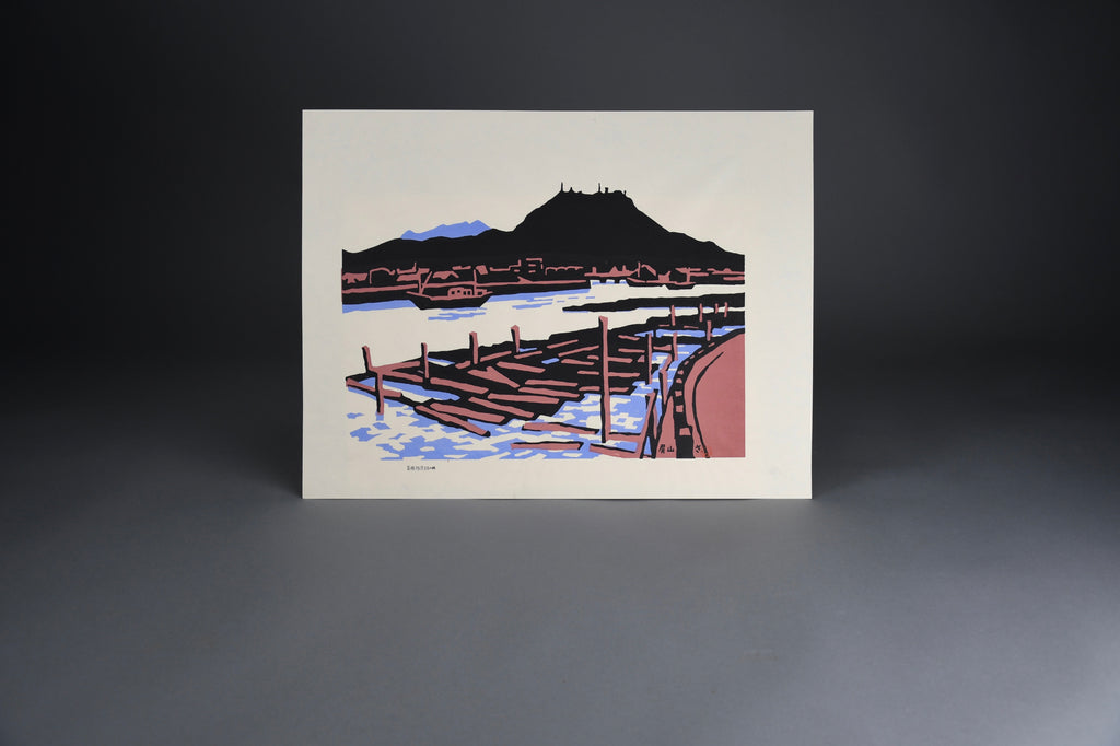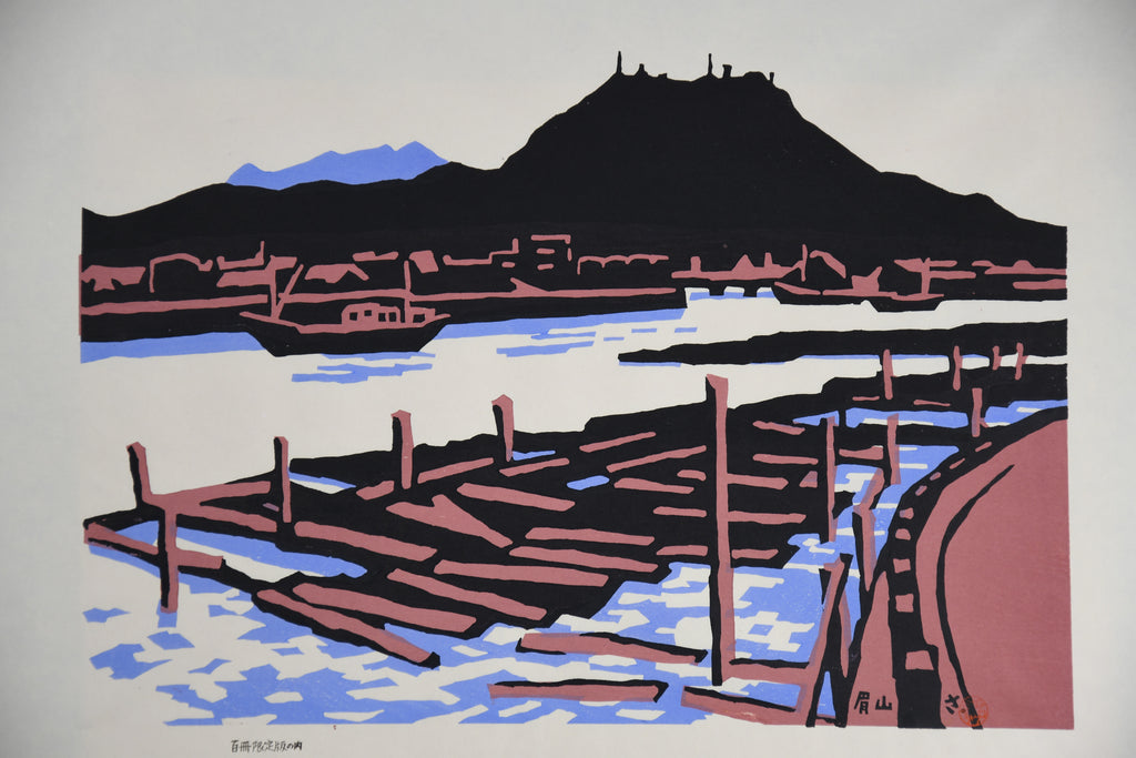 A refined limited-edition Japanese woodblock print titled Mount Bizan by the celebrated Japanese printmaker Saburō Miyata. This striking composition depicts the silhouette of Mount Bizan rising above a quiet riverside landscape, rendered in Miyata’s distinctive modern interpretation of traditional Japanese printmaking.