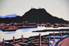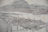 The composition is characterized by bold graphic contrasts and a carefully balanced palette of deep black, muted blues, and warm earth tones. In the foreground, timber rafts rest along the water’s edge while the town unfolds beneath the mountain, creating a serene yet powerful landscape typical of Miyata’s contemplative style.