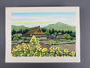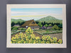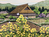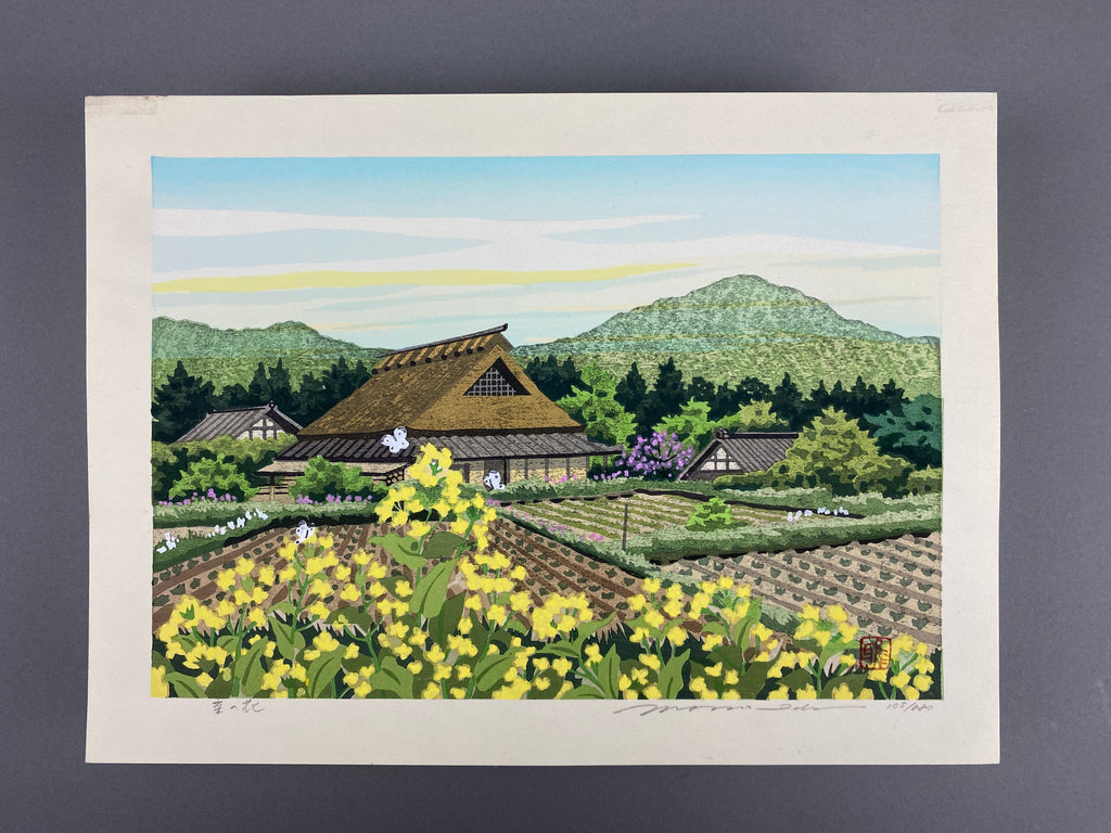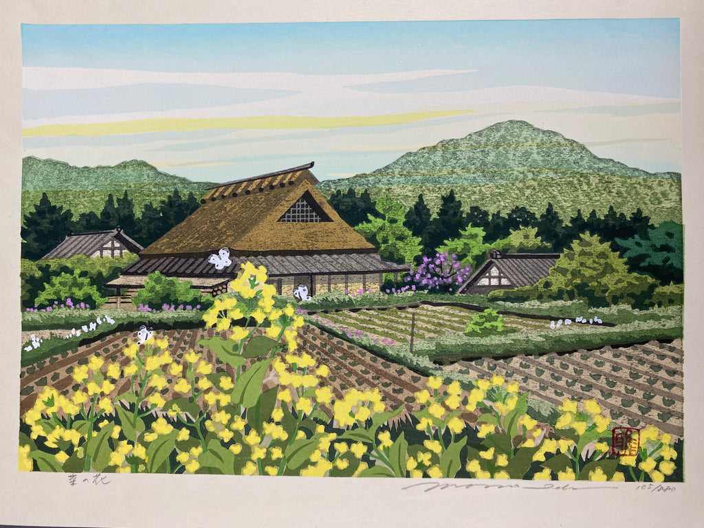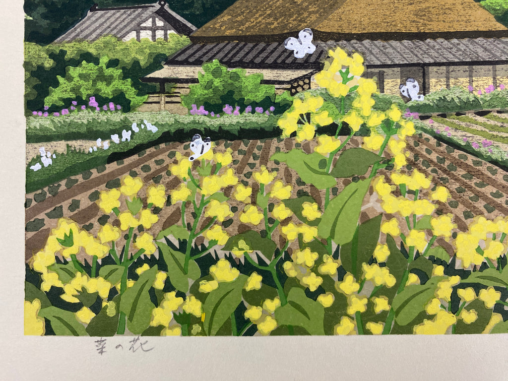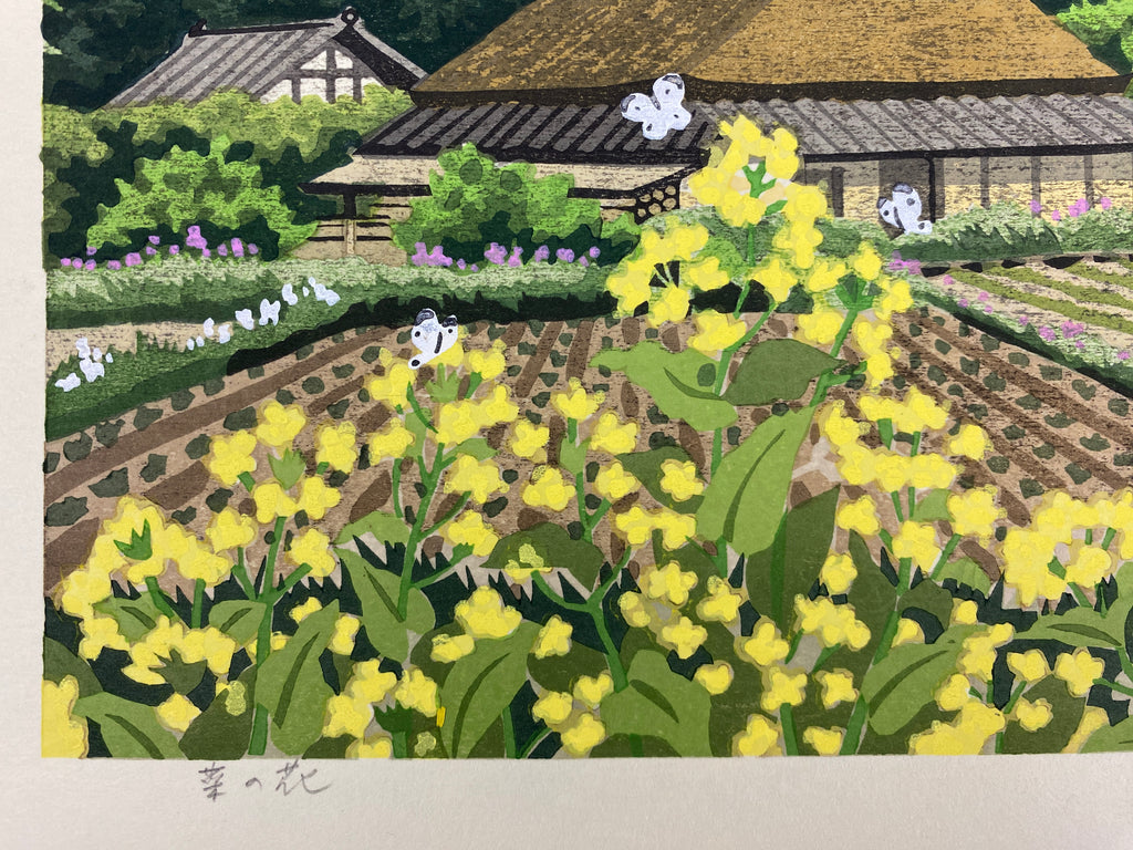 “Rape Blossoms” presents a luminous vista in which fields of yellow blossoms (rape, nanohana) stretch toward the horizon, their vivid glow set against the soft greens of cultivated land and the tranquil architecture of a rural Japanese dwelling. The composition is framed by gently rolling hills and a sky suffused with morning light. Butterflies drift through the scene, infusing it with an ephemeral life. The interplay of color, light, and delicate detail evokes a quiet reverie — the hush of early spring in Japan, captured through Ido’s masterful hand.