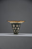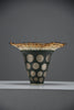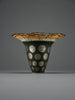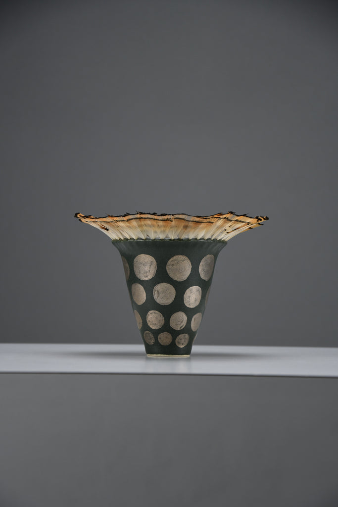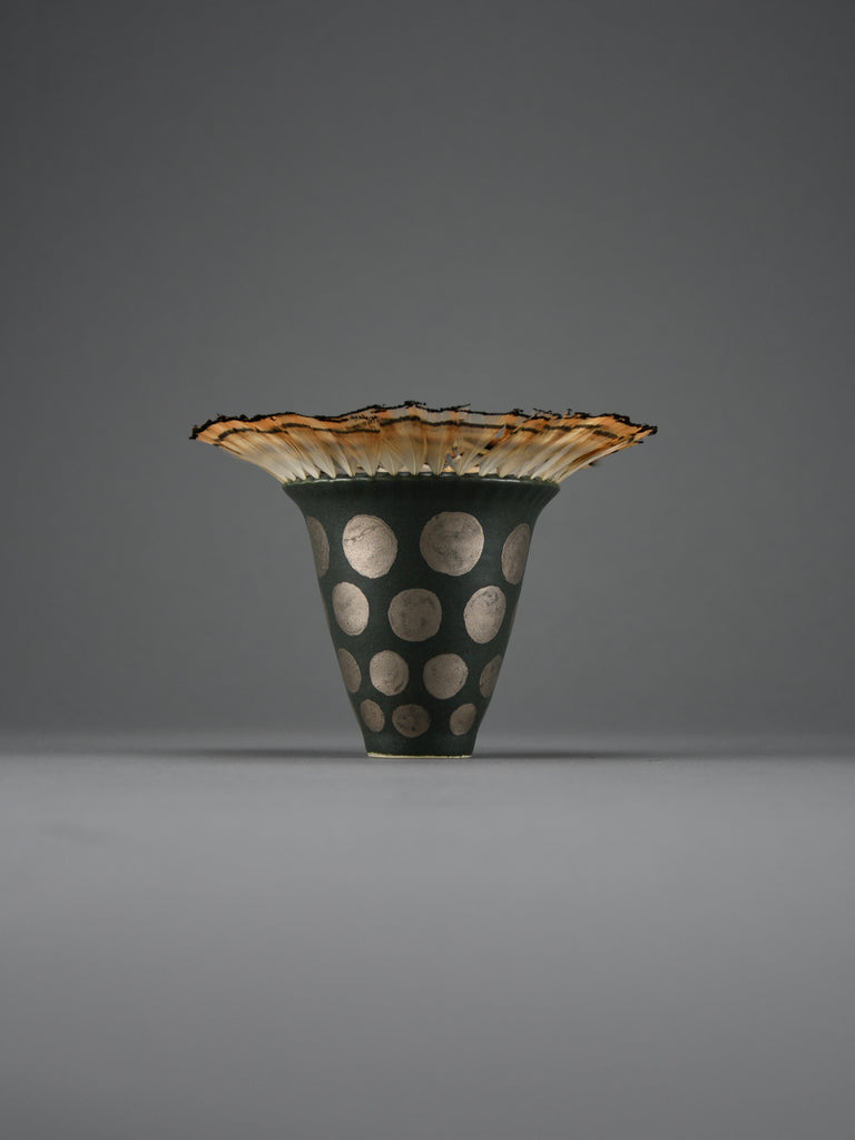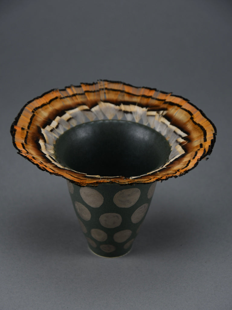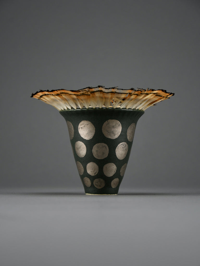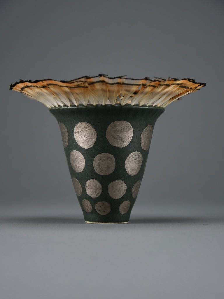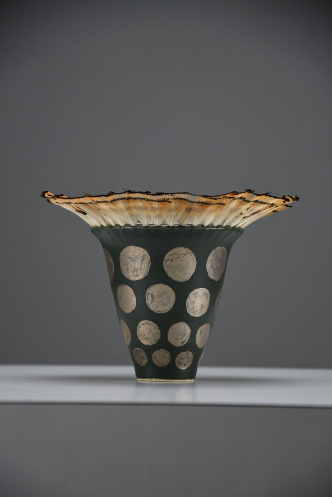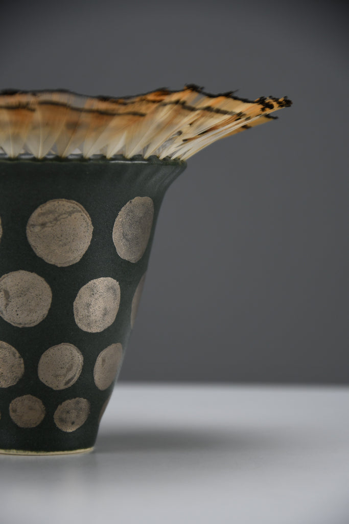 The surface of the vase is decorated with a rhythmic pattern of hand-applied metallic circles, set against a matte dark ground. The combination of tactile glaze work and the soft, airy feather detailing gives this piece a unique sculptural presence. The vase is monogrammed on the bottom, attesting to its authenticity and the artist’s hand.