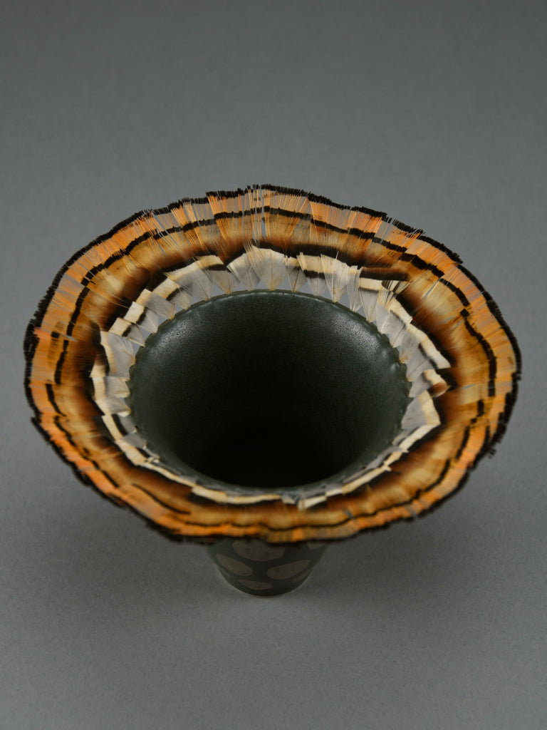 This exquisite and rare “Vase with Feathers” by Renate Weidner (German, b. 1943) is a remarkable example of her innovative and poetic approach to contemporary ceramics. Created in 2004, the piece seamlessly merges refined ceramic craftsmanship with organic materiality. The flared vessel is delicately adorned with a crown of natural feathers, creating a striking interplay between structure and fragility, tradition and experimentation.