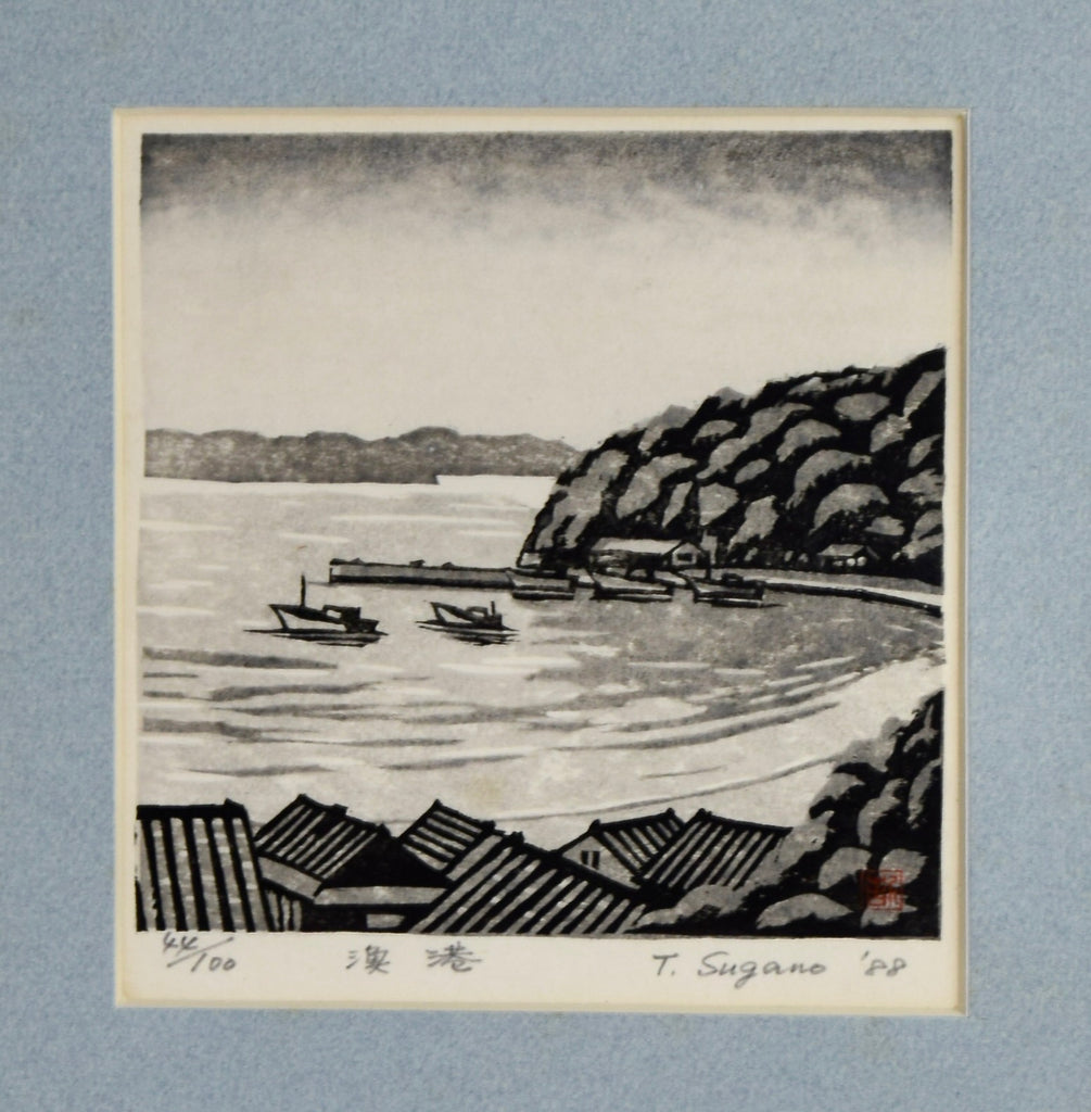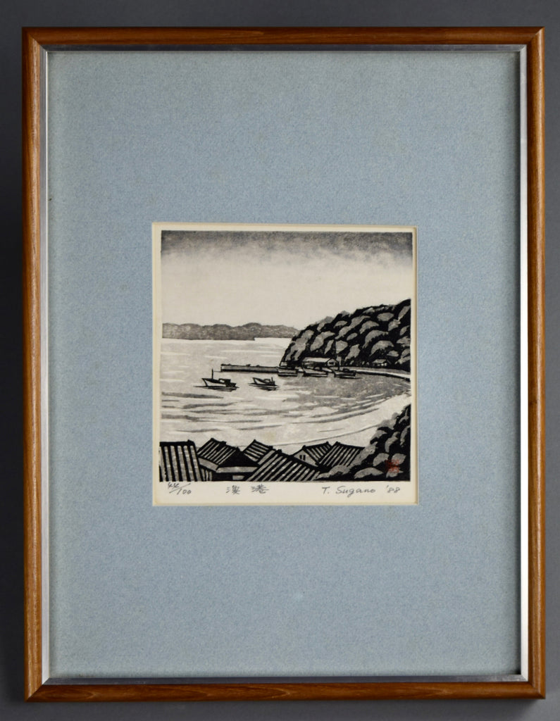 T. Sugano (active late 20th century) is a Japanese printmaker known for his evocative landscapes rendered in the sōsaku hanga (creative print) tradition. Working primarily in the 1980s, Sugano produced limited-edition woodblock prints that celebrate traditional Japanese scenery — fishing villages, coastal vistas, and rural architecture — with a modern, simplified aesthetic. His works are prized for their clarity of line, balanced composition, and serene atmosphere.