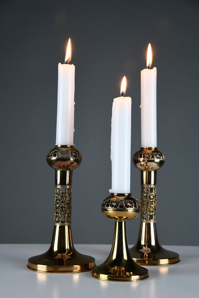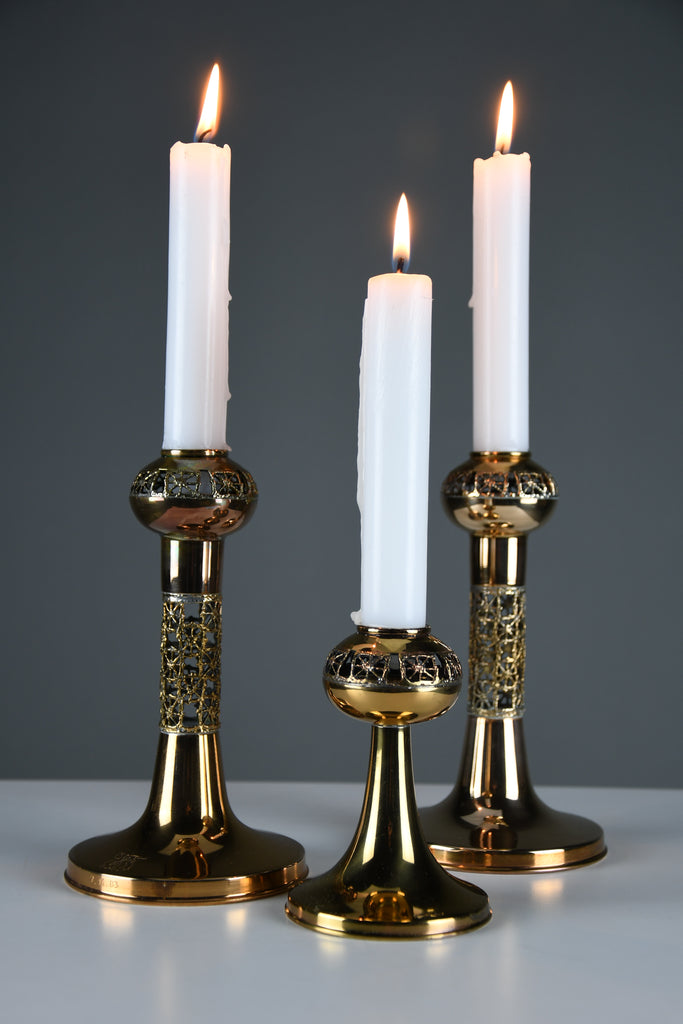 A beautiful set of three Mid-Century Modern copper candlesticks from the “Pitsi” (Lace) series, designed by Pentti Sarpaneva for Turun Hopea, Finland, circa 1960s.