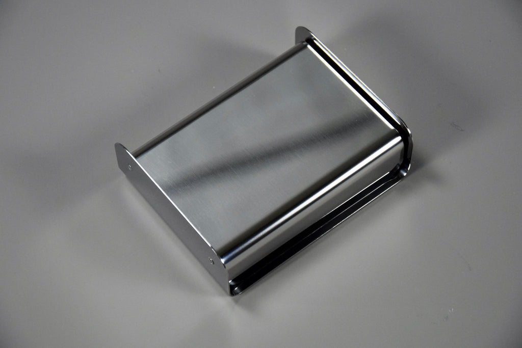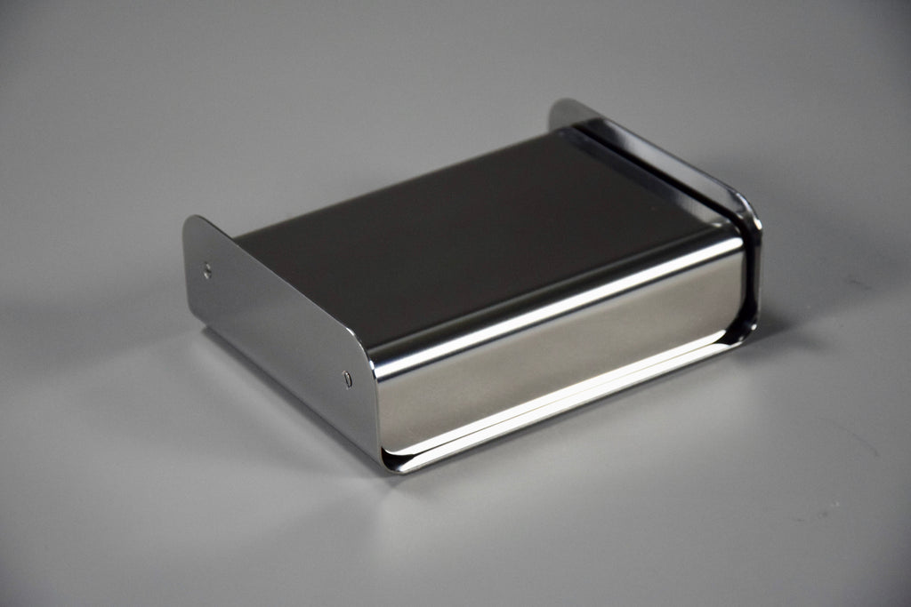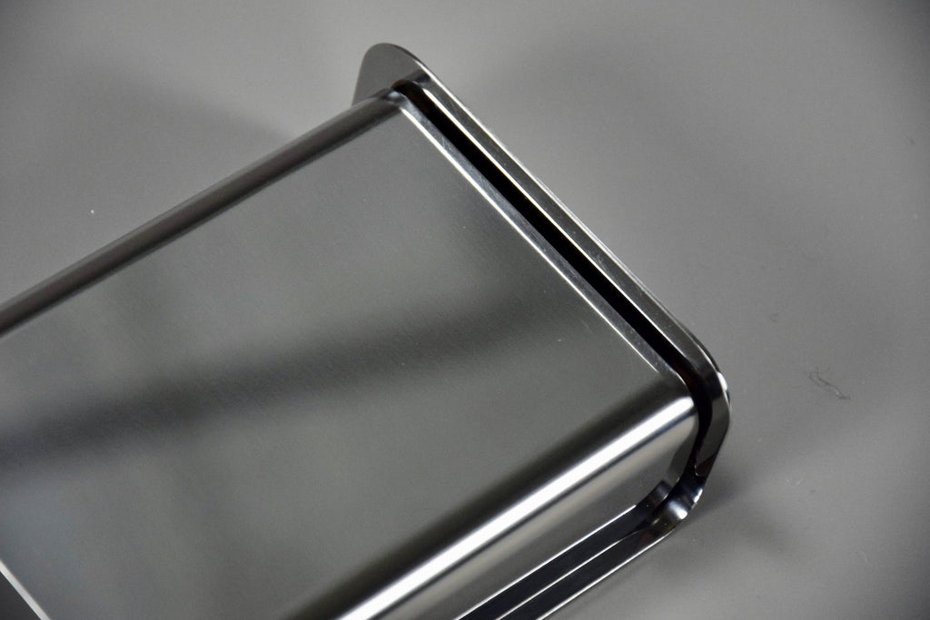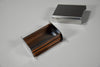 Discover a pristine example of Italian modernist design with this rare new old stock “Rodi” box, designed in 1960 by Enzo Mari for Danese Milano. Crafted from brushed stainless steel and warm, richly grained Jatoba wood, this compact yet striking object embodies Mari’s minimalist philosophy and deep commitment to functional beauty.