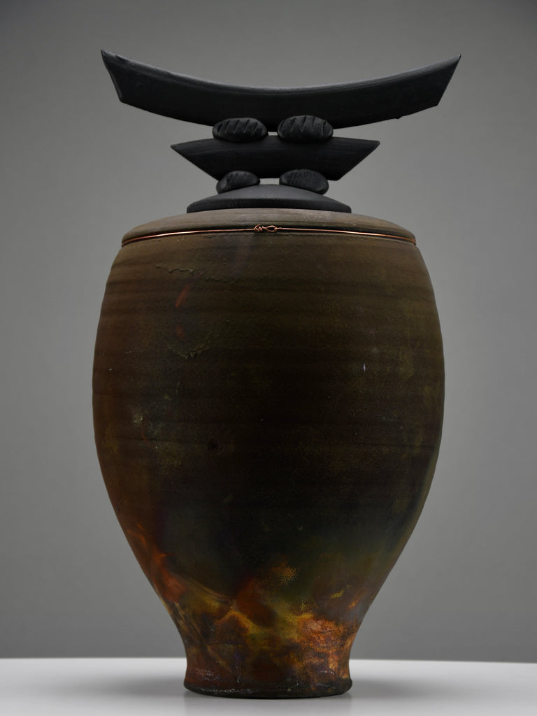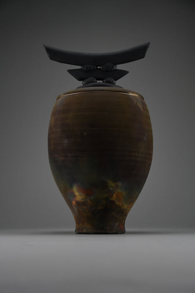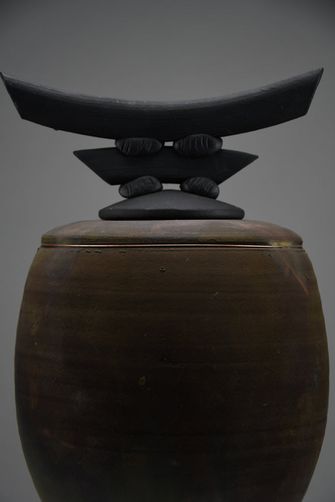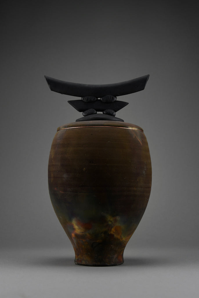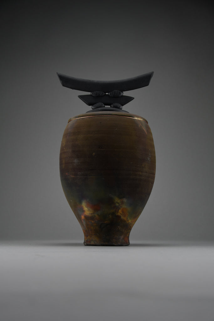 Crowning the piece is a striking, sculptural finial in deep black. Its bold, geometric shapes and balanced composition give the vessel a contemporary edge while maintaining a timeless sense of ritual and formality. This interplay between the vessel’s organic surface and the strong architectural quality of the lid demonstrates Johnson’s sophisticated aesthetic sensibility.