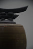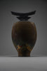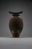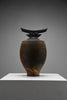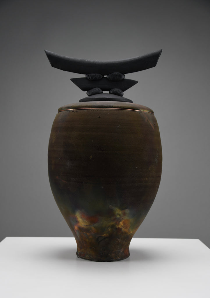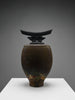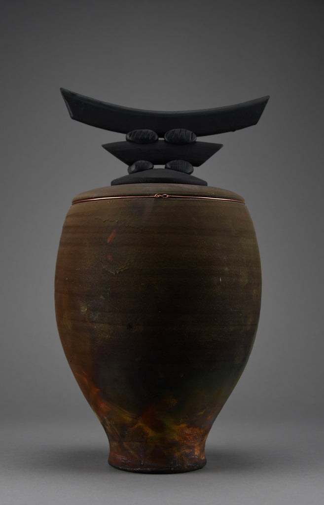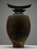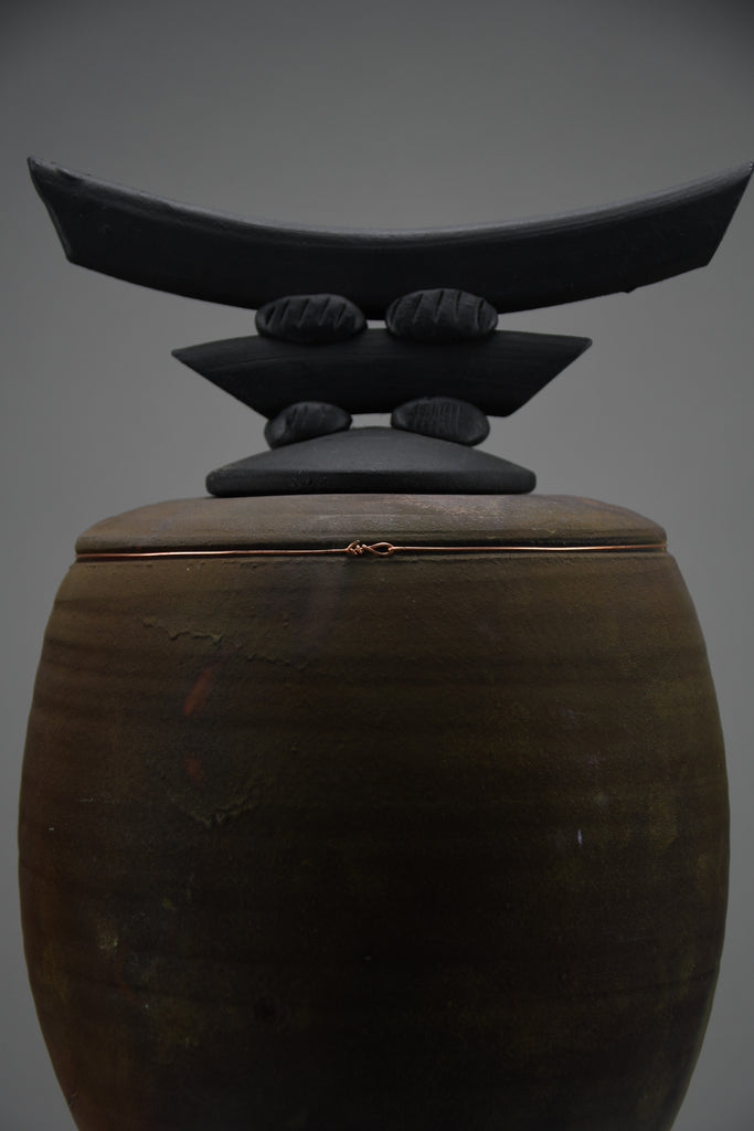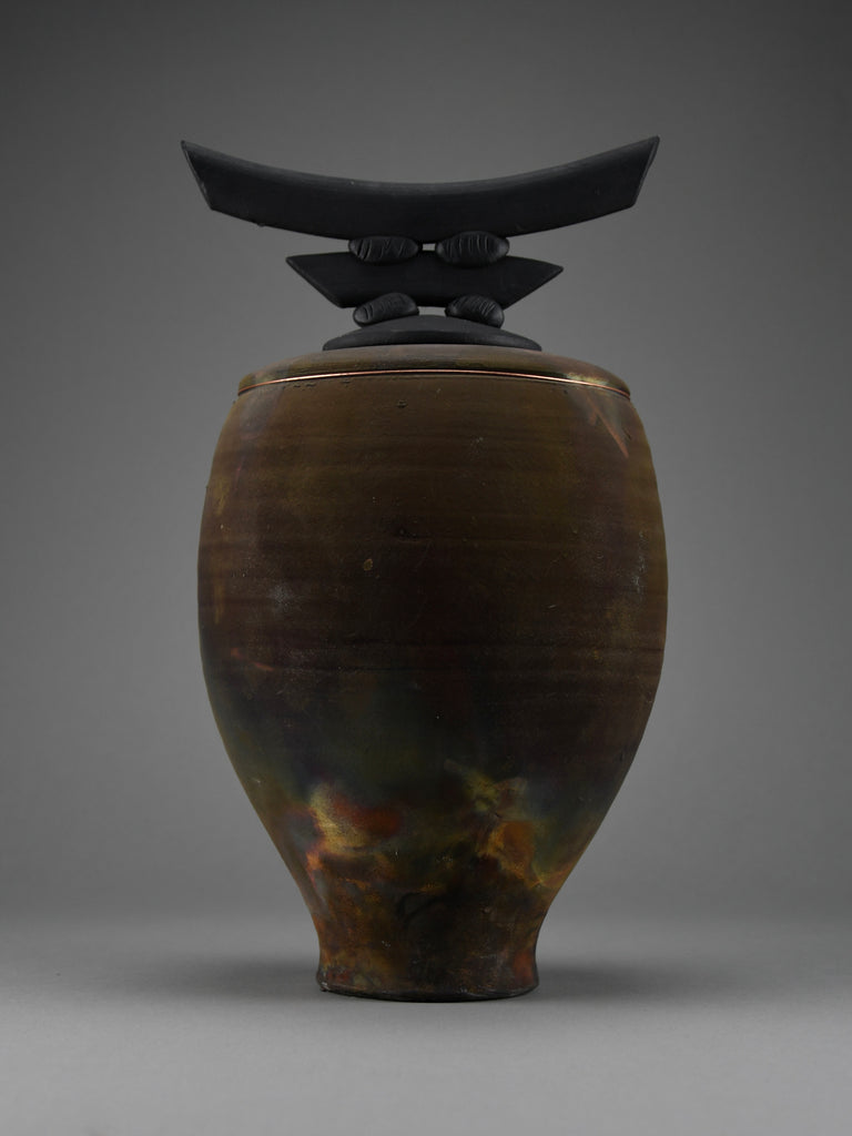 Crowning the piece is a striking, sculptural finial in deep black. Its bold, geometric shapes and balanced composition give the vessel a contemporary edge while maintaining a timeless sense of ritual and formality. This interplay between the vessel’s organic surface and the strong architectural quality of the lid demonstrates Johnson’s sophisticated aesthetic sensibility.