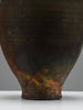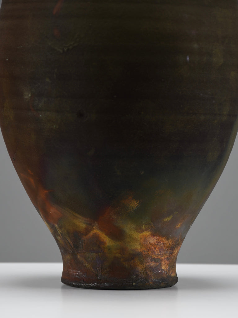 This exquisite ceramic vessel, created by Bruce Johnson in 1999, is a striking example of masterful craftsmanship and artistic vision. Measuring H. 35.5 cm x D. 20 cm (approximately H. 14 in x D. 7.9 in), it commands attention with its harmonious proportions and sculptural presence. The body features a rich, earthy surface with smoky, flame-like variations—hallmarks of the raku firing technique—while a finely applied brass detail encircles the lid, introducing a subtle, elegant gleam that contrasts beautifully with the matte ceramic finish.