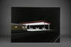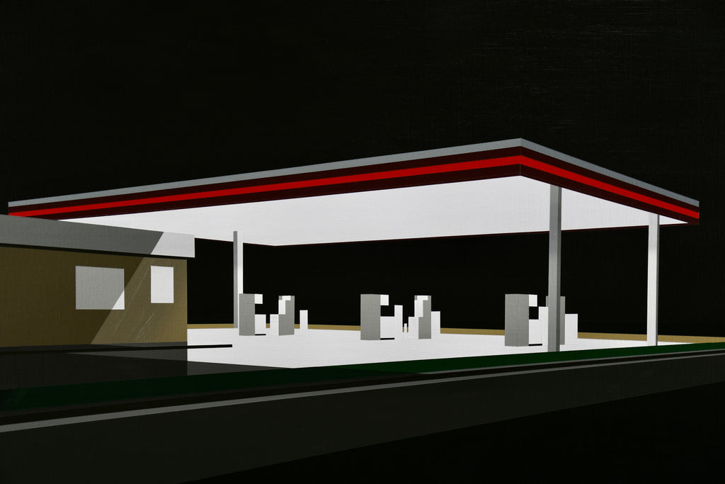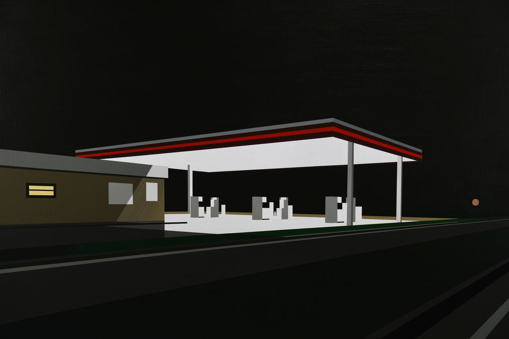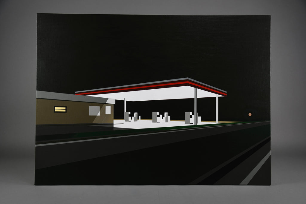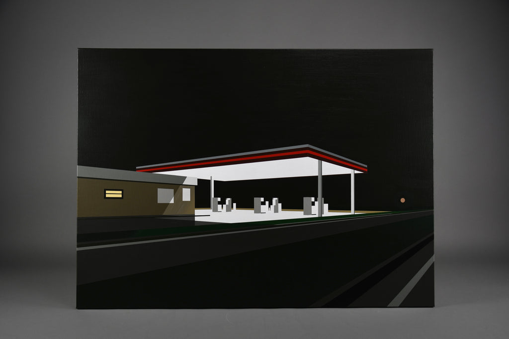 In ‘En Route’, Molenaar depicts a nocturnal gas station reduced to its purest form—planes of color, crisp lines, and an uncanny stillness. The scene radiates both familiarity and estrangement, echoing the tradition of Edward Hopper while remaining unmistakably contemporary. The contrast between the stark illuminated canopy and the infinite blackness of the night imbues the work with a sense of solitude and passage, fitting for its title.
