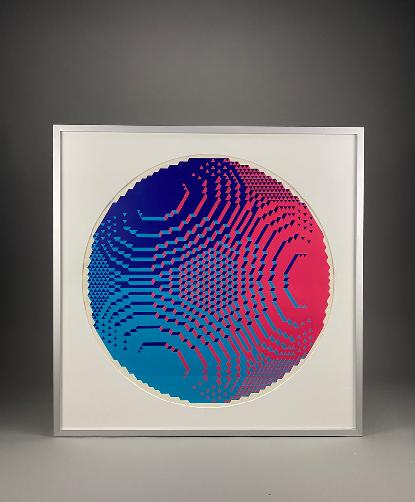 A visually arresting example of Dutch post-war geometric abstraction, Cubic Cosmic City (1968) is a rare collaborative print by Jan Slothouber and Willem Graatsmaāpioneers of the cube as a structural and conceptual art form. This vibrant lithograph plays with spatial perception, symmetry, and color gradient, shifting from deep indigo to electric magenta in a hypnotic pixel-like pattern.