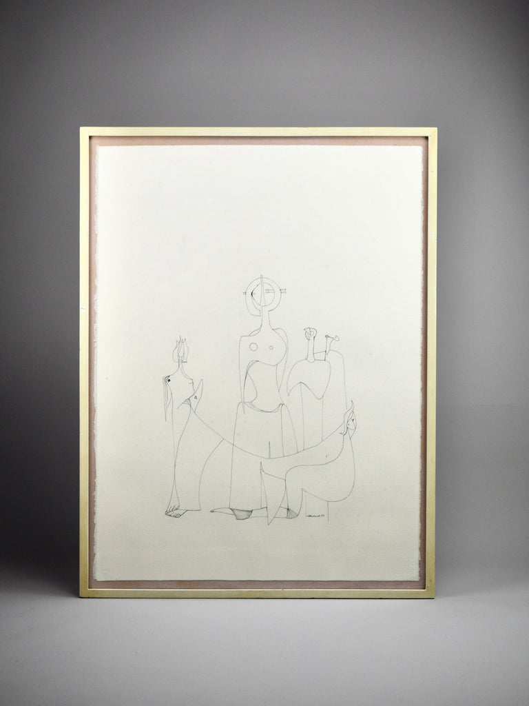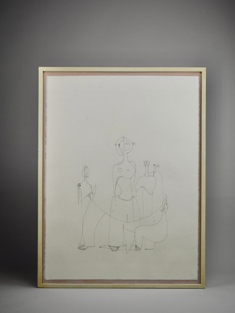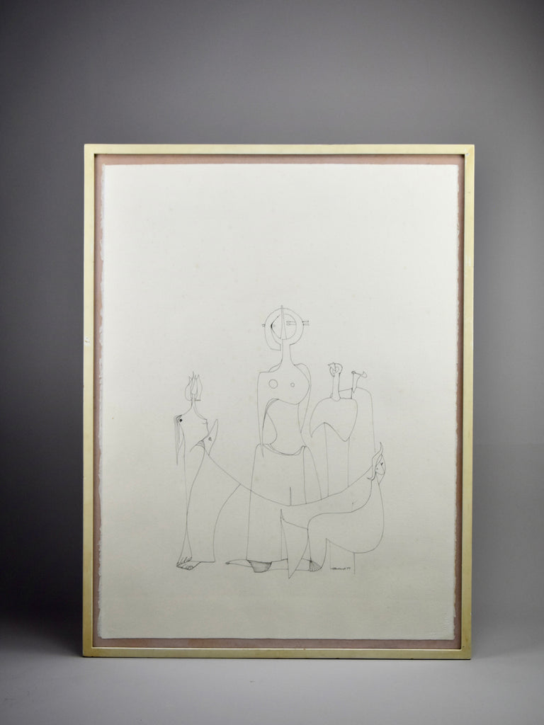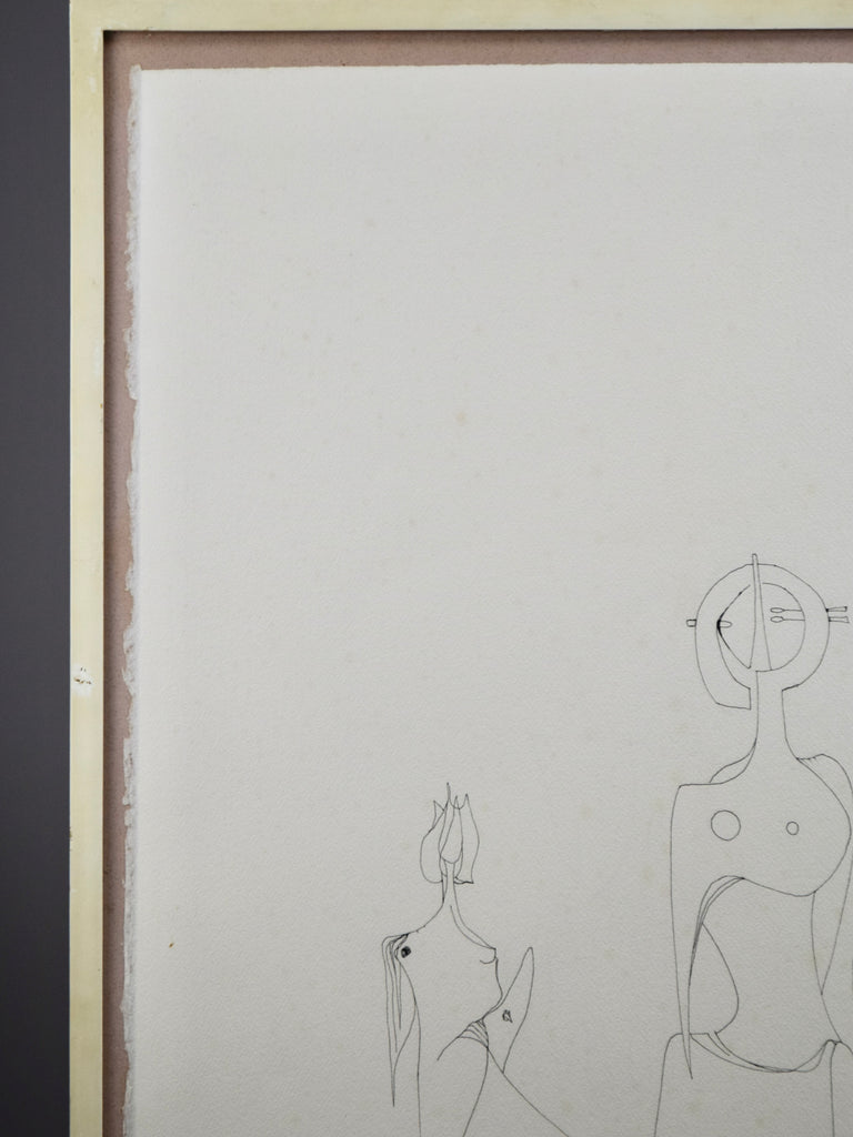 Vintage ObjectsThis captivating artwork by Rita Aldrovandi, displayed here in elegant minimalist style, is a profound testament to the artist’s visionary approach to line drawings. Aldrovandi, celebrated for her abstract yet deeply emotional representations, brings forth a delicate balance of human and organic forms. The soft curvature and graceful simplicity of the figures reflect a mastery in capturing movement and essence with minimal strokes, embodying a sense of timeless elegance. The influence of surrealist and avant-garde movements is subtly woven into this work, making it a perfect acquisition for collectors seeking to embrace both modernity and classical artistry.