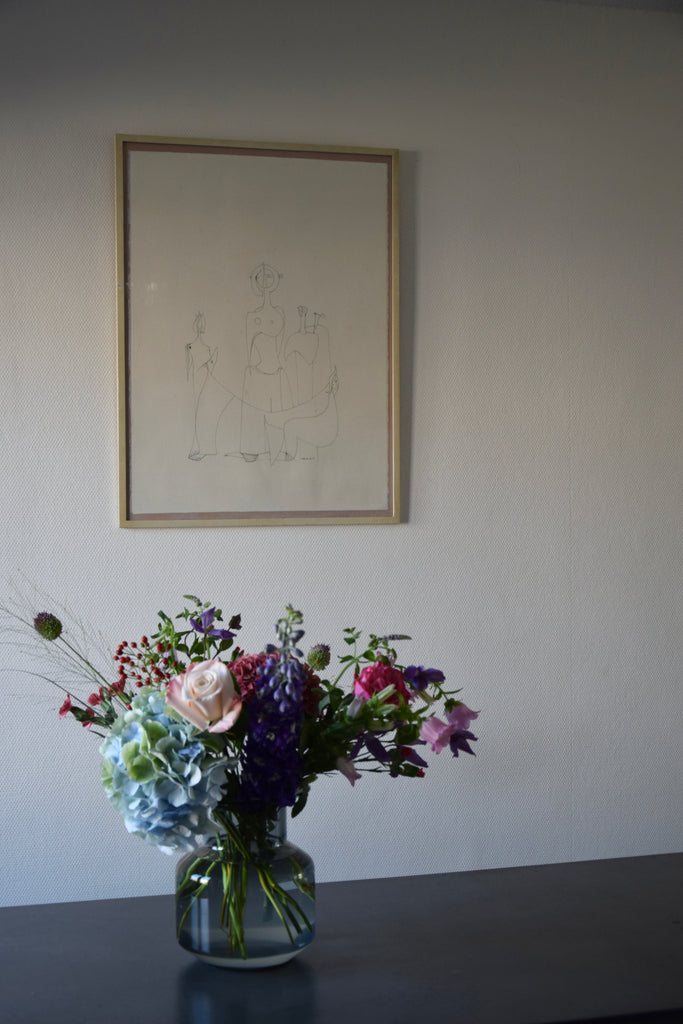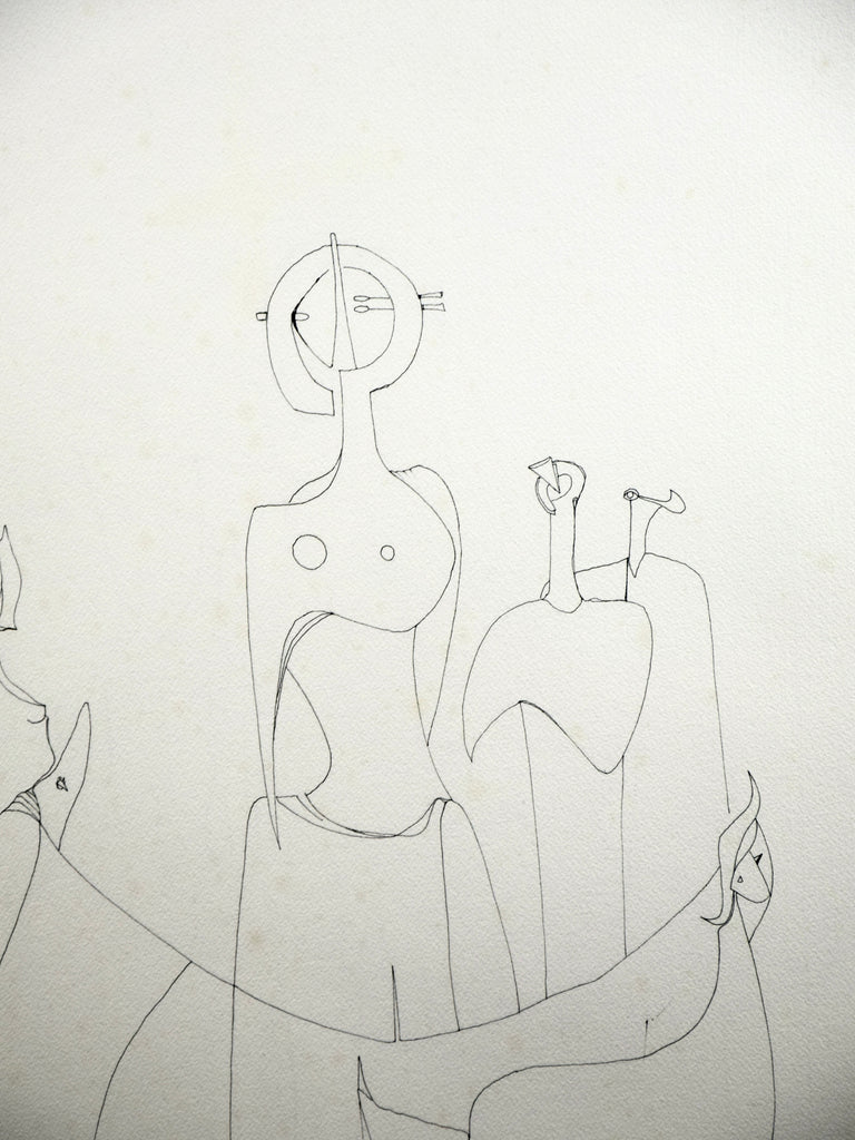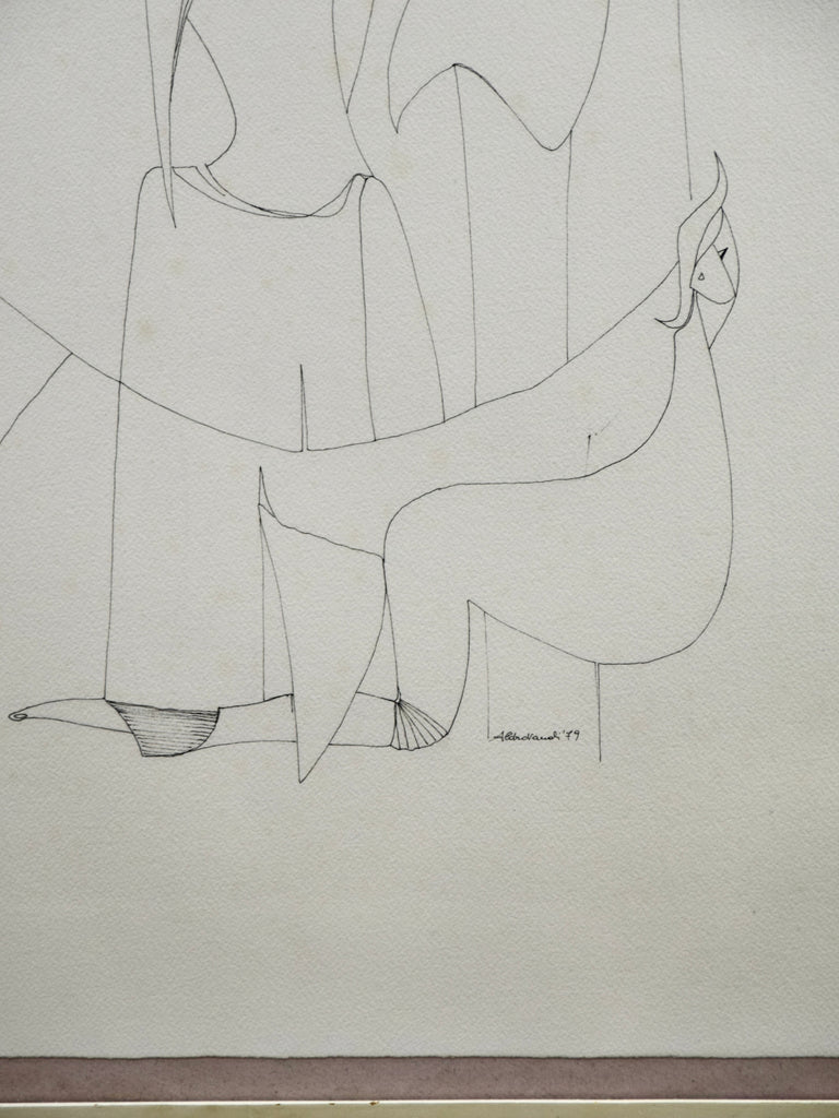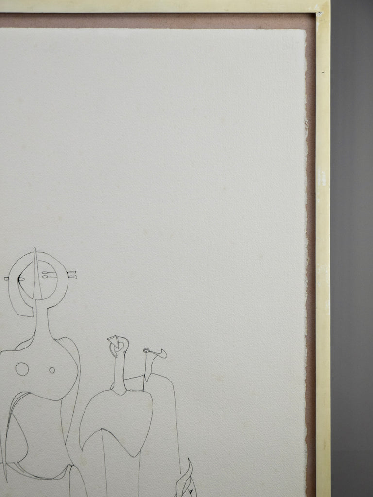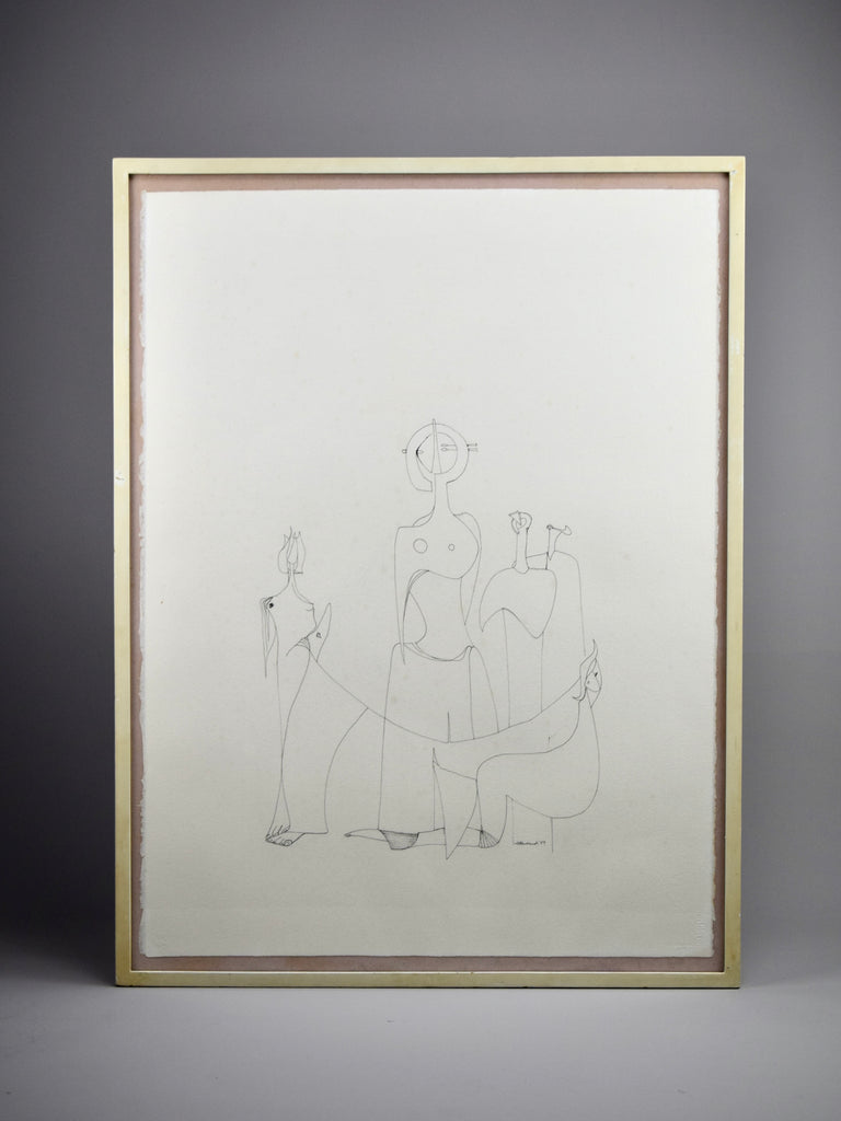 Vintage ObjectsThis captivating artwork by Rita Aldrovandi, displayed here in elegant minimalist style, is a profound testament to the artist’s visionary approach to line drawings. Aldrovandi, celebrated for her abstract yet deeply emotional representations, brings forth a delicate balance of human and organic forms. The soft curvature and graceful simplicity of the figures reflect a mastery in capturing movement and essence with minimal strokes, embodying a sense of timeless elegance. The influence of surrealist and avant-garde movements is subtly woven into this work, making it a perfect acquisition for collectors seeking to embrace both modernity and classical artistry.