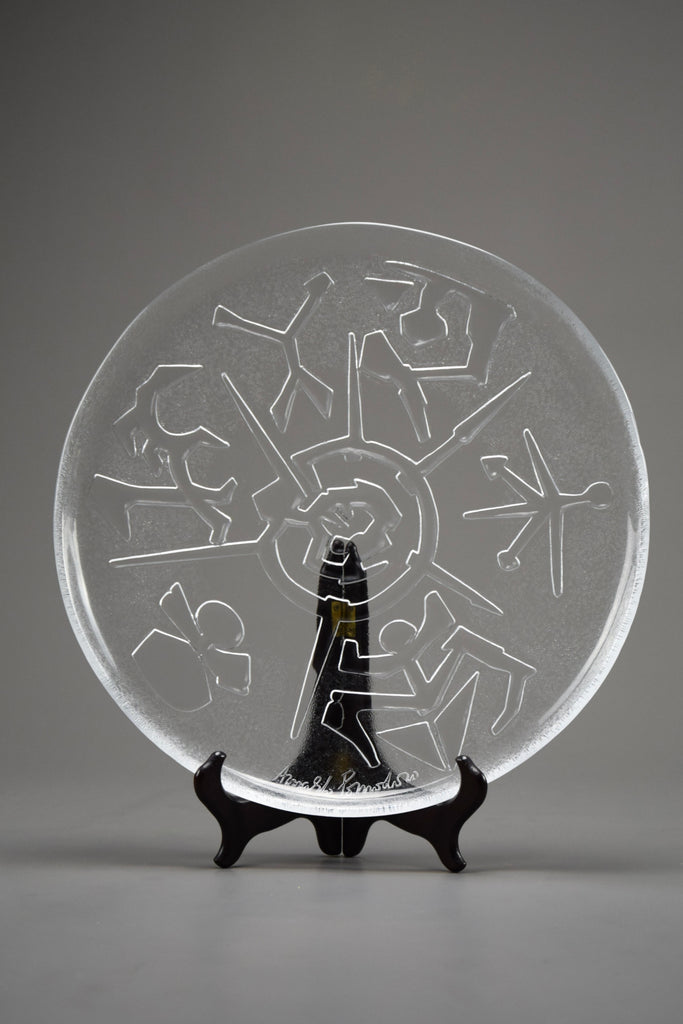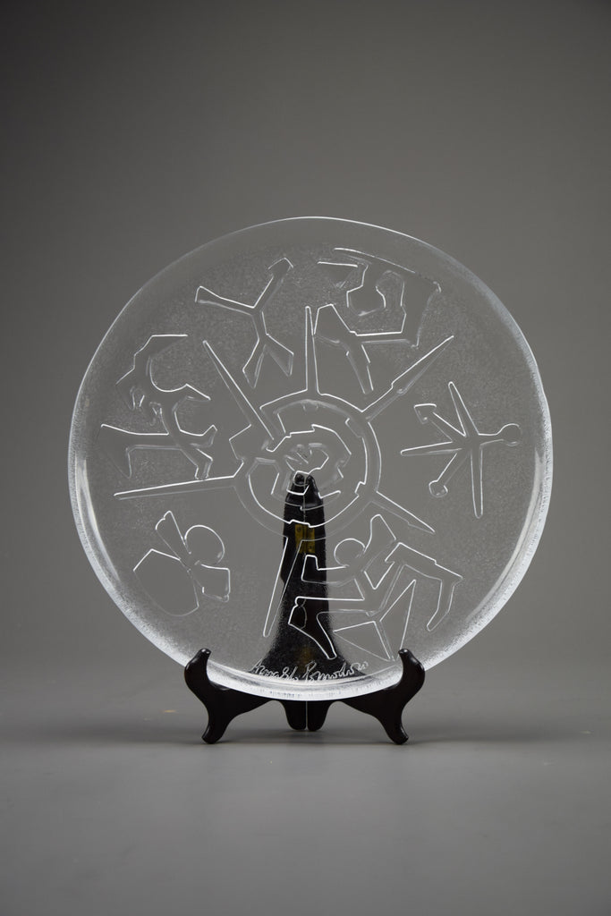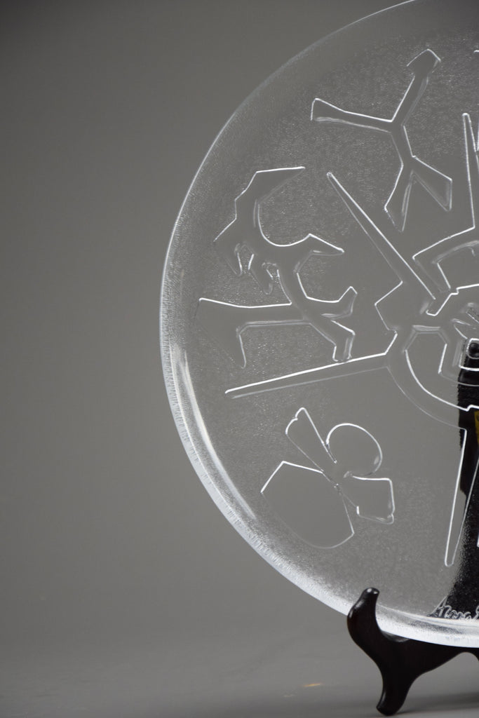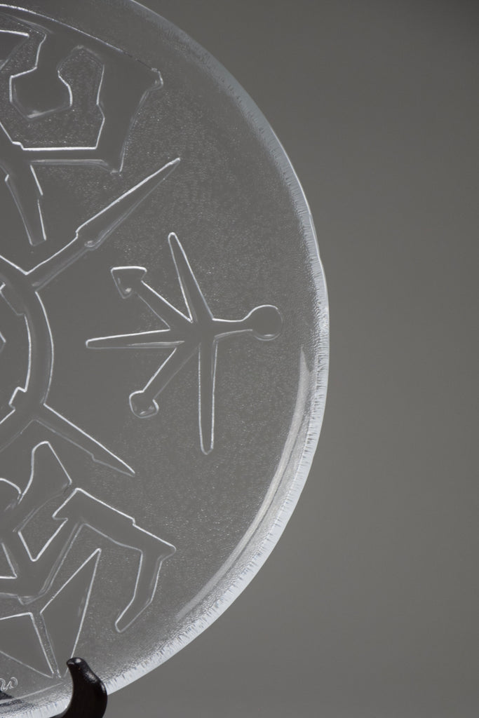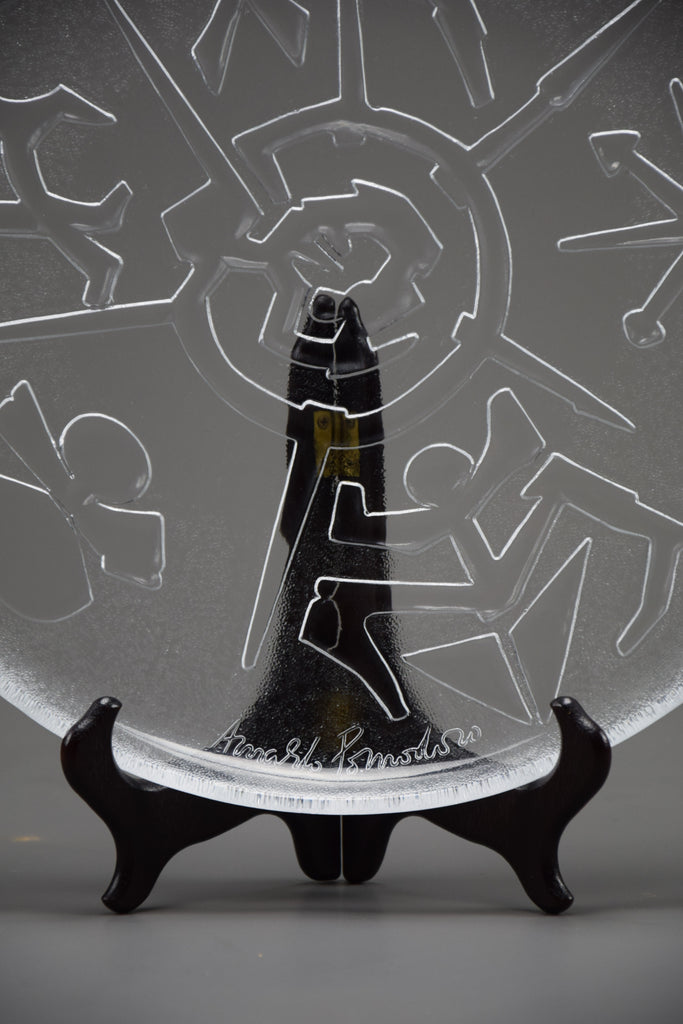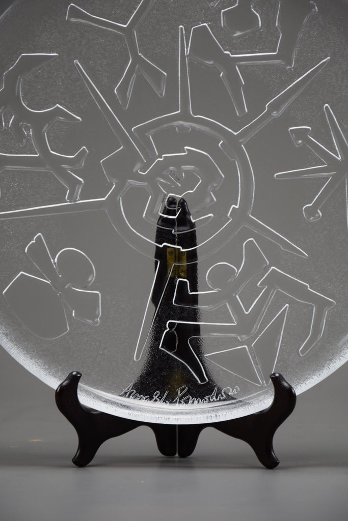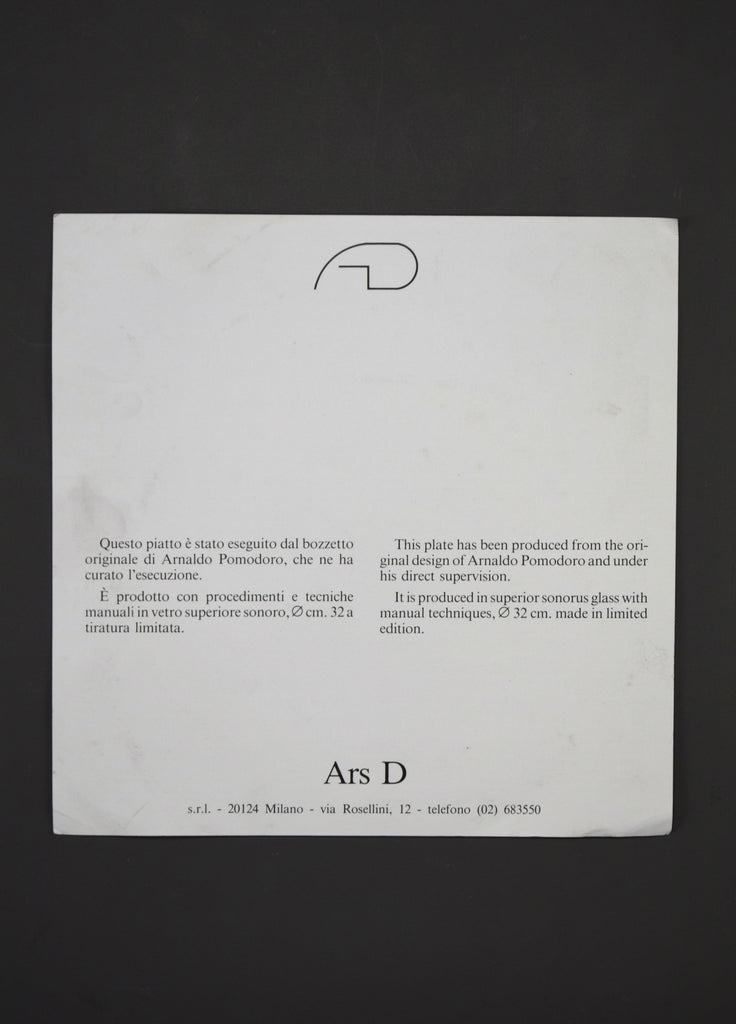 Arnaldo PomodoroThis rare and exquisite limited edition glass plate was designed by the celebrated Italian artist Arnaldo Pomodoro and produced by Ars D Milano. The piece, with a diameter of 32 cm, is crafted from superior sonorous glass using meticulous manual techniques under Pomodoro’s direct supervision. Its intricate design reflects his signature abstract and geometric motifs, embodying a dynamic interplay of light and texture.
