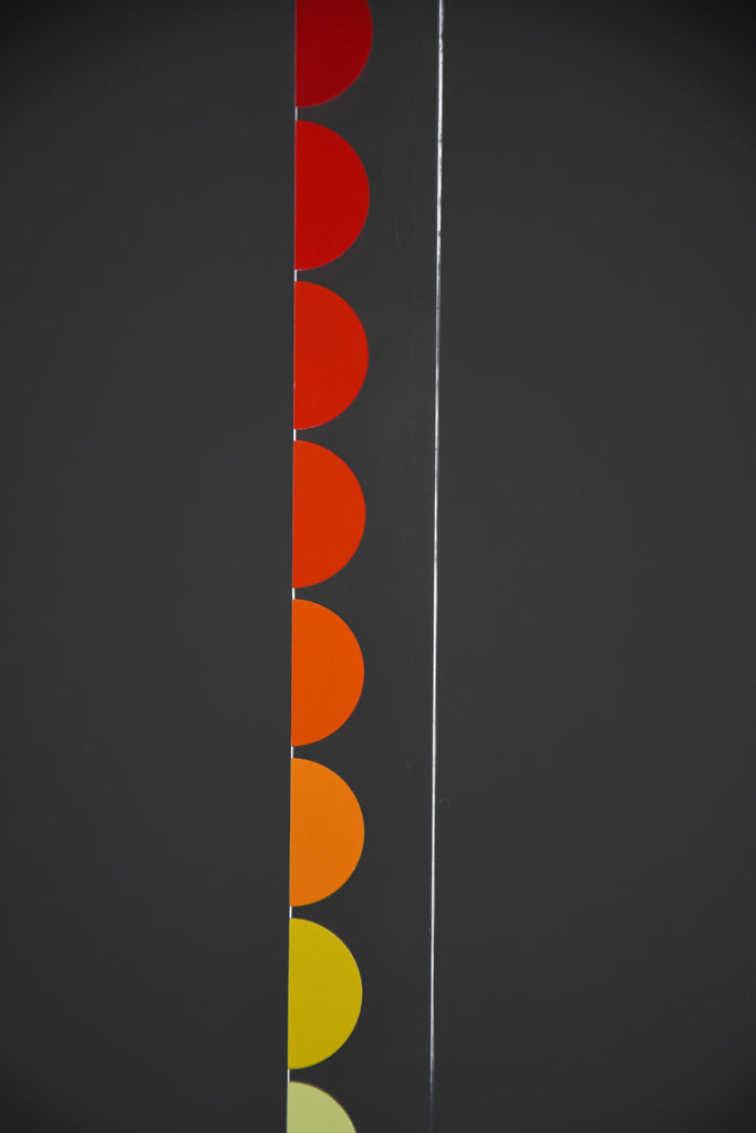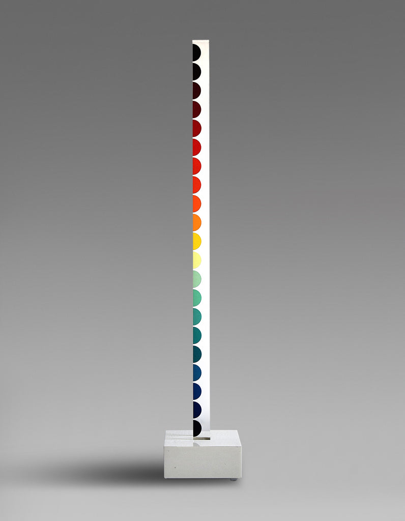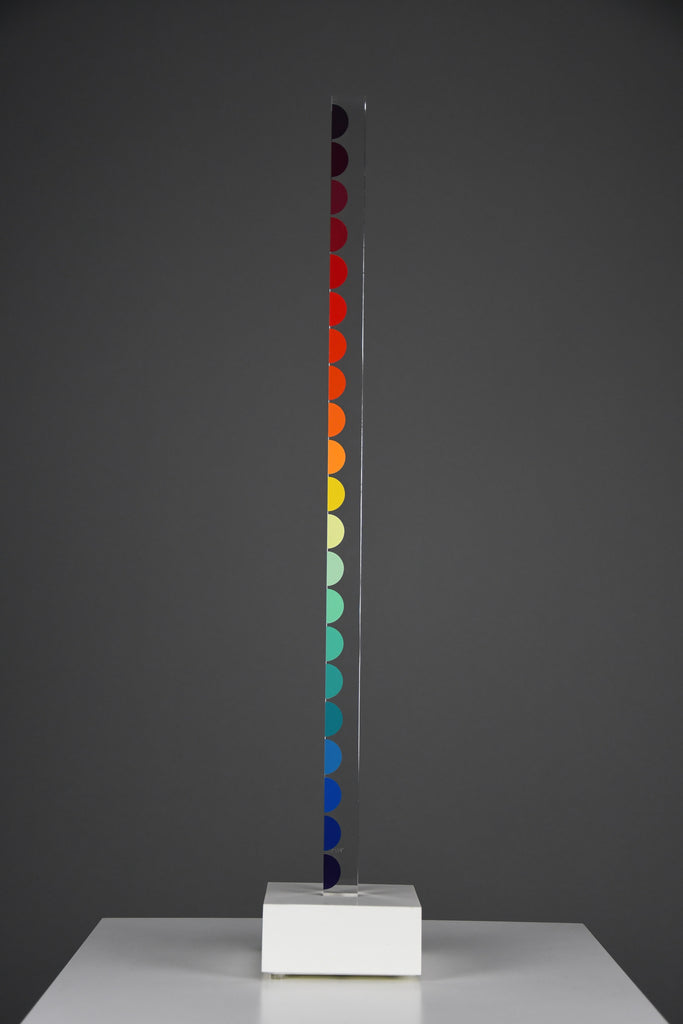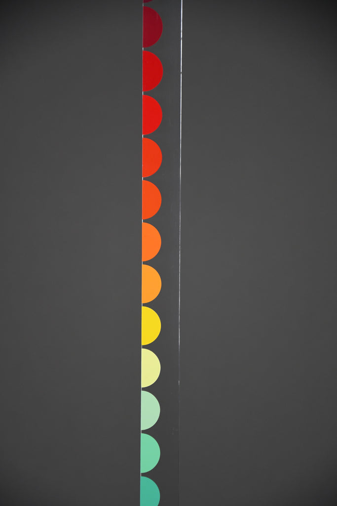 "Image-Magic" stands as a tall, elegant structure composed of vibrant, semi-circular color segments ascending in a rhythmic gradient. The piece is designed to interact with light, creating dynamic reflections and shadows that change with the viewer’s perspective. This transformation of visual experience is central to Agam's philosophy, where art is not static but a constantly evolving entity.