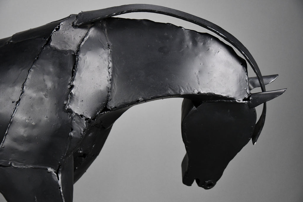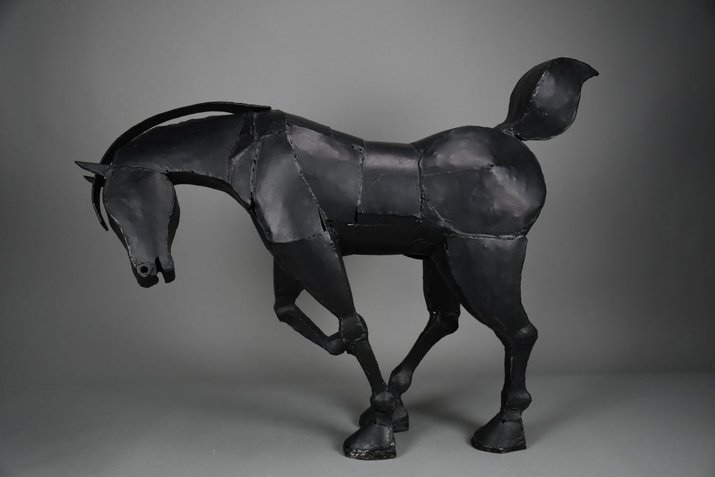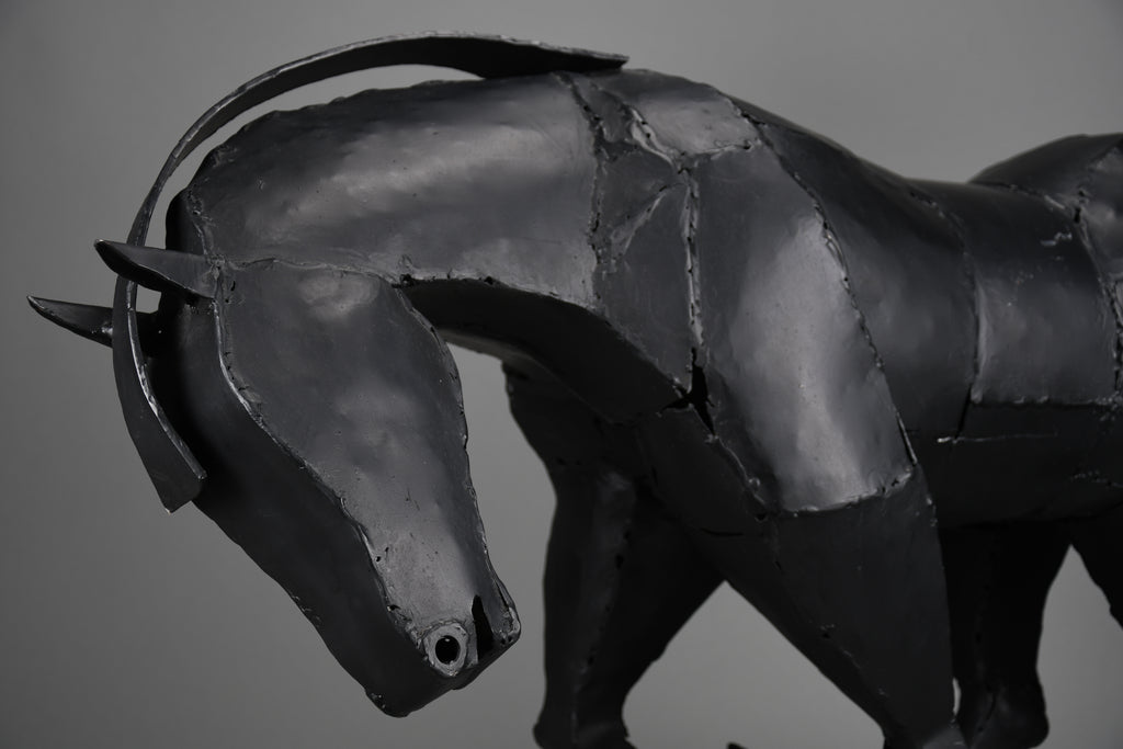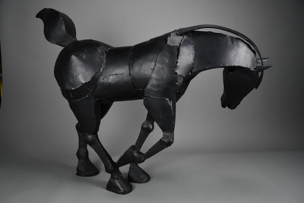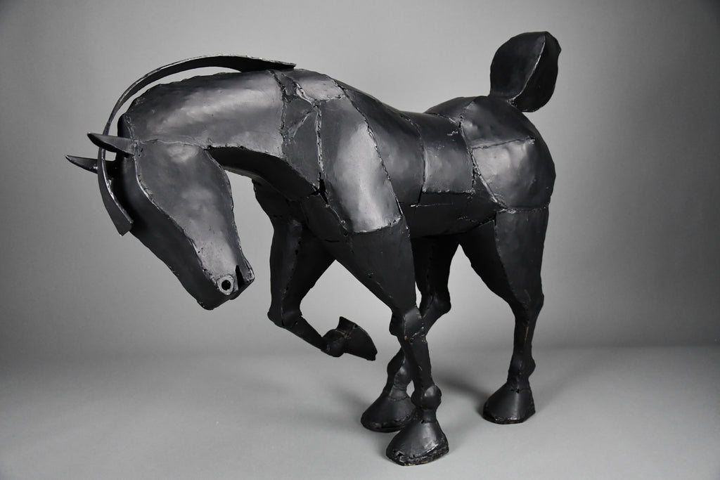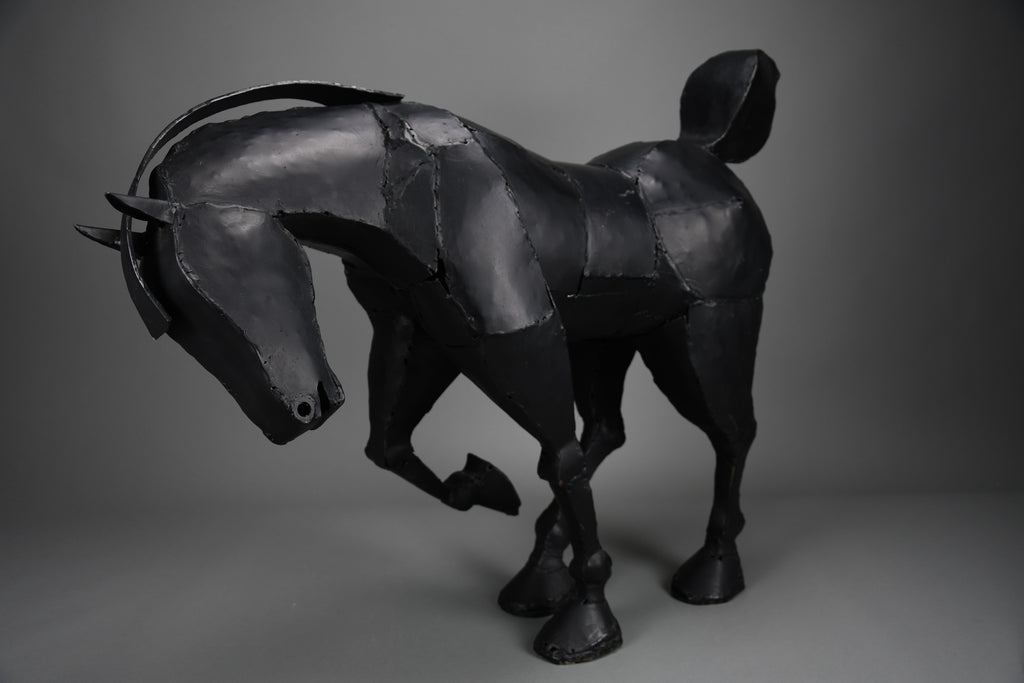 Bold, muscular, and undeniably expressive ā this striking welded iron horse sculpture by Dutch artist Lida Boonstra is a powerful statement piece, handcrafted in 1998. Meticulously assembled from sheet iron, the surface is unified with a matte black finish that enhances the strength and silhouette of the form, while retaining the raw character of the welded seams.