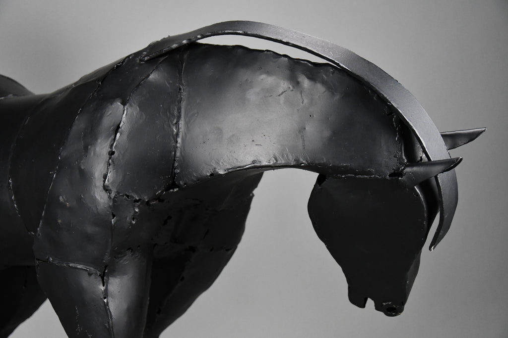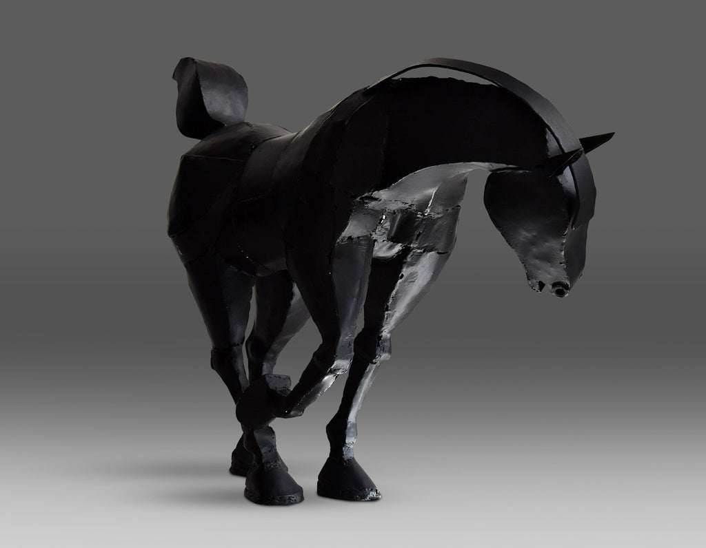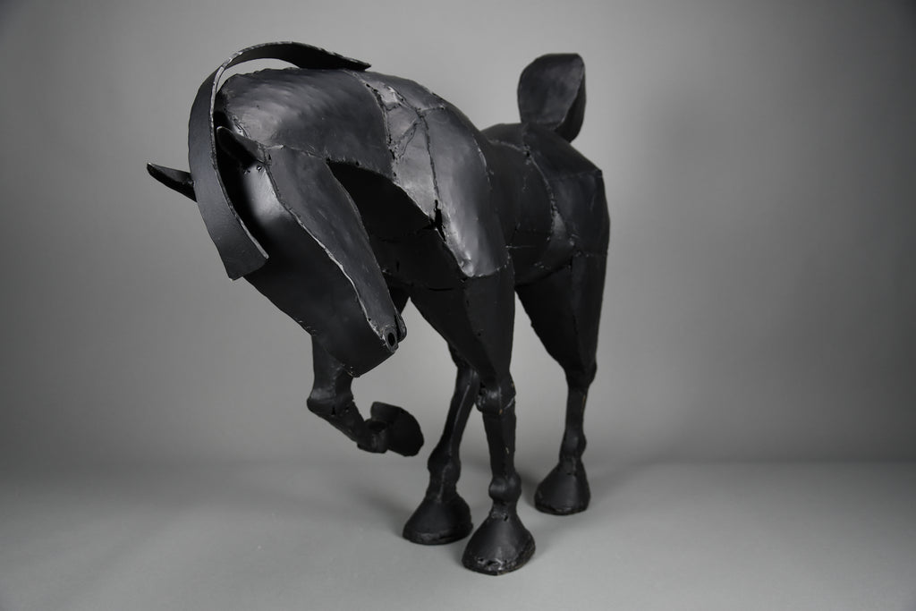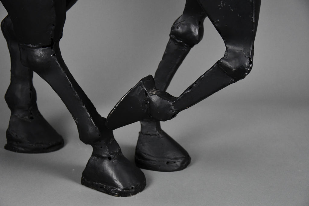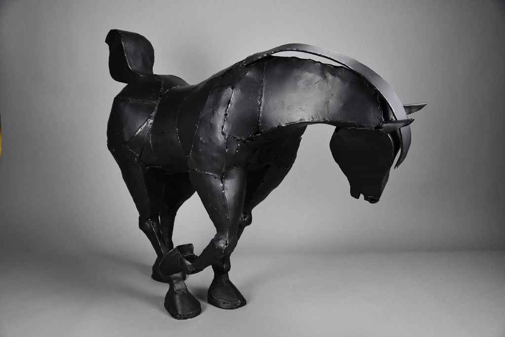 Bold, muscular, and undeniably expressive ā this striking welded iron horse sculpture by Dutch artist Lida Boonstra is a powerful statement piece, handcrafted in 1998. Meticulously assembled from sheet iron, the surface is unified with a matte black finish that enhances the strength and silhouette of the form, while retaining the raw character of the welded seams.