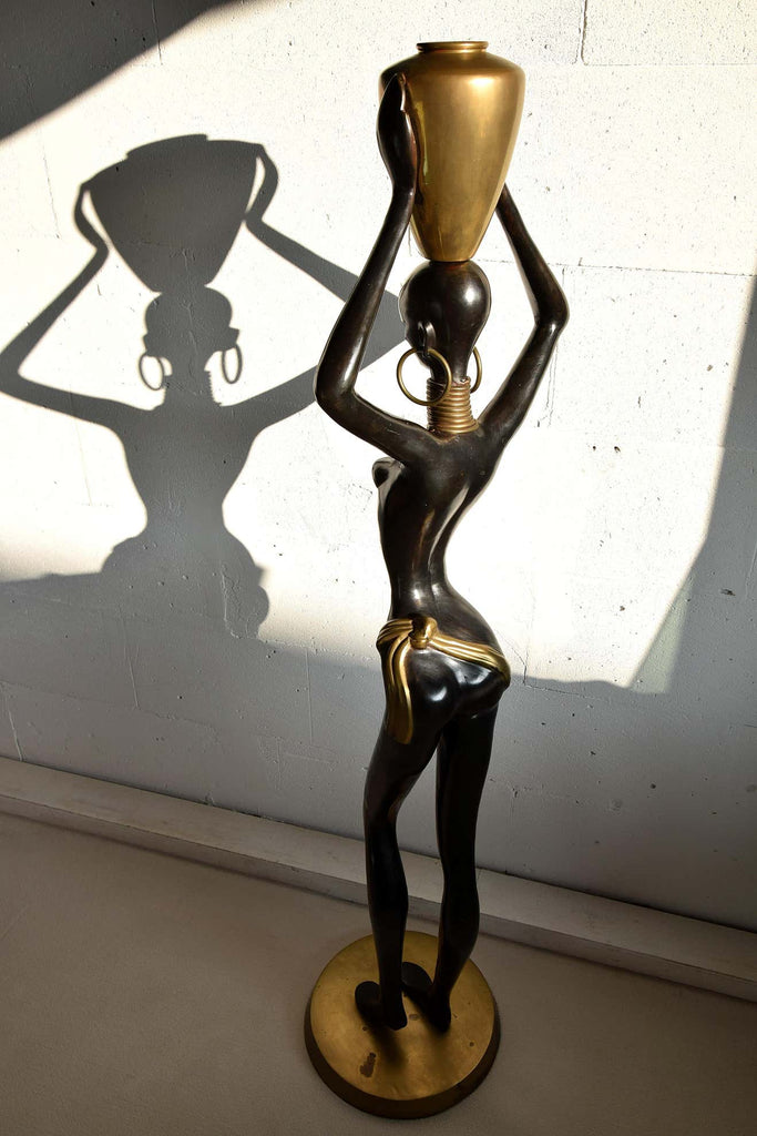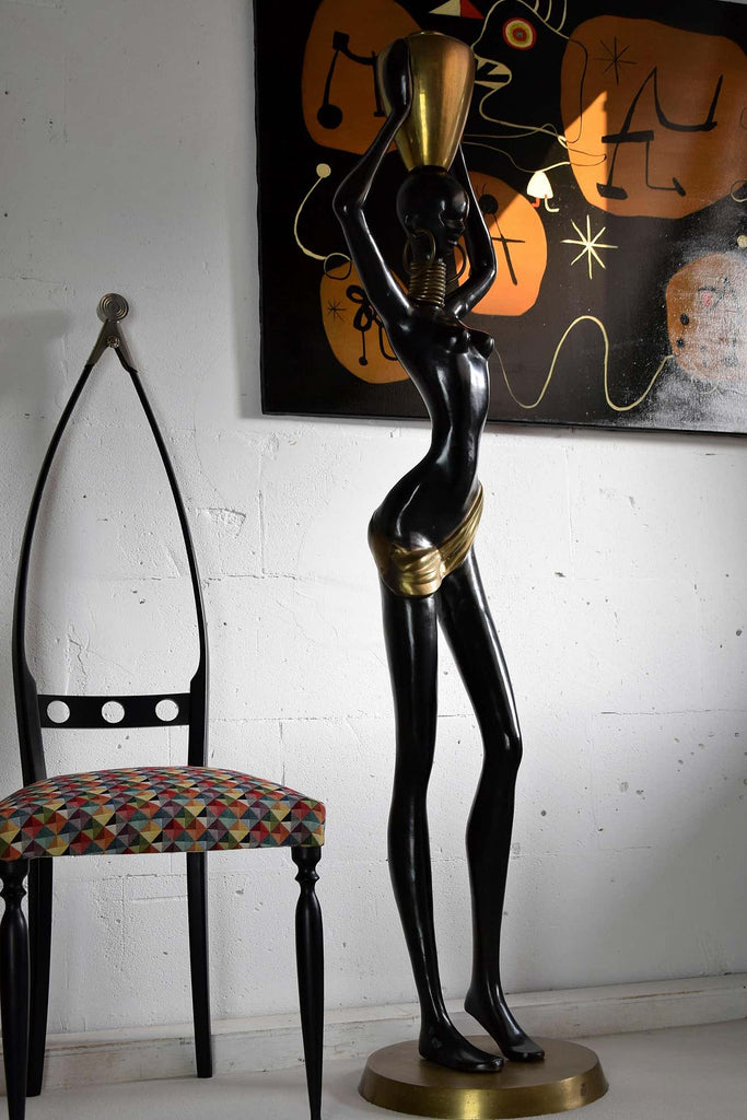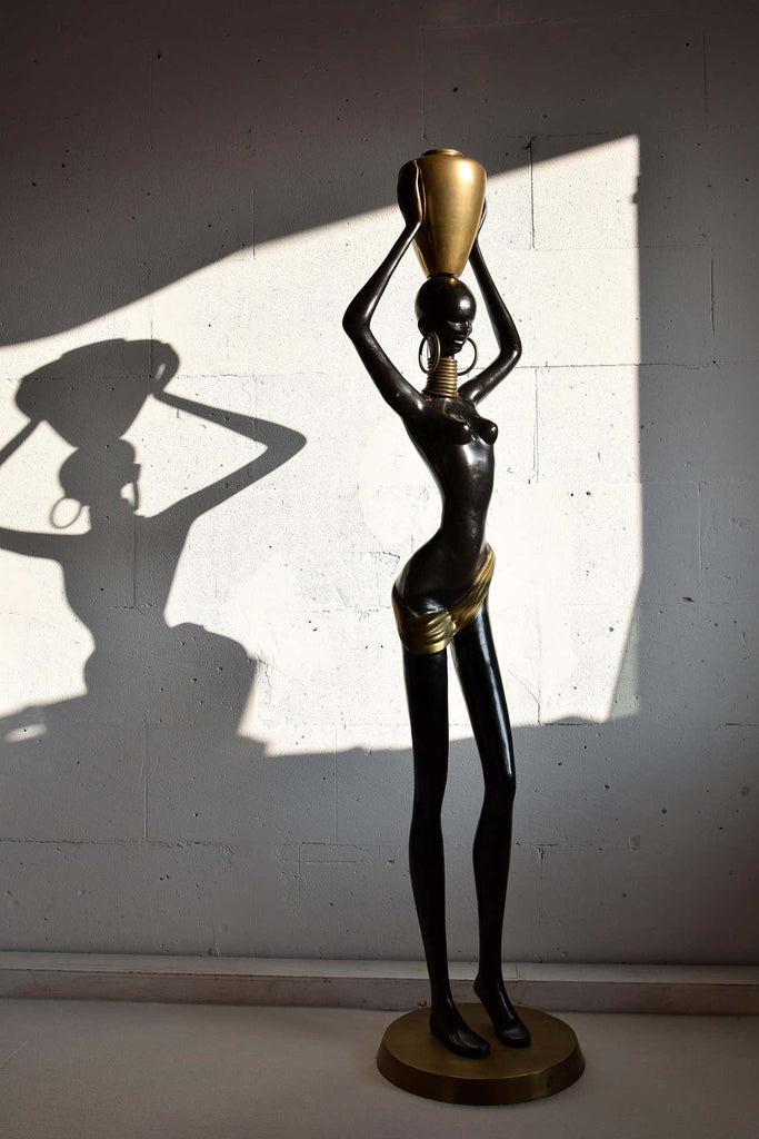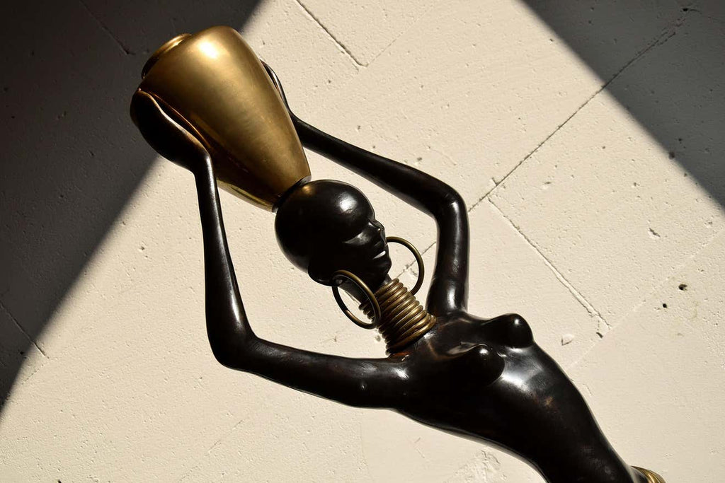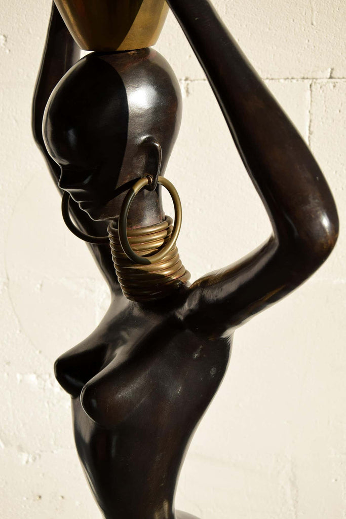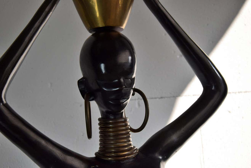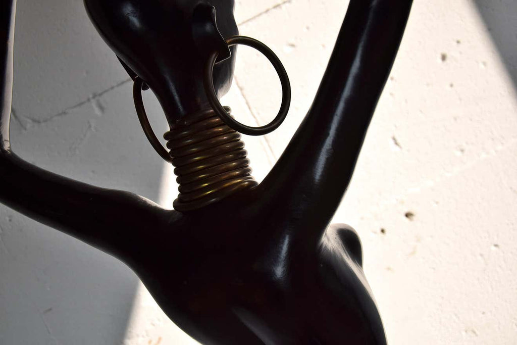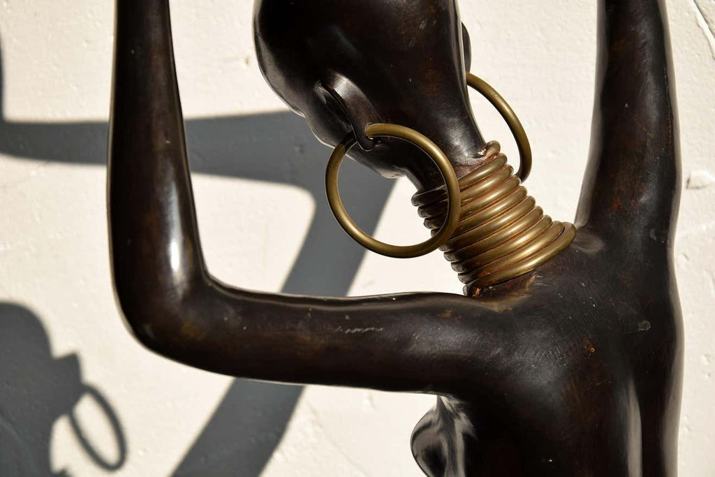 Vintage ObjectsBeautiful, elegant and stylish. Bronze with black and golden patina, gilded brass. African Mid-Century Modern life size beauty. Made after the African neck stretching tribe known as "Long Neck tribe". This originated from the Ndebele tribe group.. The women wore brass and copper rings, iindzila, around their necks after they got married around the age of 12. Once the young women were married, these neck rings were placed individually to provide intense spiritual power and to show the tribal wealth. It also became one of the ways that bonding between married couples was displayed and the rings could only be removed upon her husbands death.