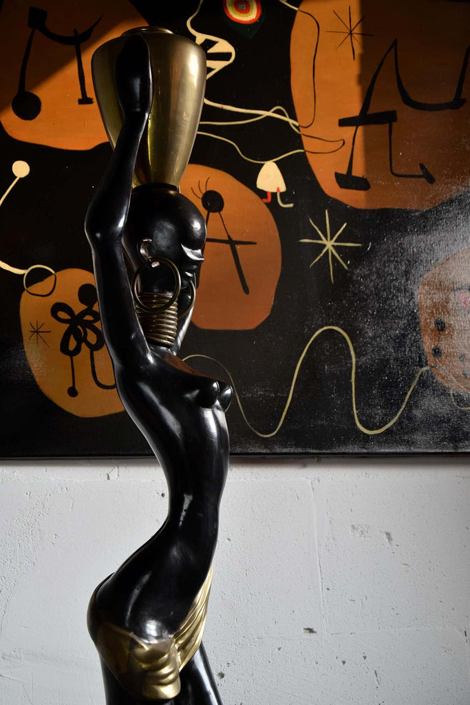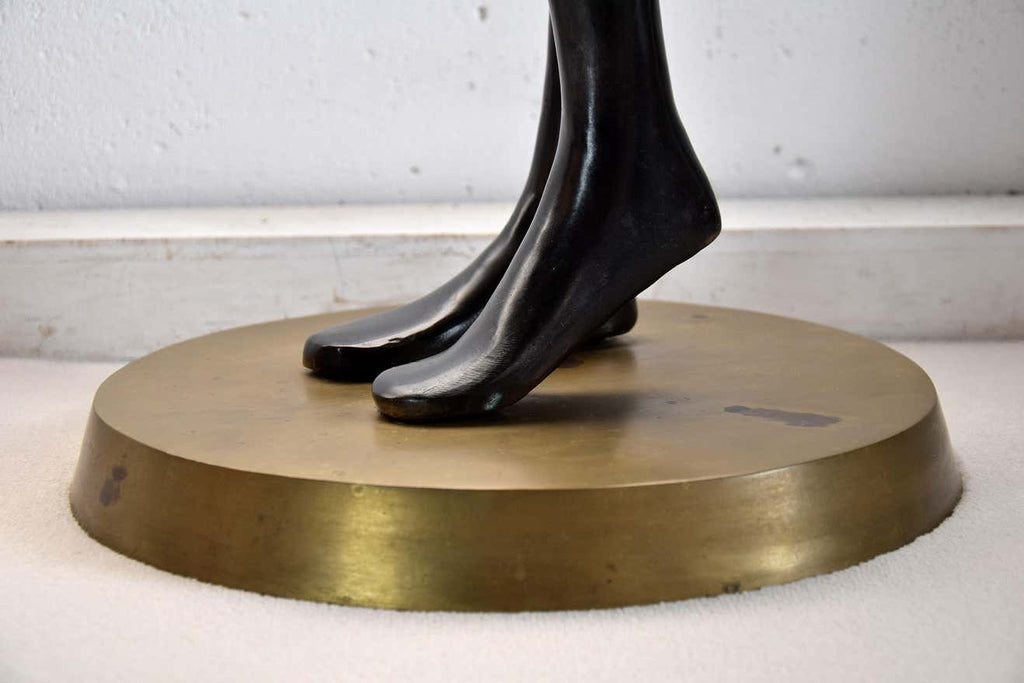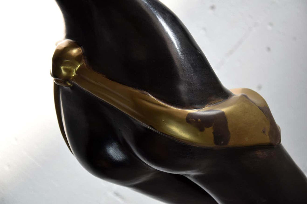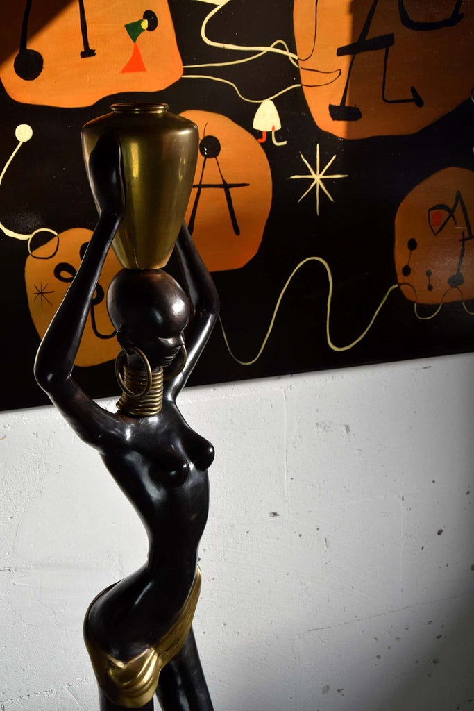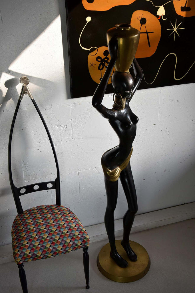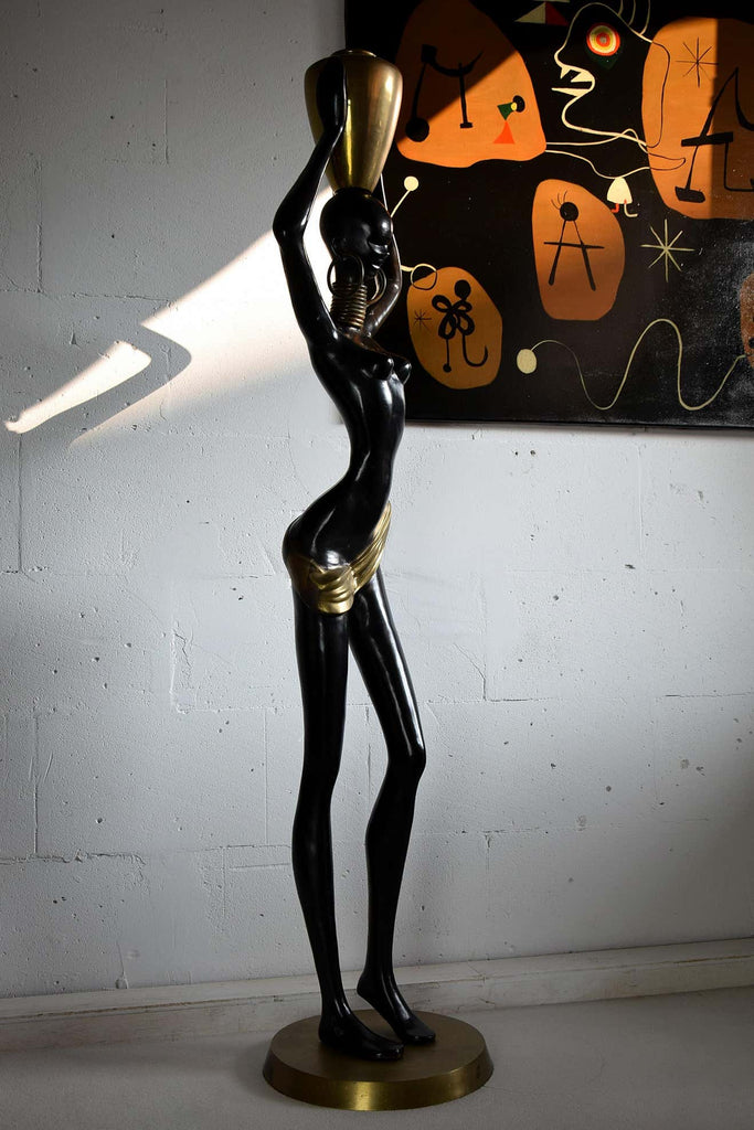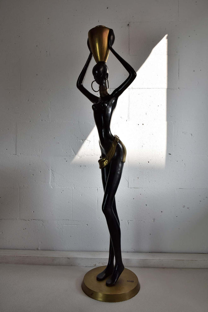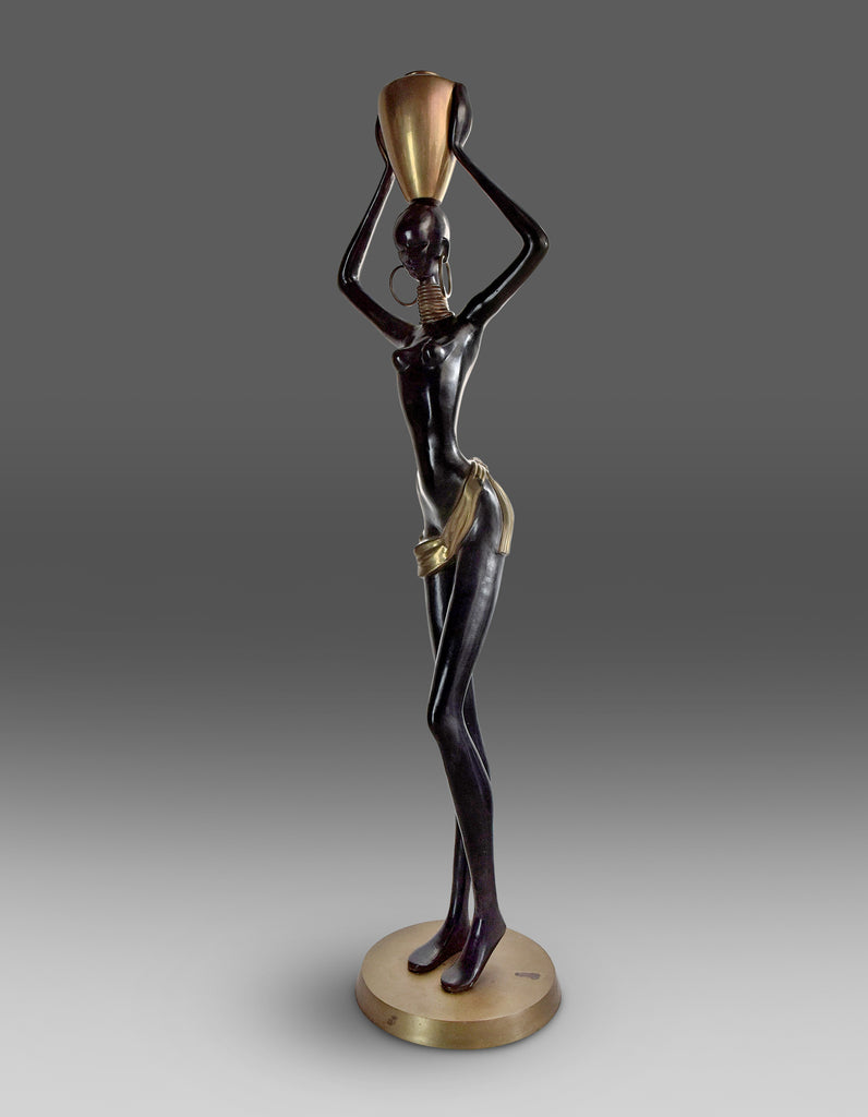 Vintage ObjectsBeautiful, elegant and stylish. Bronze with black and golden patina, gilded brass. African Mid-Century Modern life size beauty. Made after the African neck stretching tribe known as "Long Neck tribe". This originated from the Ndebele tribe group.. The women wore brass and copper rings, iindzila, around their necks after they got married around the age of 12. Once the young women were married, these neck rings were placed individually to provide intense spiritual power and to show the tribal wealth. It also became one of the ways that bonding between married couples was displayed and the rings could only be removed upon her husbands death.
