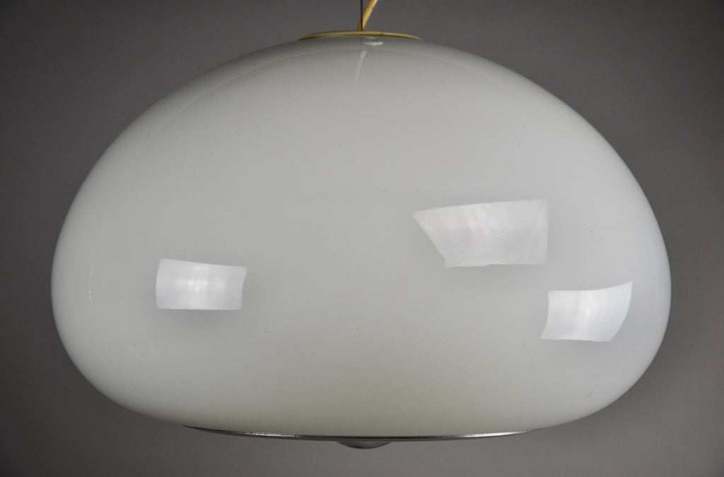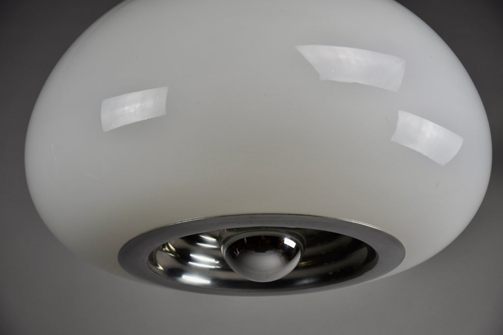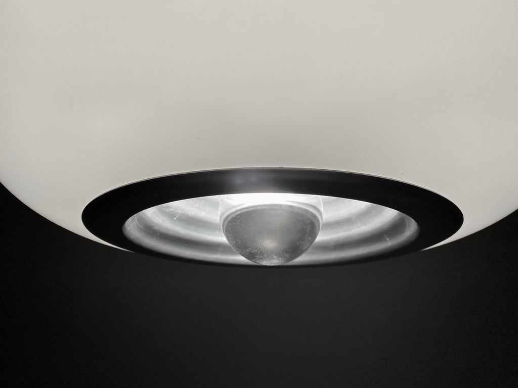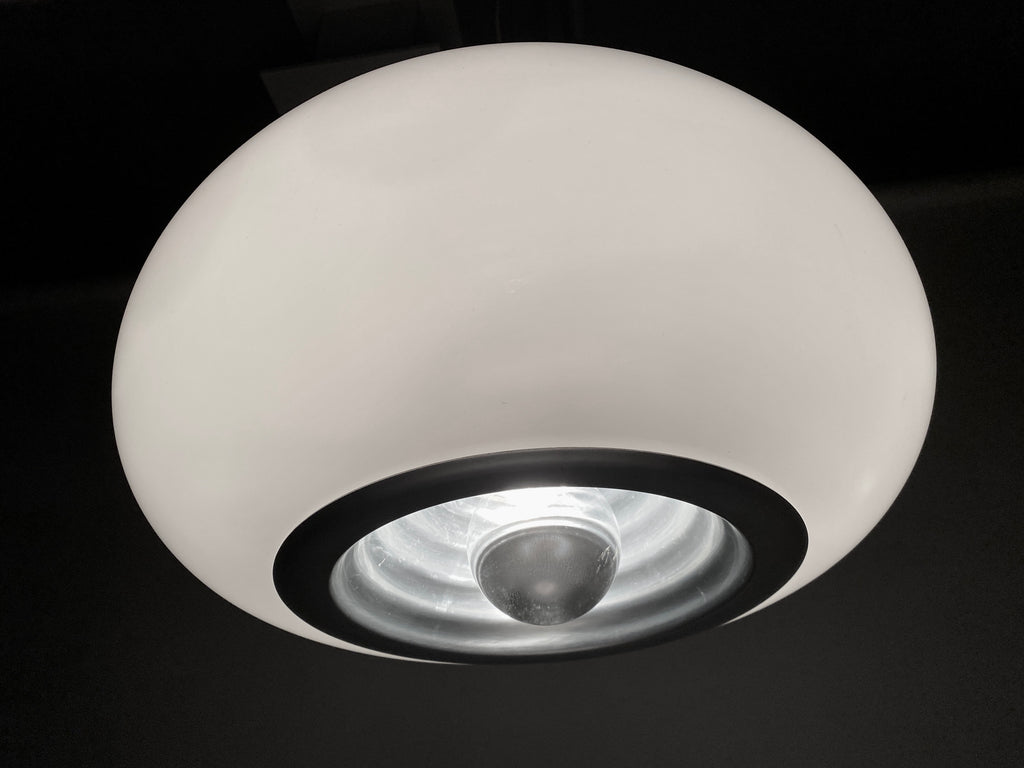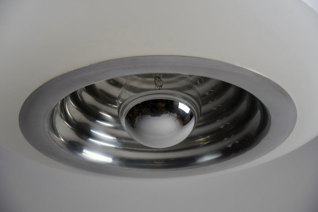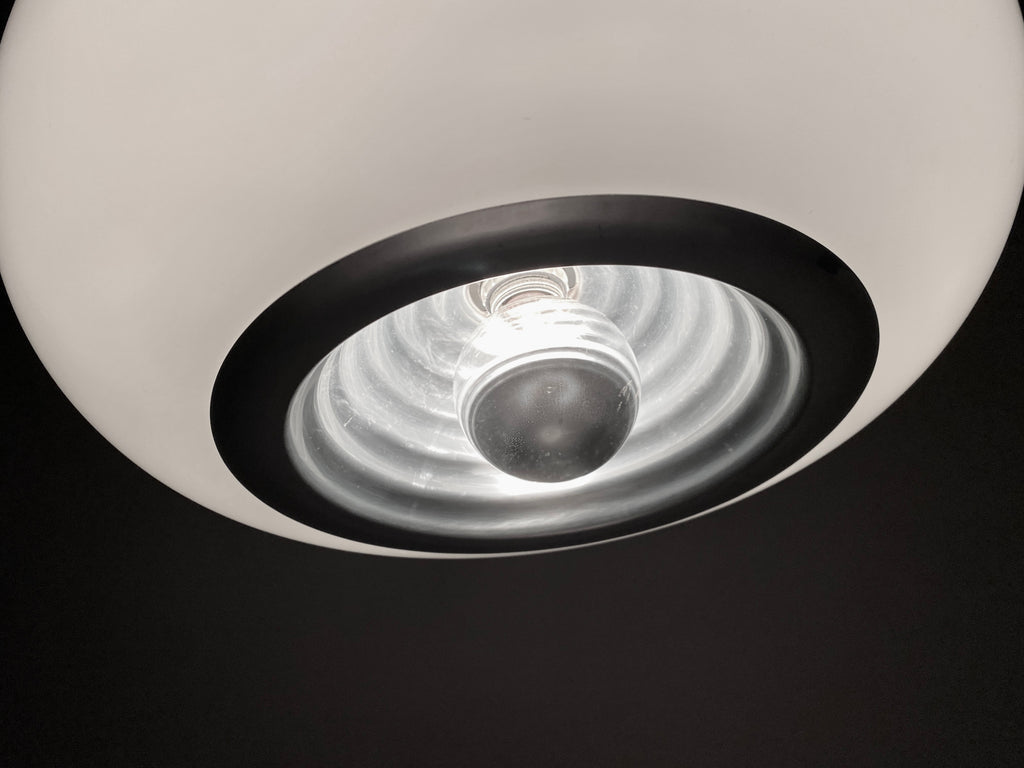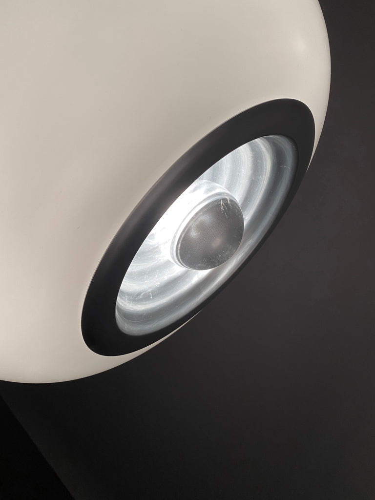 This masterpiece of lighting design, created in 1965, continues to captivate with its minimalist yet striking aesthetic. Crafted with meticulous attention to detail, the "Black & White" pendant lamp is made of an opal glass bowl for diffused light and is equipped with an aluminum reflector fitted to the base, complemented by a silver domed reflector bulb for concentrated light.