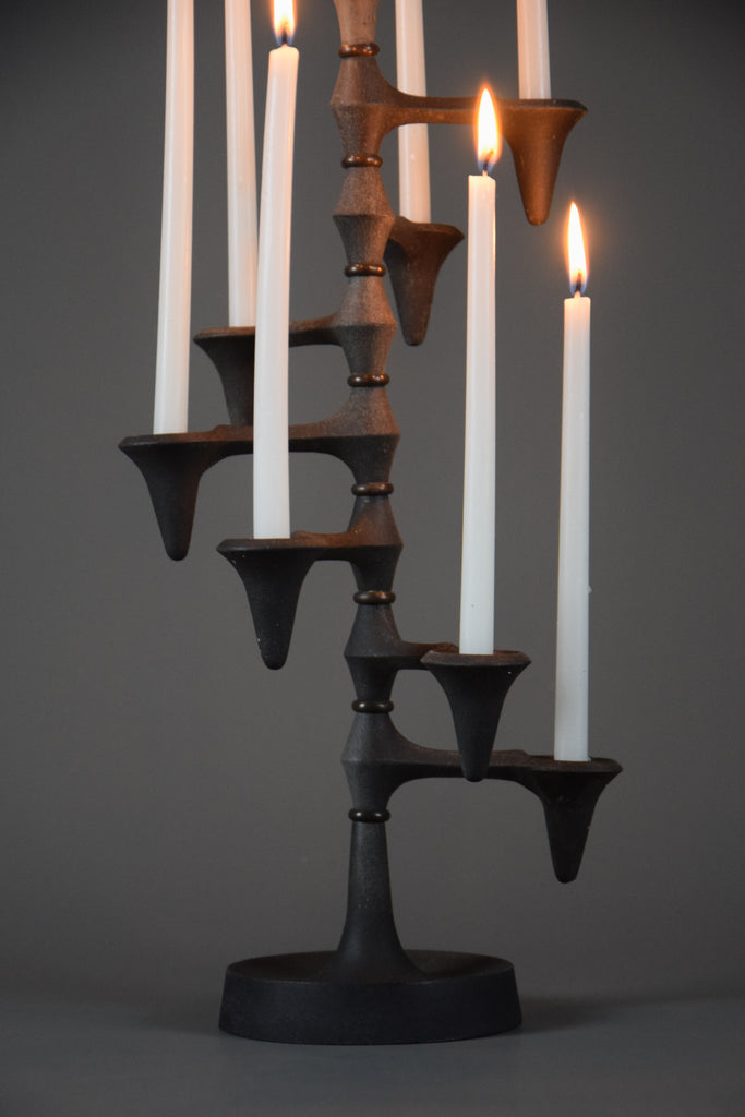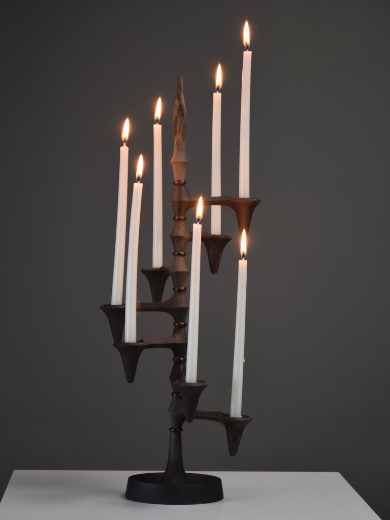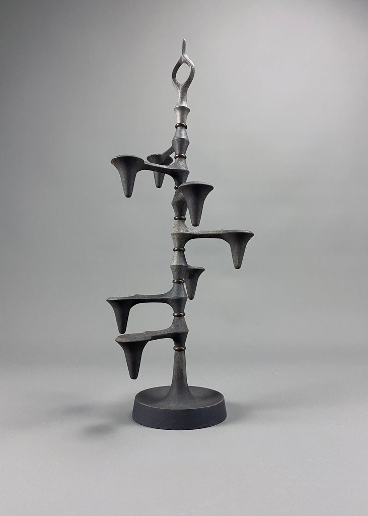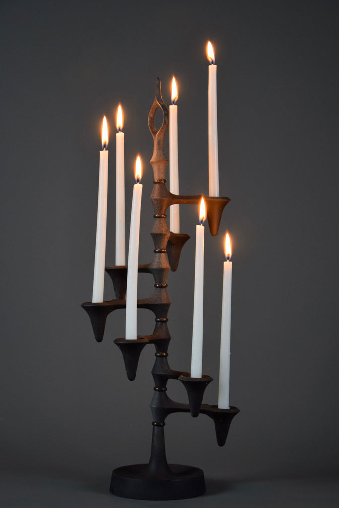 Jens QuistgaardStep into the timeless elegance of mid-century design with this exquisite 1960s Wrought Iron Tabletop Candleholder, designed by the legendary Jens Quistgaard for Dansk Designs, Denmark. This sculptural masterpiece boasts seven swivel arms, each adjustable to create your own unique lighting arrangement, perfect for setting a cozy, warm ambiance in any space. Crafted with meticulous attention to detail, the candleholder is marked on the bottom with Dansk Design Made in Denmark, a testament to its authenticity and quality.