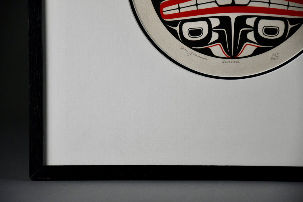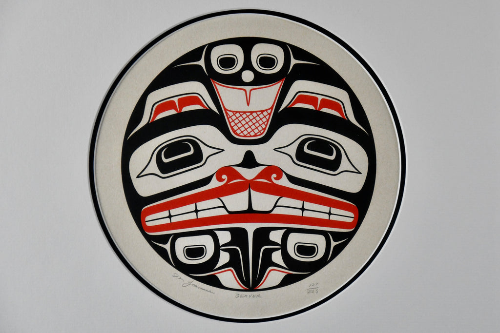 The print is signed in pencil by the artist, titled and numbered 127/225, as shown in the detailed photo. The image centers on the beaver, a significant figure in Haida cosmology symbolizing industriousness, resourcefulness, and transformation.