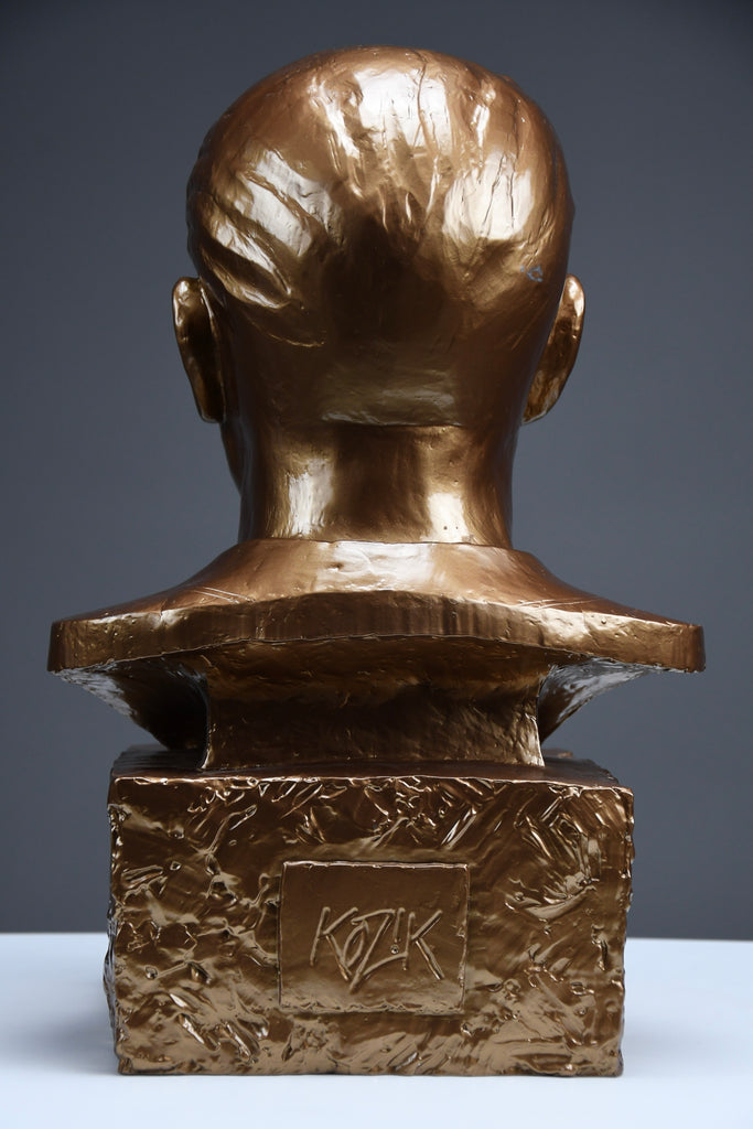 The bust is a powerful example of Kozik’s bold aesthetic and cultural commentary.