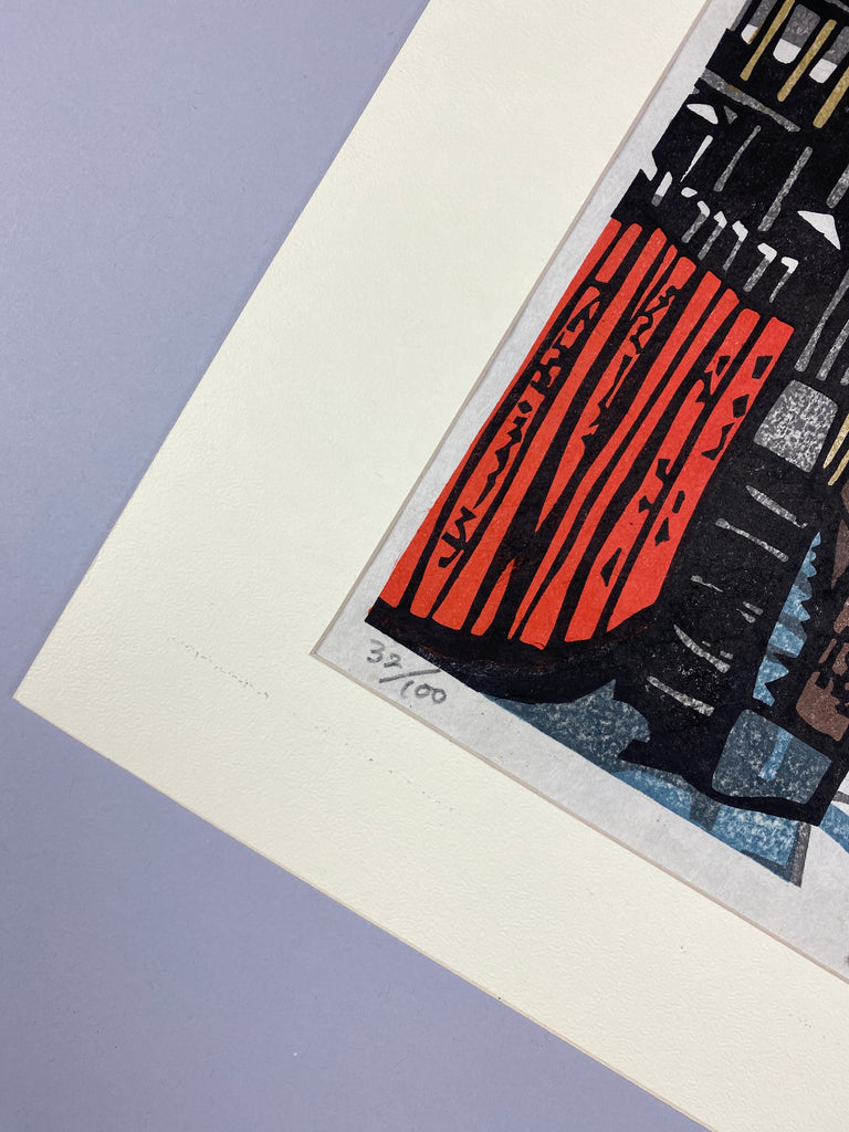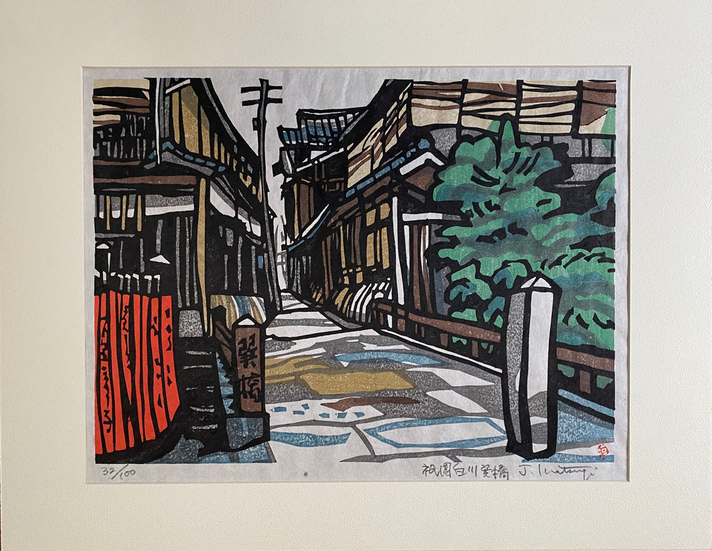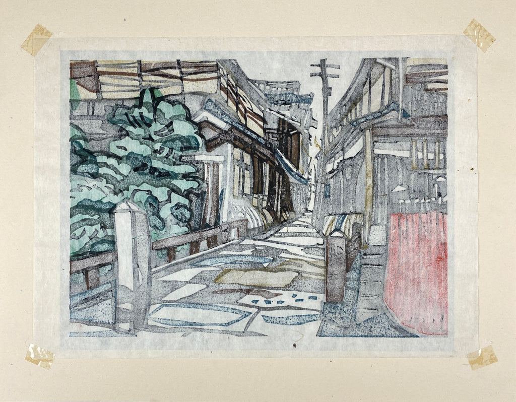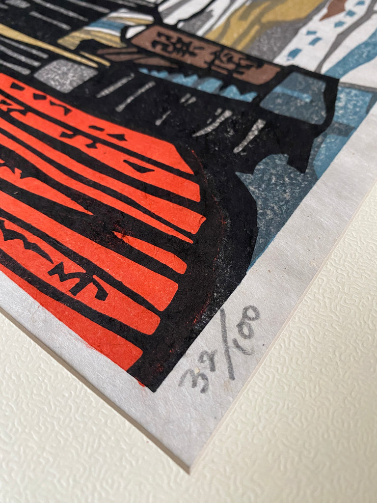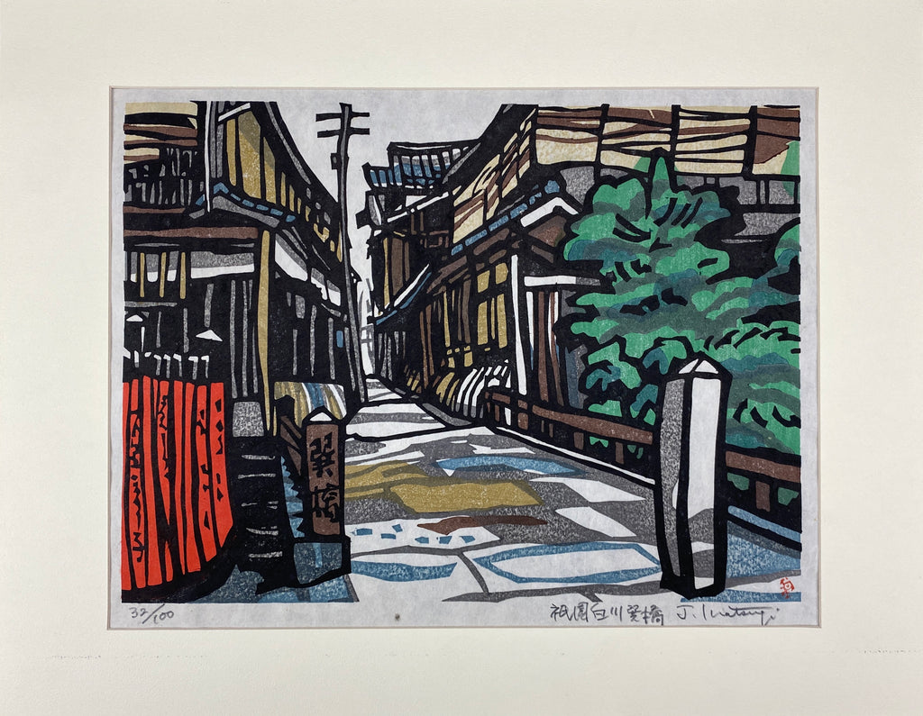 About the ArtistJunzo Inatsugi (1917–1996) was a respected woodblock print artist active in the mid-20th century. Although less internationally known than some of his contemporaries, Inatsugi is admired in Japan for his highly stylized, architectural views of traditional Japanese streets and landmarks. His work bridges the classical shin-hanga tradition and a more modern, expressive style—emphasizing bold composition, color contrast, and an almost cinematic sense of place.