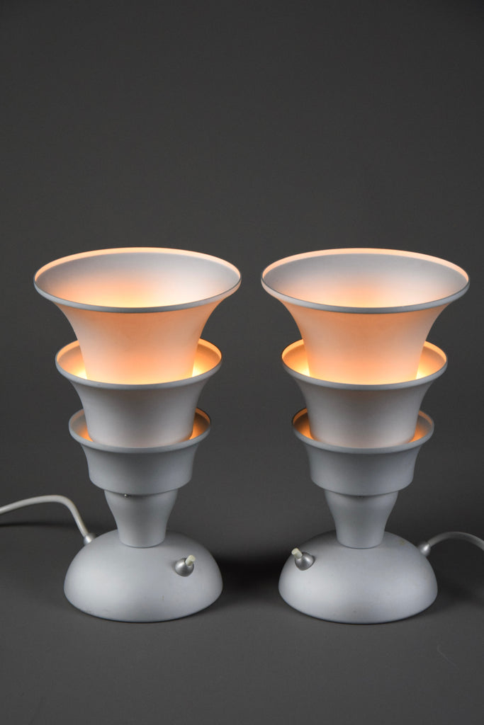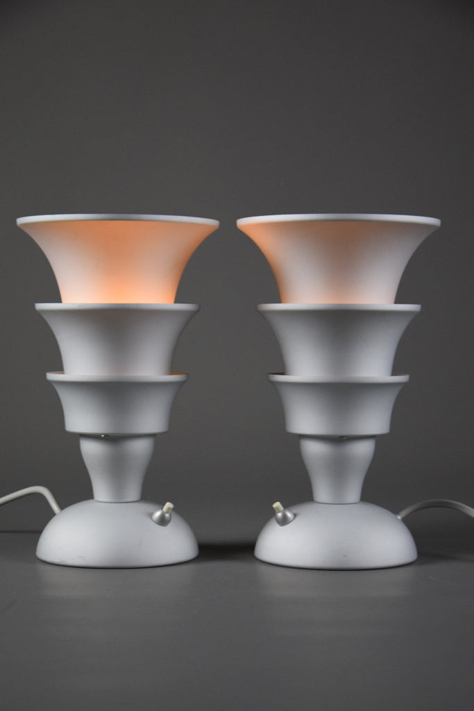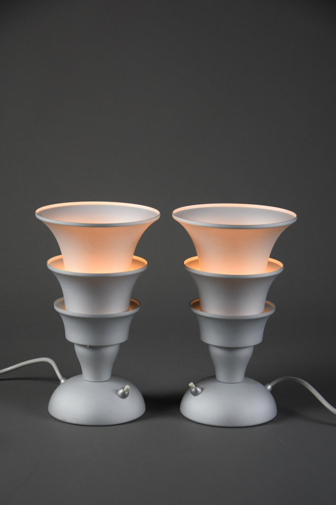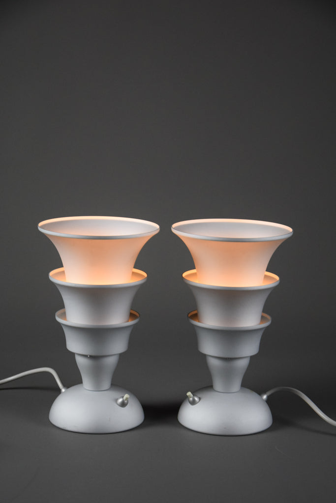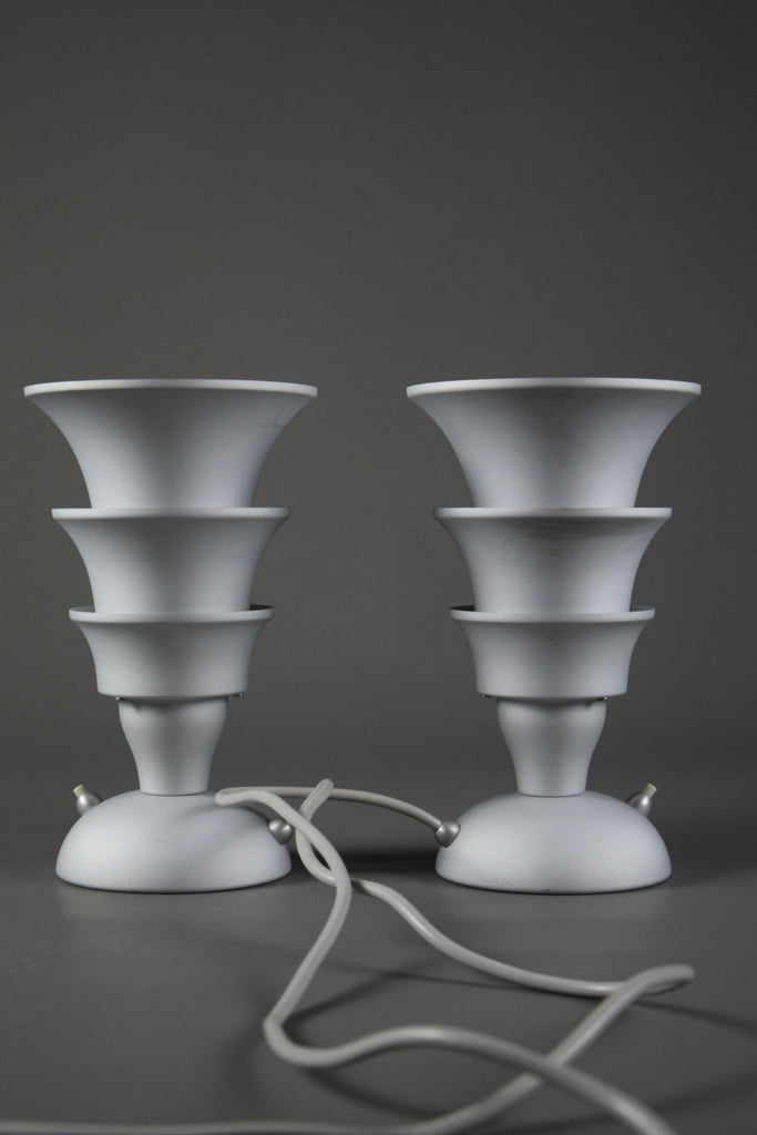 Discover the allure of vintage sophistication with this exquisite pair of 1989 Hollywood table or bedside lamps, masterfully designed by the renowned Matteo Thun for the prestigious Italian lighting brand, Tronconi. These lamps, crafted from high-quality aluminum, capture the essence of classic Hollywood glamour, with a contemporary twist that makes them a perfect fit for any modern or vintage-inspired interior.