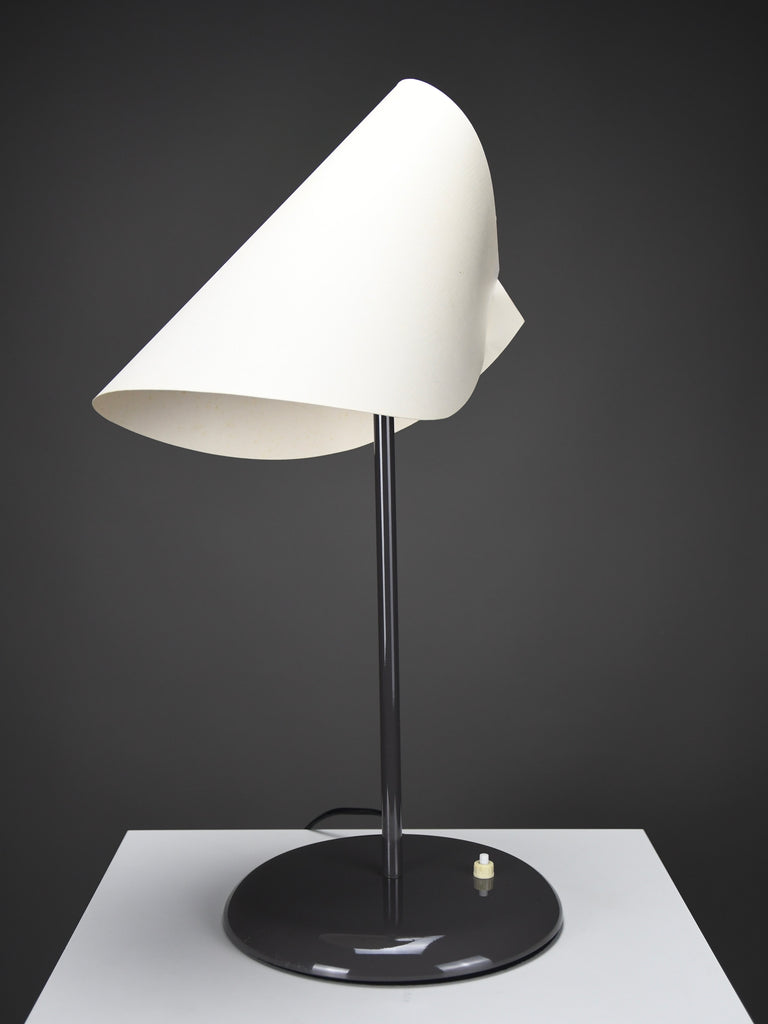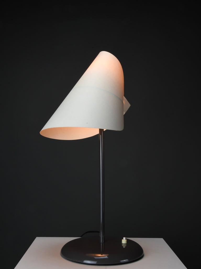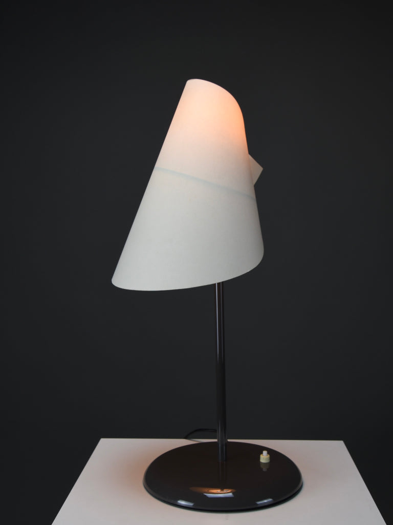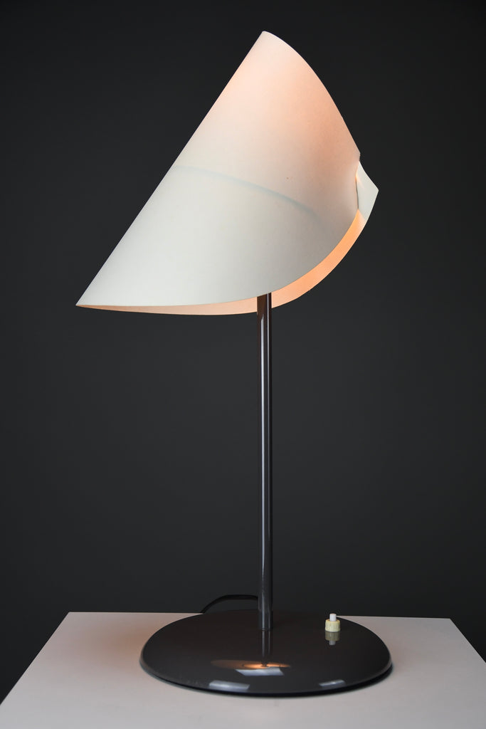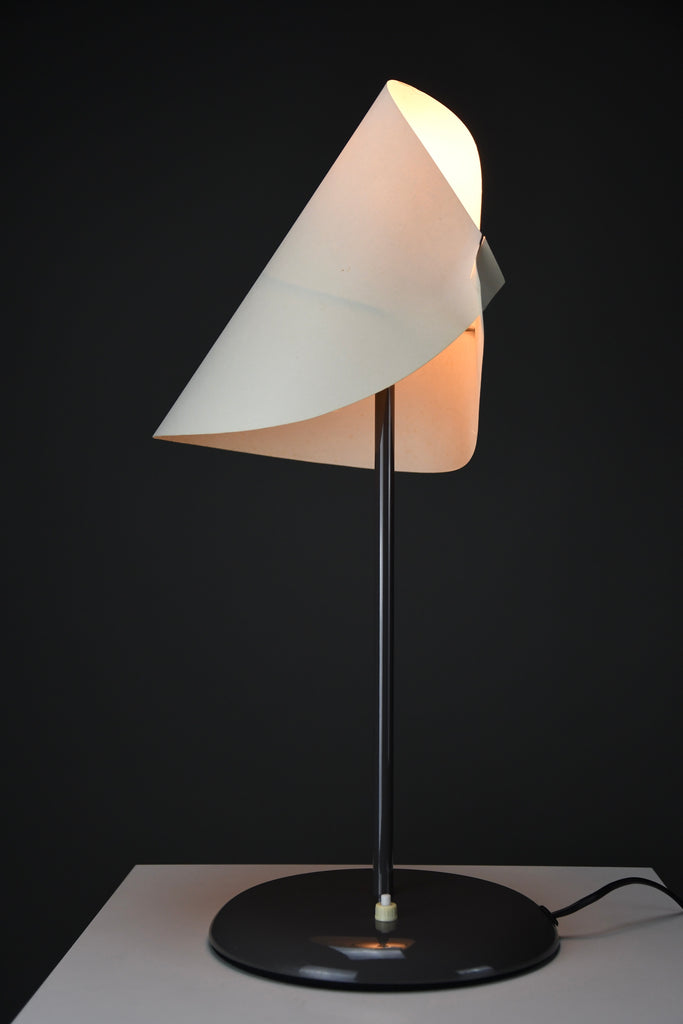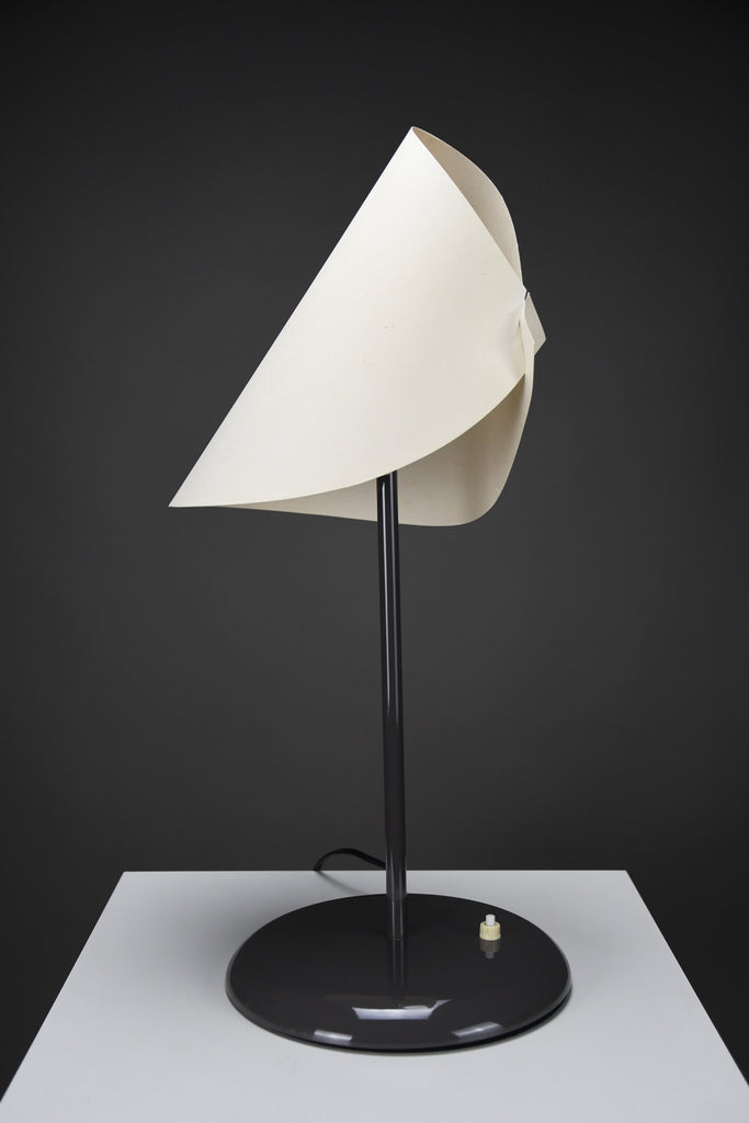 Step into a world where art and function fuse seamlessly. The “La Lune Sous Le Chapeau” (“Moon Under the Hat”) table lamp is a rare, new‑old‑stock treasure from the 1980s, exquisitely crafted by Sirrah Italy. Its sculptural silhouette—an ethereal, folded lampshade gently hovering above a slender, graphite‑grey stem—casts a soft, lunar glow that transforms any tabletop into a stage for dreams and conversation.