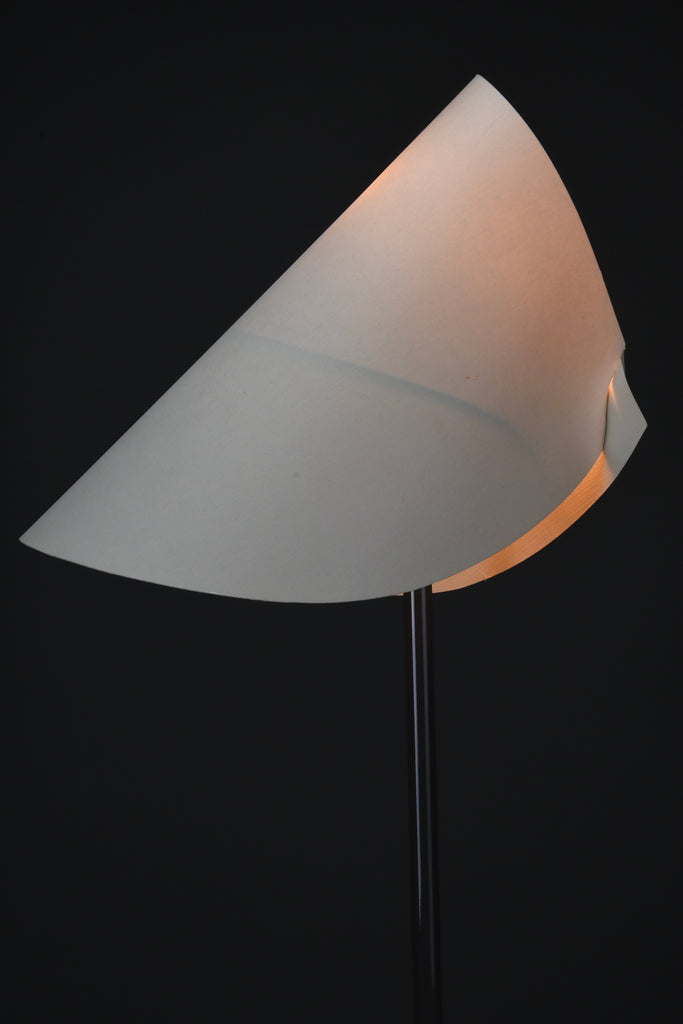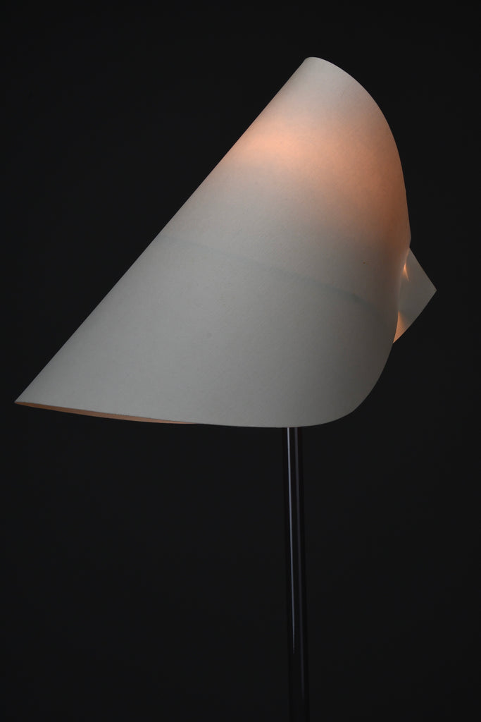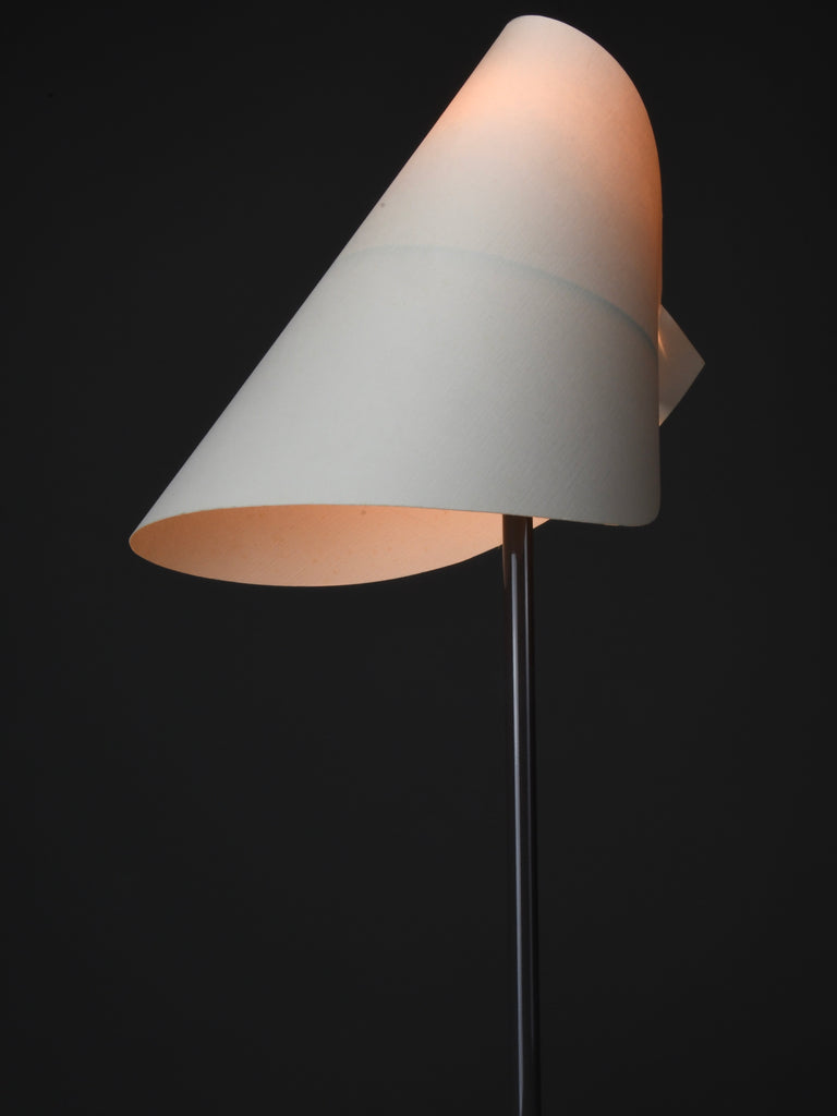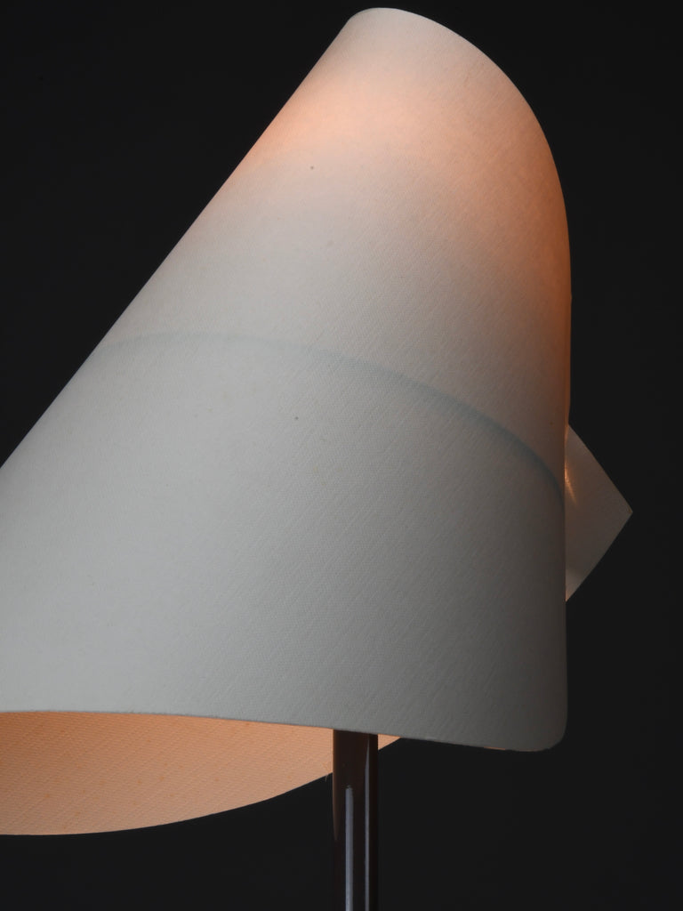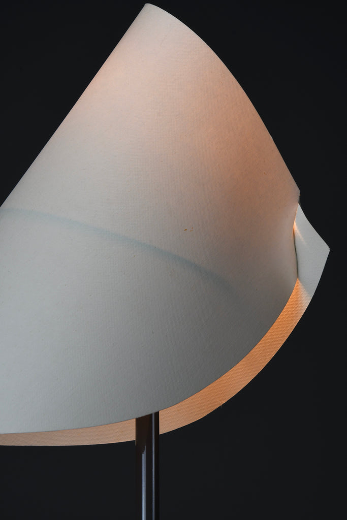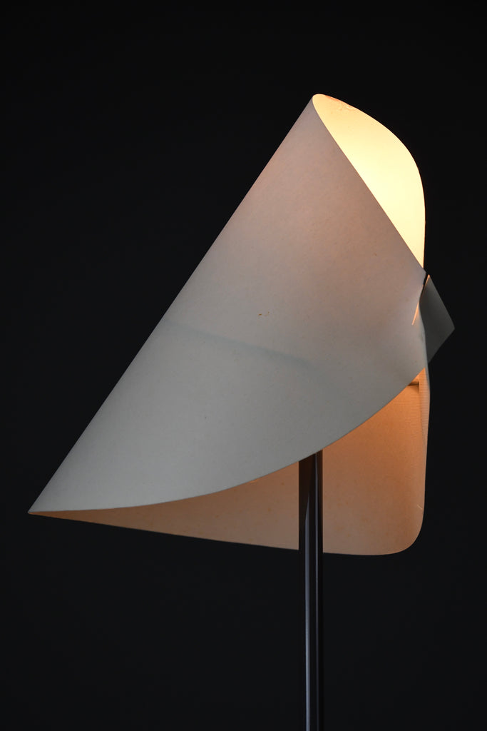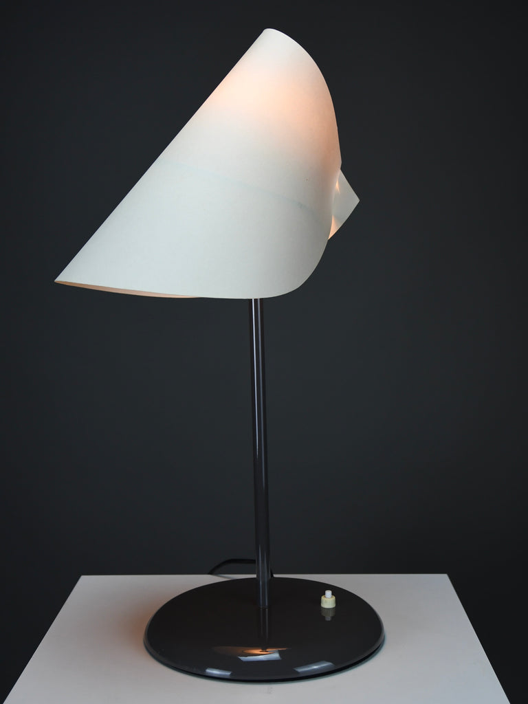 Step into a world where art and function fuse seamlessly. The “La Lune Sous Le Chapeau” (“Moon Under the Hat”) table lamp is a rare, new‑old‑stock treasure from the 1980s, exquisitely crafted by Sirrah Italy. Its sculptural silhouette—an ethereal, folded lampshade gently hovering above a slender, graphite‑grey stem—casts a soft, lunar glow that transforms any tabletop into a stage for dreams and conversation.