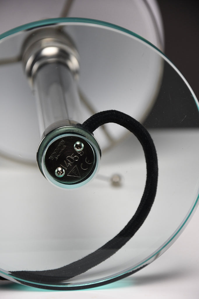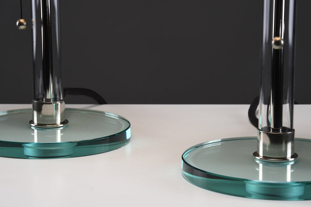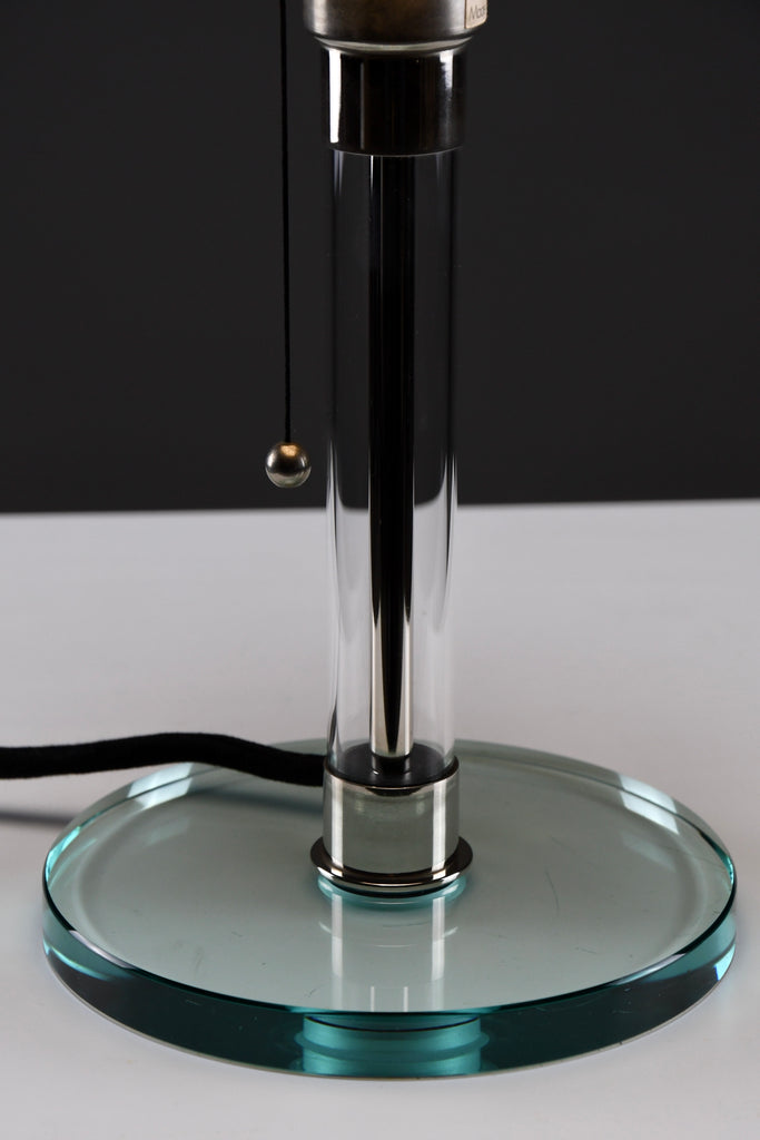 Each lamp features a beautifully proportioned milk glass dome shade, paired with a clear glass tube stem and a solid glass disc base, accentuated with nickel-plated hardware. The harmony between glass and metal reflects Wagenfeldās vision of āindustrial aestheticsā made accessible to modern interiors.