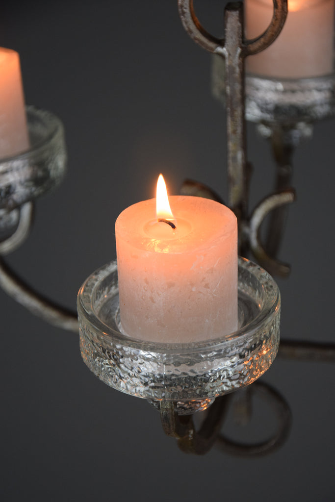 The durable wrought iron frame adds a touch of industrial sophistication, while the sleek glass candle holders provide a delicate contrast, capturing and reflecting warm candlelight beautifully. Ideal for creating an intimate ambiance, this chandelier is perfect for dining areas, living spaces, or even cozy patios.