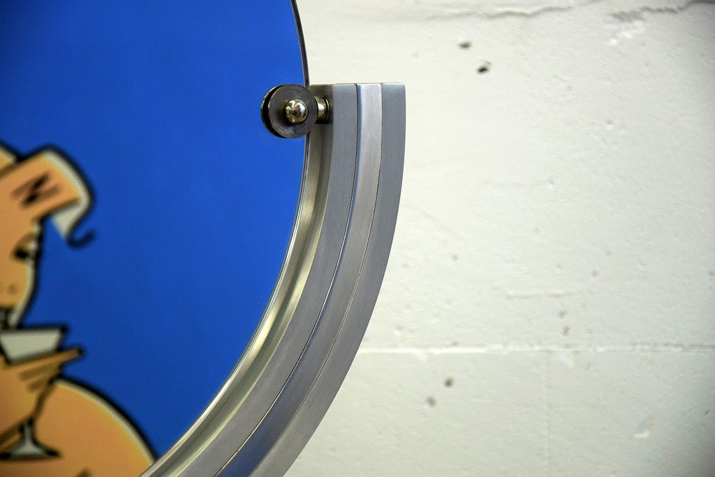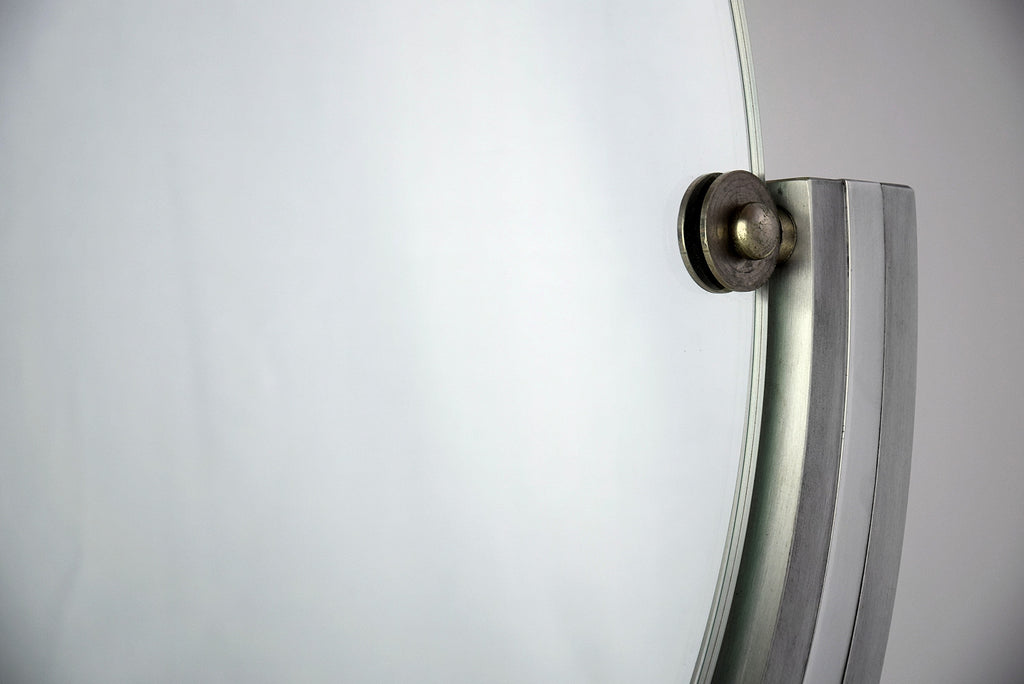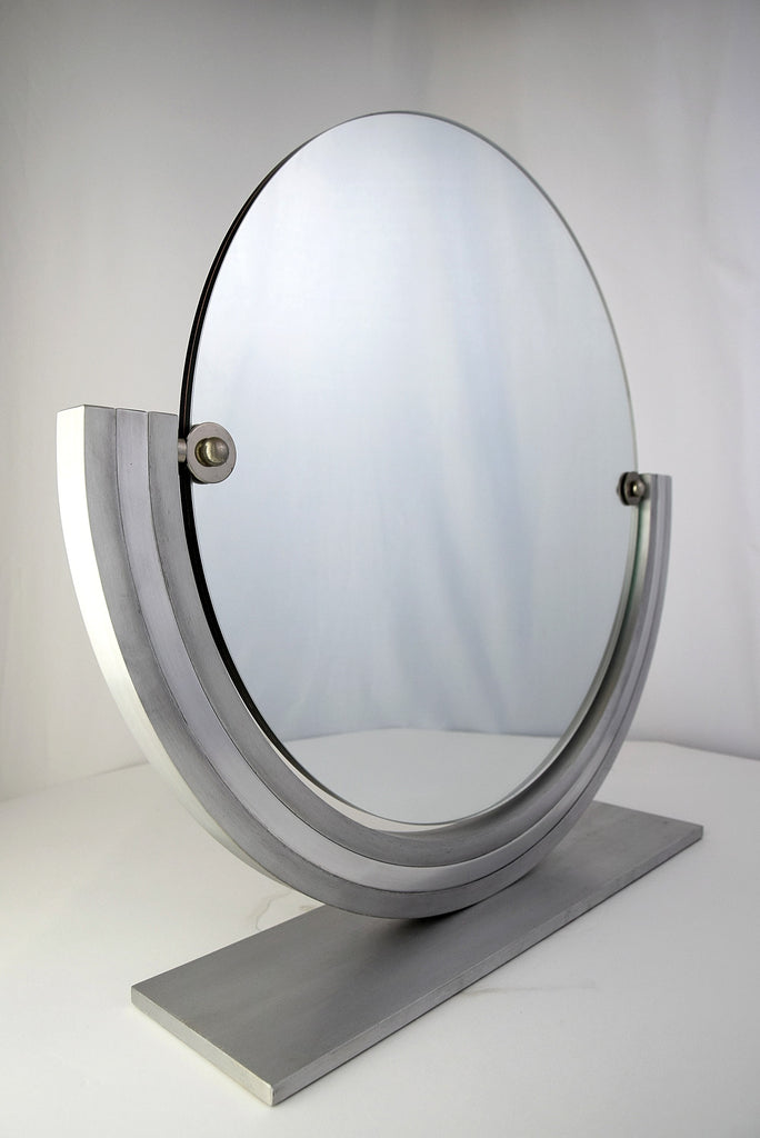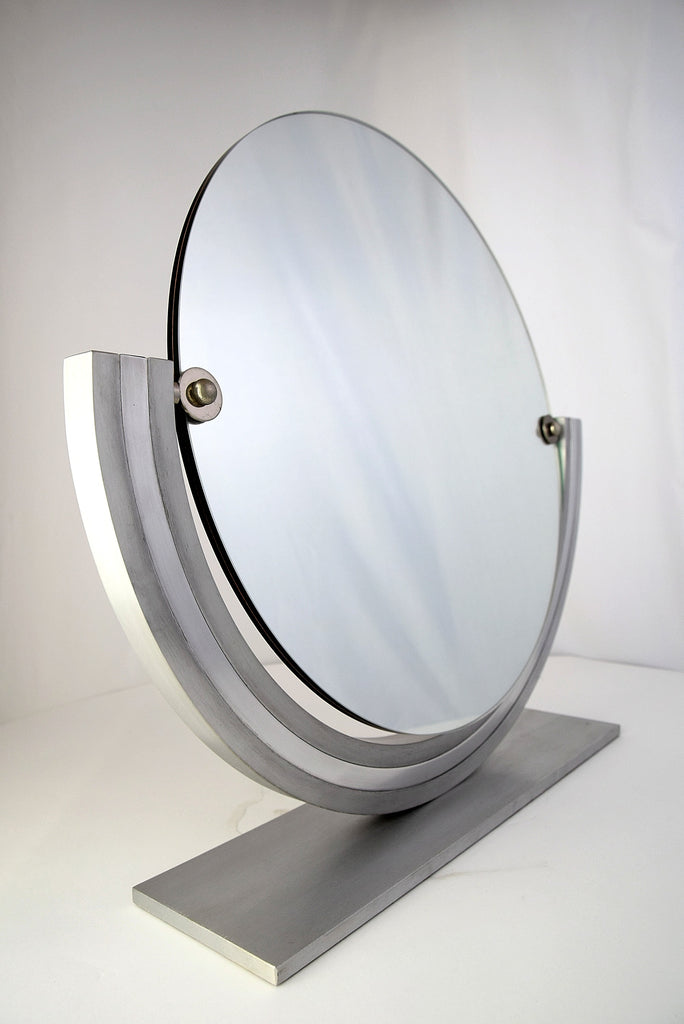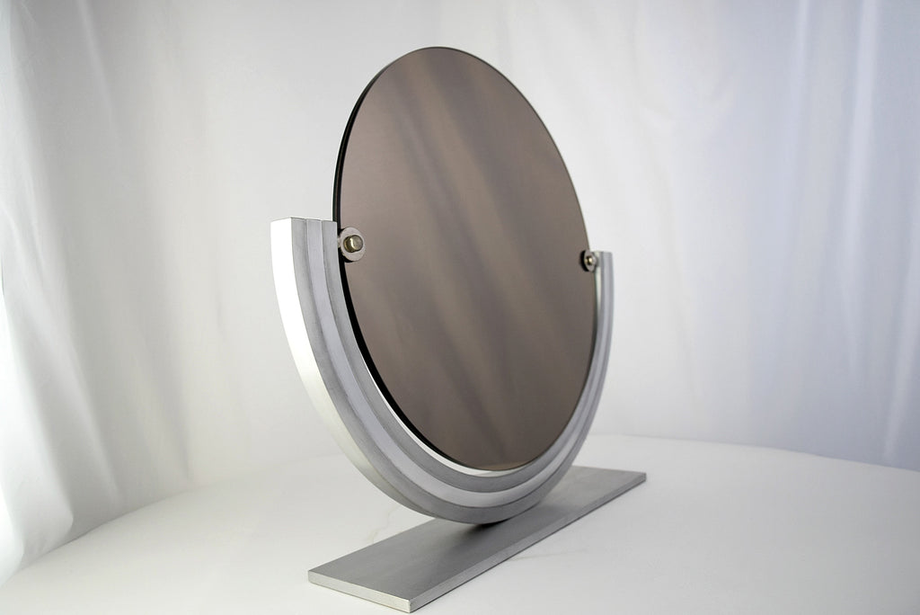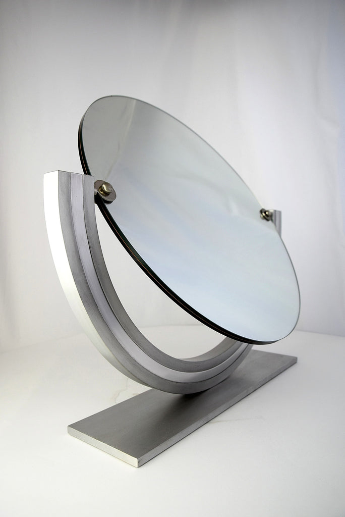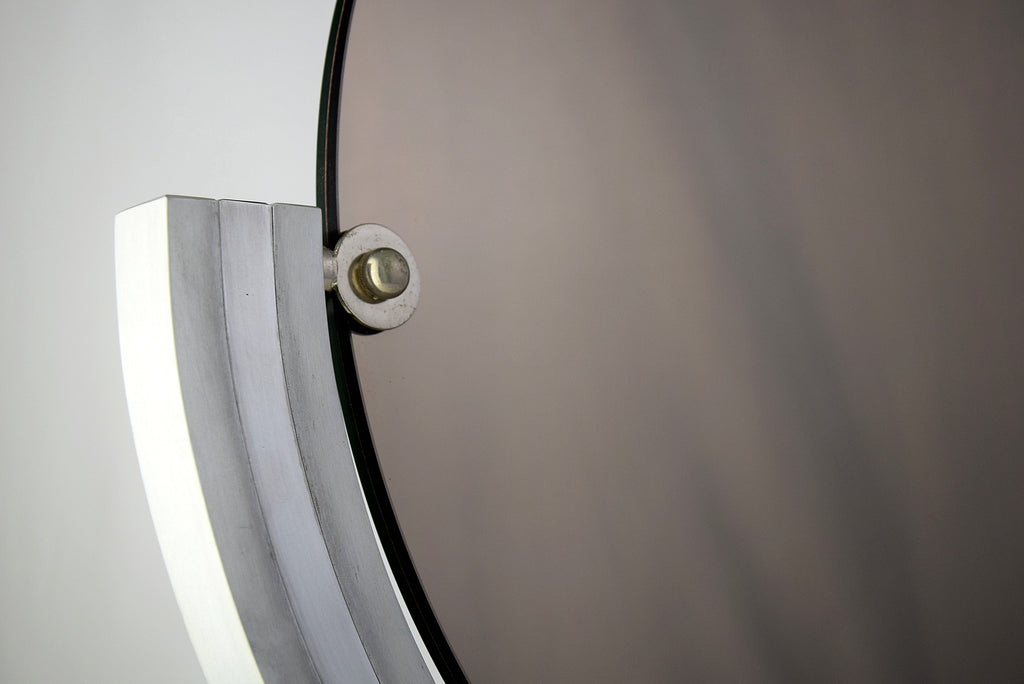 Elevate your space with this exquisite 1970s Italian round adjustable vanity or tabletop mirror. Crafted with impeccable attention to detail, this mirror is a stunning example of mid-century modern design, combining functionality with a sleek, minimalist aesthetic.