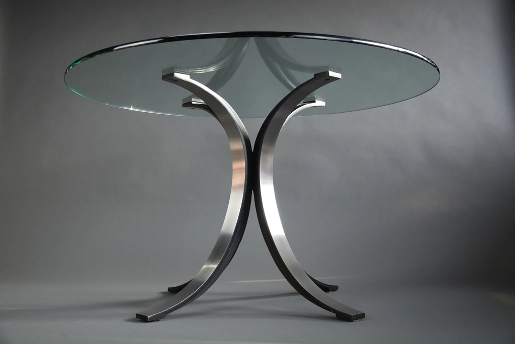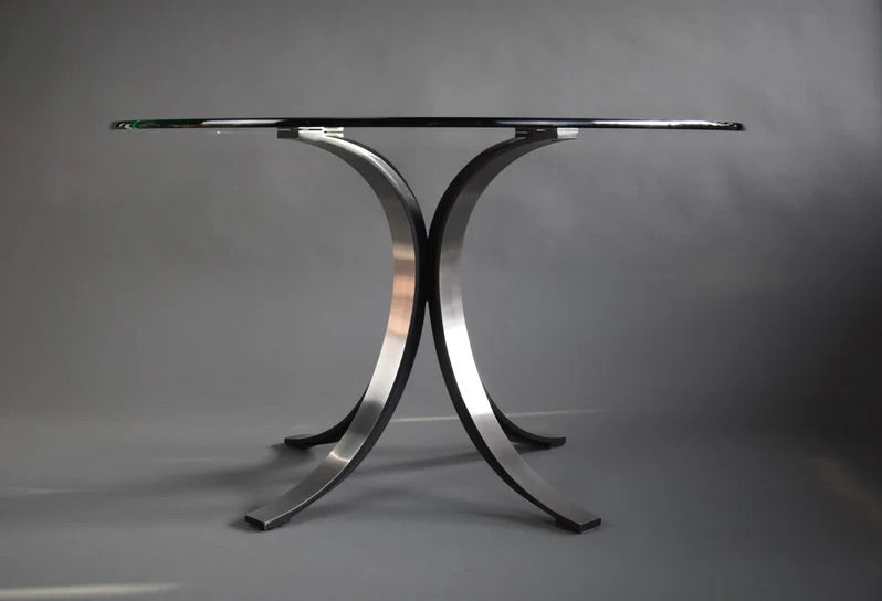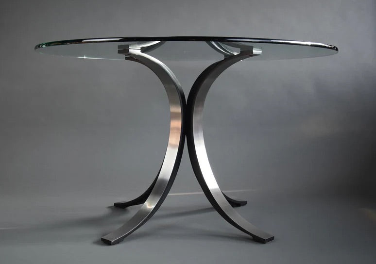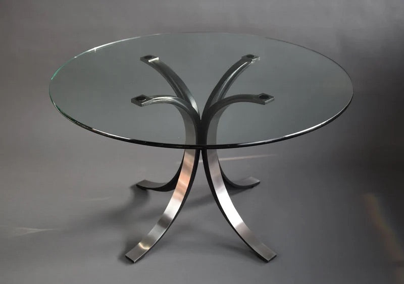 The table comes with its original circular glass top, which rests gracefully on four integrated aluminium arms extending from the central support. Its graceful silhouette and innovative structure make the T69 a timeless centerpiece for dining or design-forward interiors.