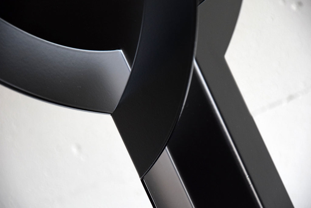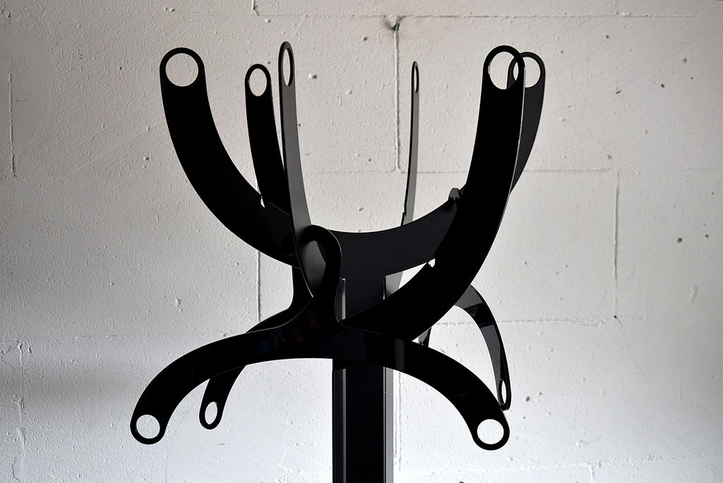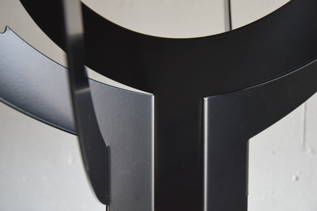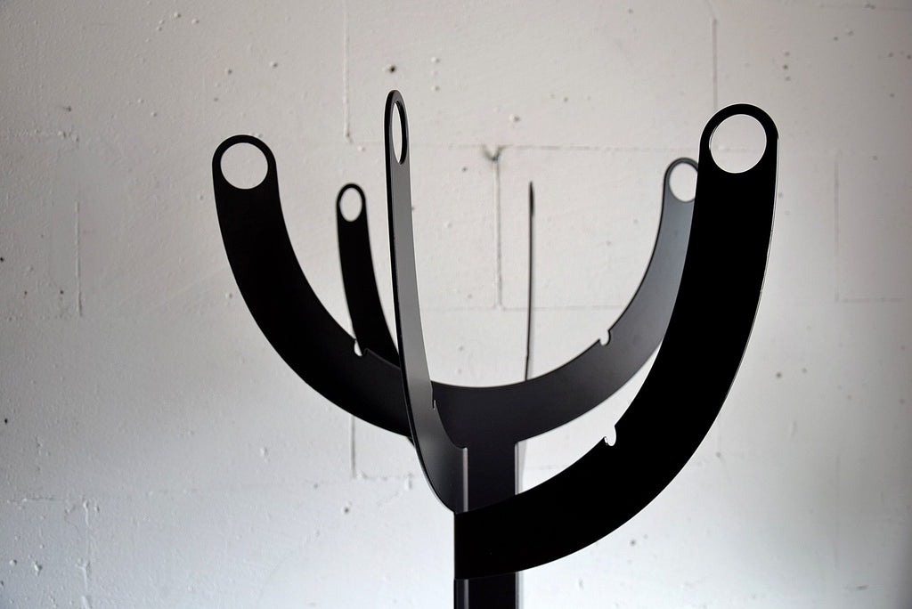 Vintage ObjectsEnhance your space with this Italian postmodern black powder-coated metal coat stand, a perfect blend of function and artistry. Its sculptural design, reminiscent of the 1980s, makes it an ideal centerpiece for contemporary interiors or collectors of iconic modernist furniture.