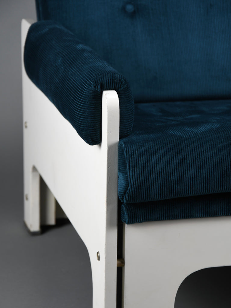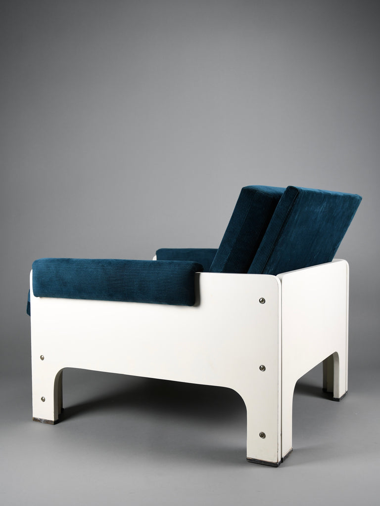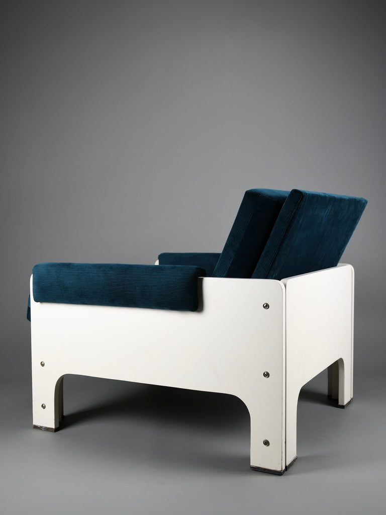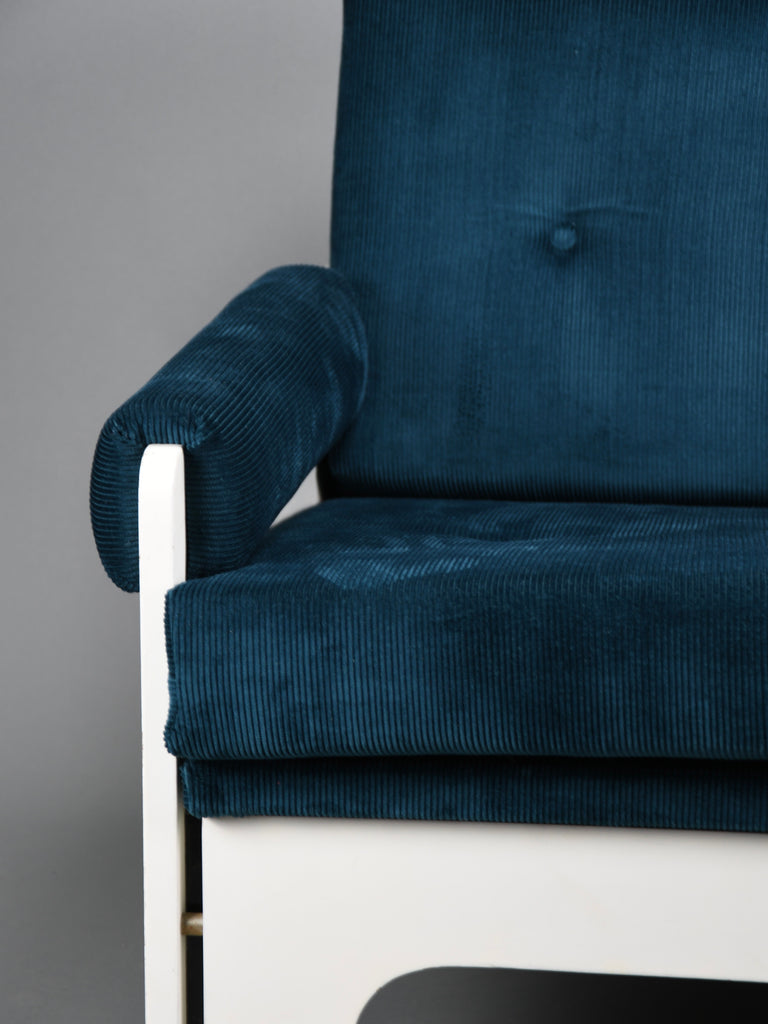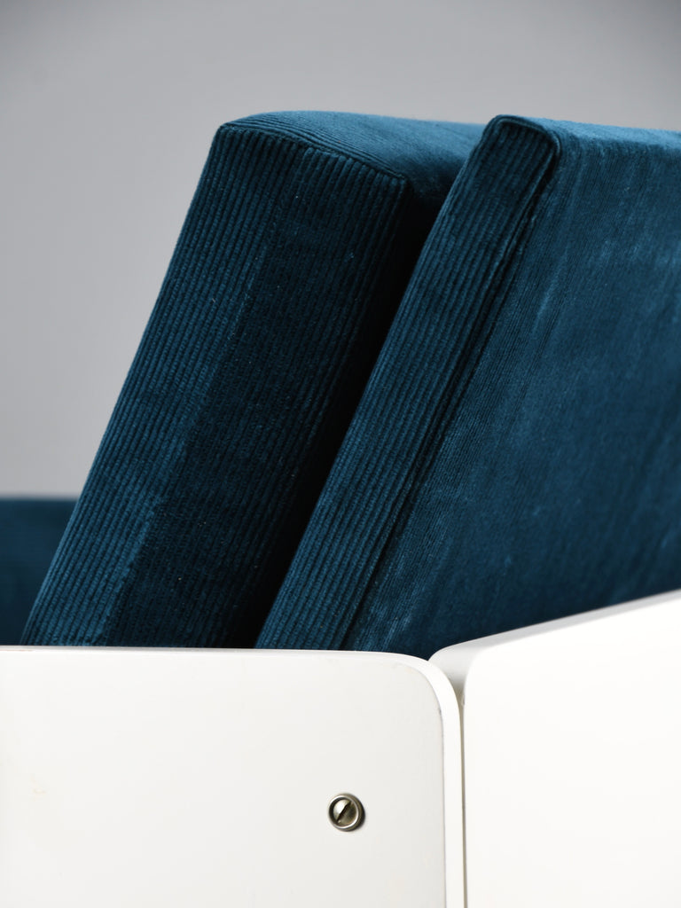 A striking example of Dutch modernism, this lounge chair was designed by architect Jan Pieter Berghoef for Spectrum in the 1960s. With its clean architectural lines and bold contrast between the white lacquered wooden frame and newly reupholstered deep blue corduroy cushions, the chair showcases Berghoef’s minimalist yet playful aesthetic.
