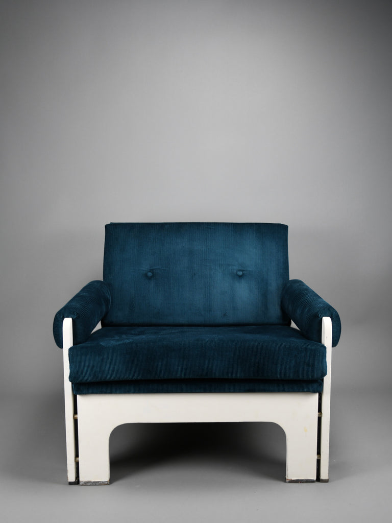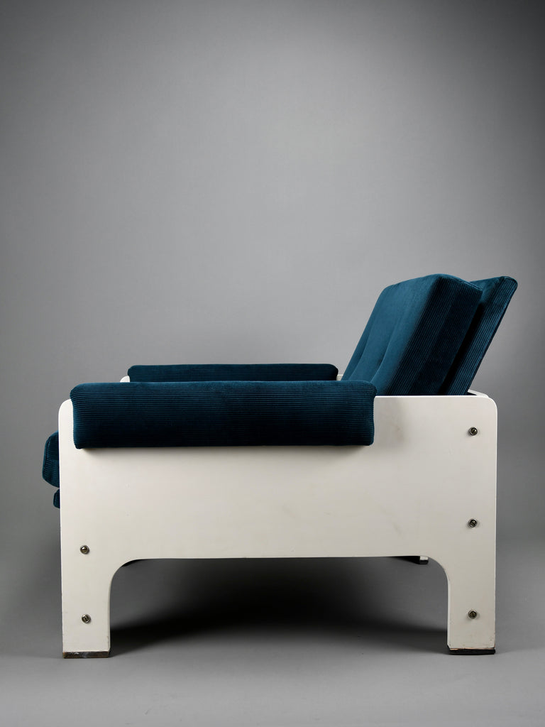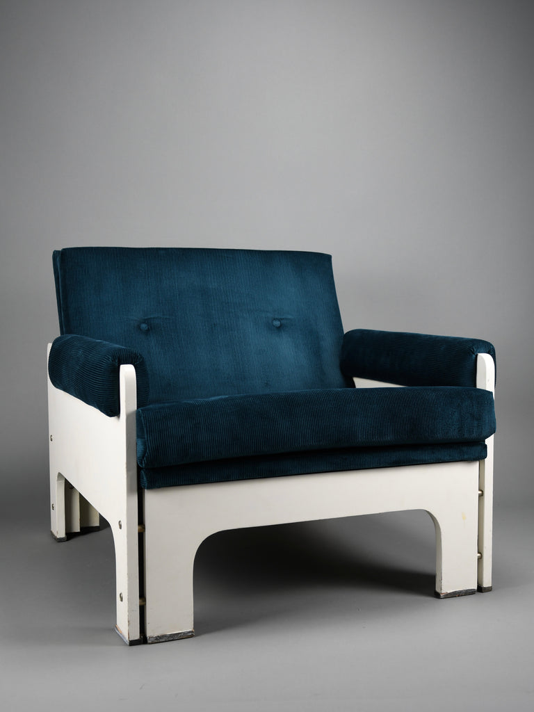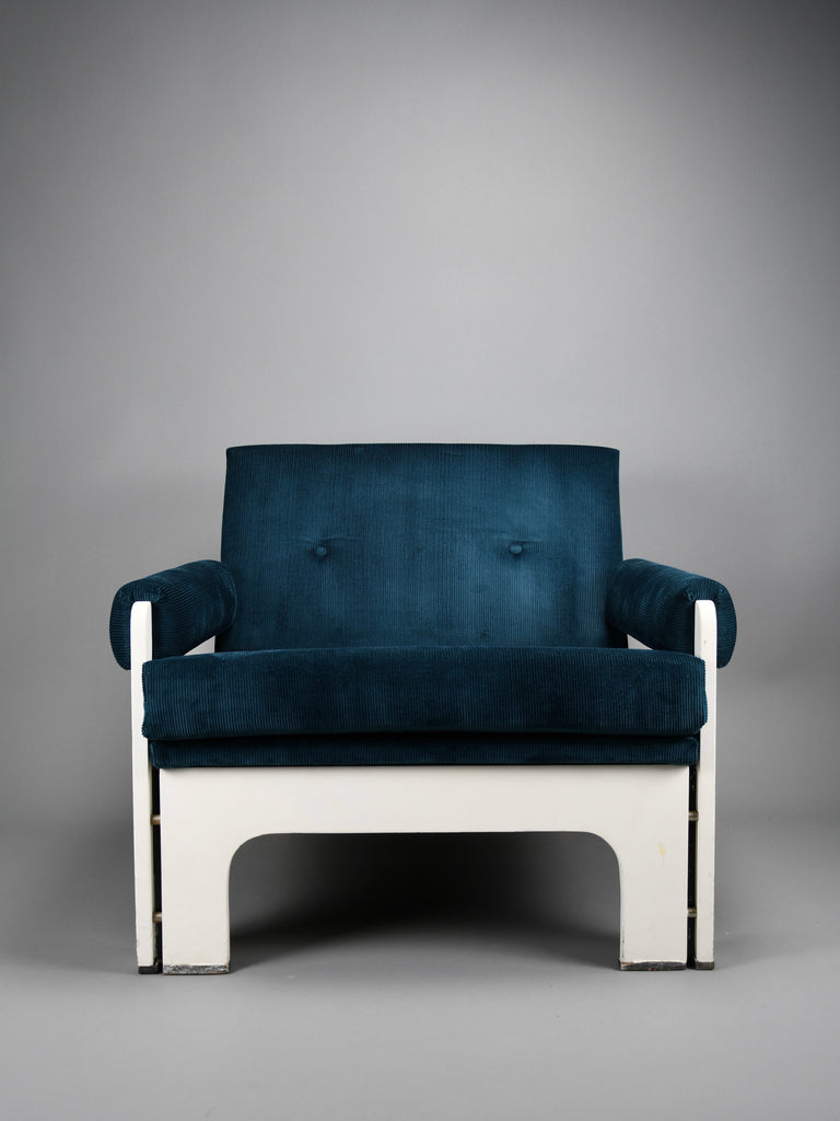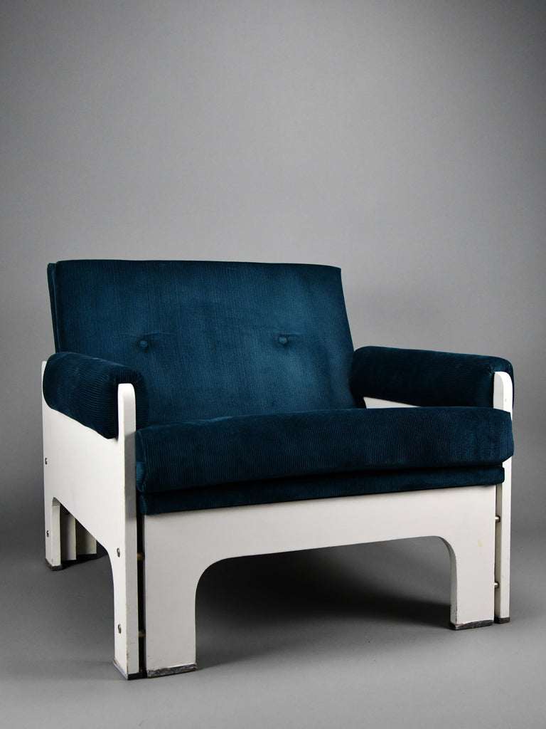 A striking example of Dutch modernism, this lounge chair was designed by architect Jan Pieter Berghoef for Spectrum in the 1960s. With its clean architectural lines and bold contrast between the white lacquered wooden frame and newly reupholstered deep blue corduroy cushions, the chair showcases Berghoef’s minimalist yet playful aesthetic.