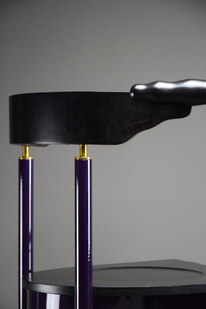 • Striking Material Contrasts: The chair harmoniously blends materials with its front legs, seat, and sculptural backrest crafted from beautifully stained wood, complemented by its purple-painted iron structure and rear legs. The hand-crafted details of the backrest showcase true artistry.