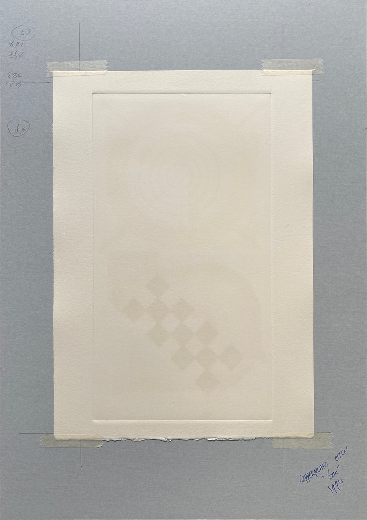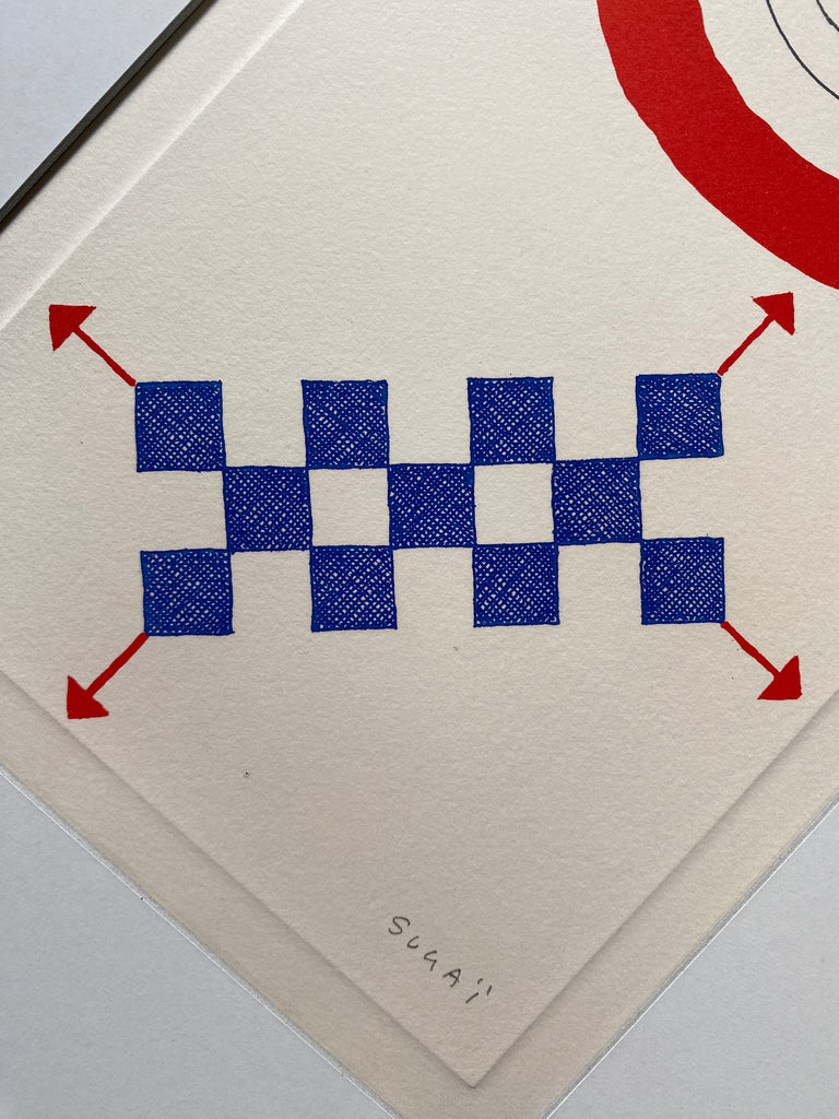 Step into the vibrant world of contemporary Japanese art with "Le Soleil," a captivating copperplate etching by the renowned artist Kumi Sugaï. Created in 1996, this piece is a harmonious blend of geometric precision and dynamic symbolism, epitomizing Sugaï's distinctive style.