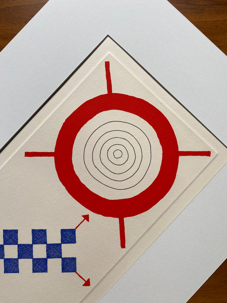 "Le Soleil" features a striking composition of red and blue elements against a pristine white background. The upper section is dominated by a bold red circle, reminiscent of the sun, surrounded by concentric rings that draw the viewer’s eye inward, symbolizing energy and life. Below, a complex arrangement of blue diamond shapes, interspersed with red arrows, evokes a sense of movement and direction, embodying the dynamism of the cosmos.