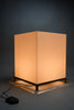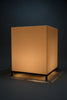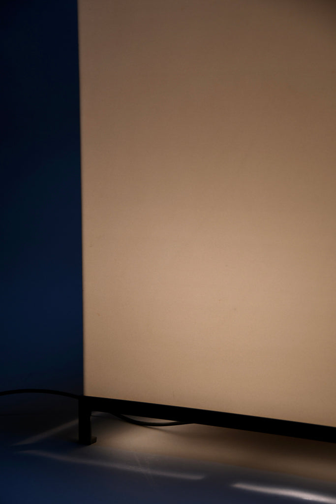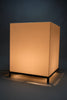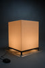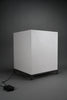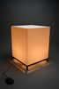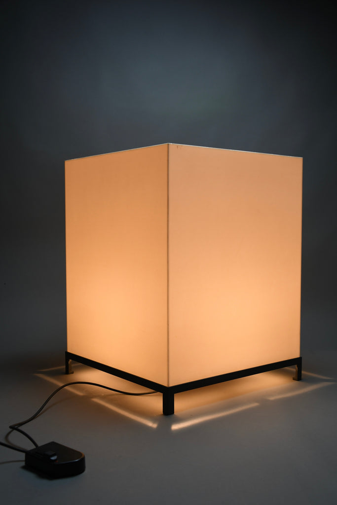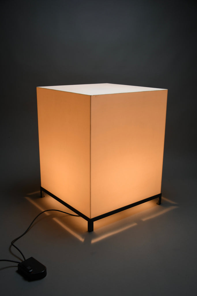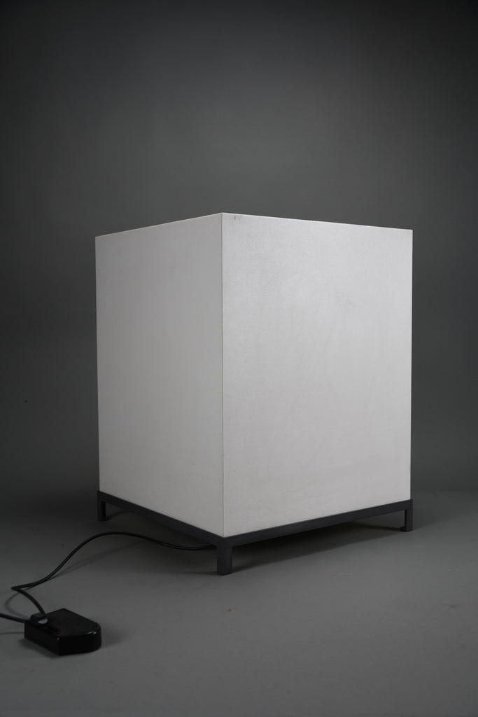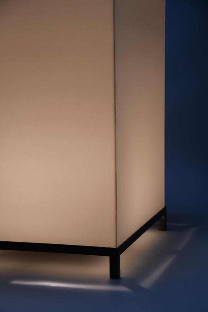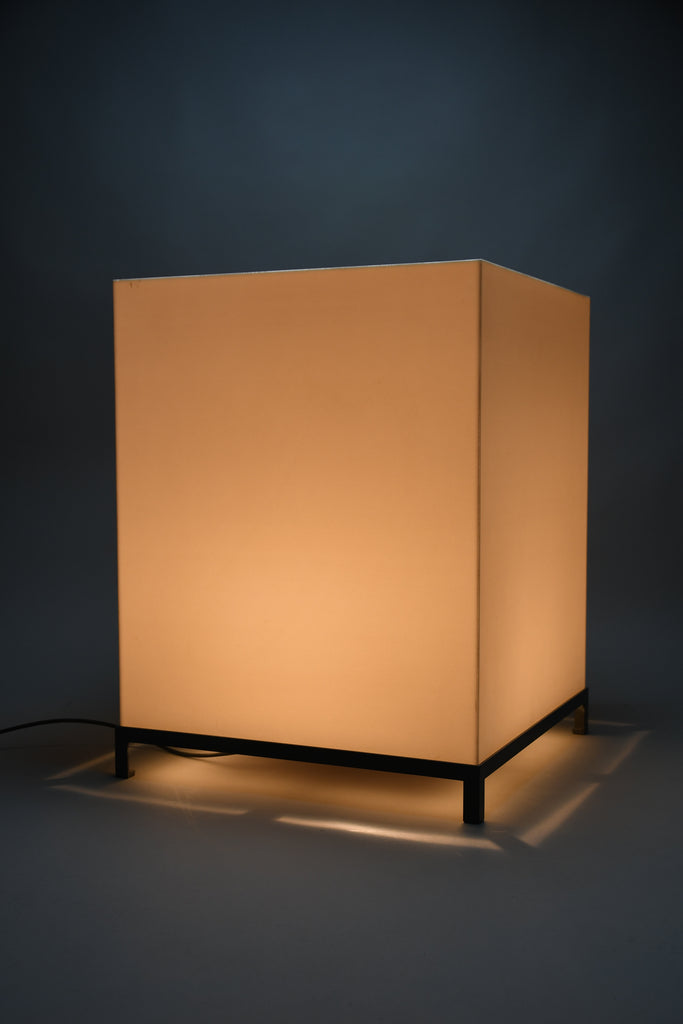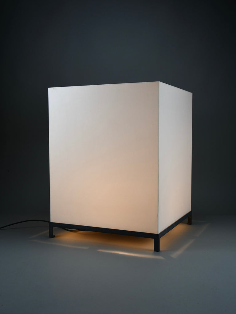 The lamp features a precisely constructed gunmetal-colored iron frame, elevating a perfectly proportioned cube-shaped volume. The light source is enclosed within an opaline acrylic resin diffuser, which emits a warm, even glow while maintaining a strong geometric presence. When illuminated, the lamp transforms into a luminous architectural object; when off, it reads as a refined industrial sculpture.