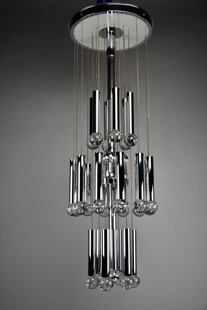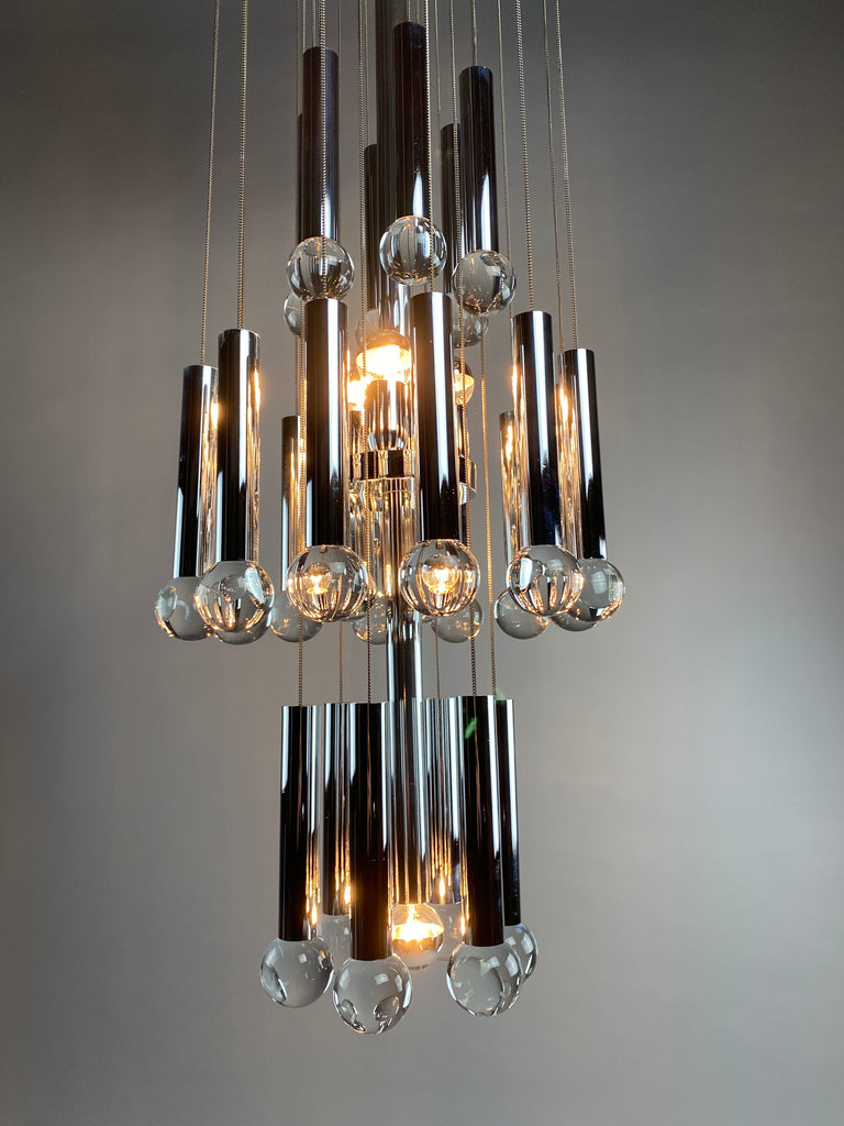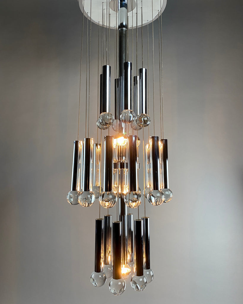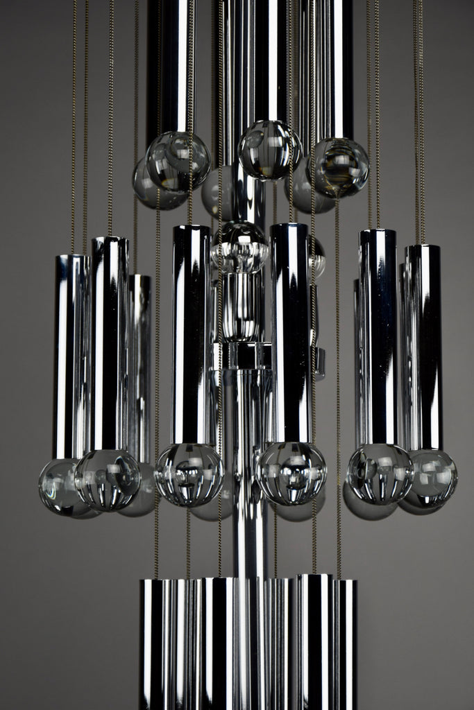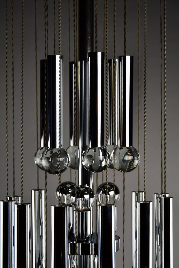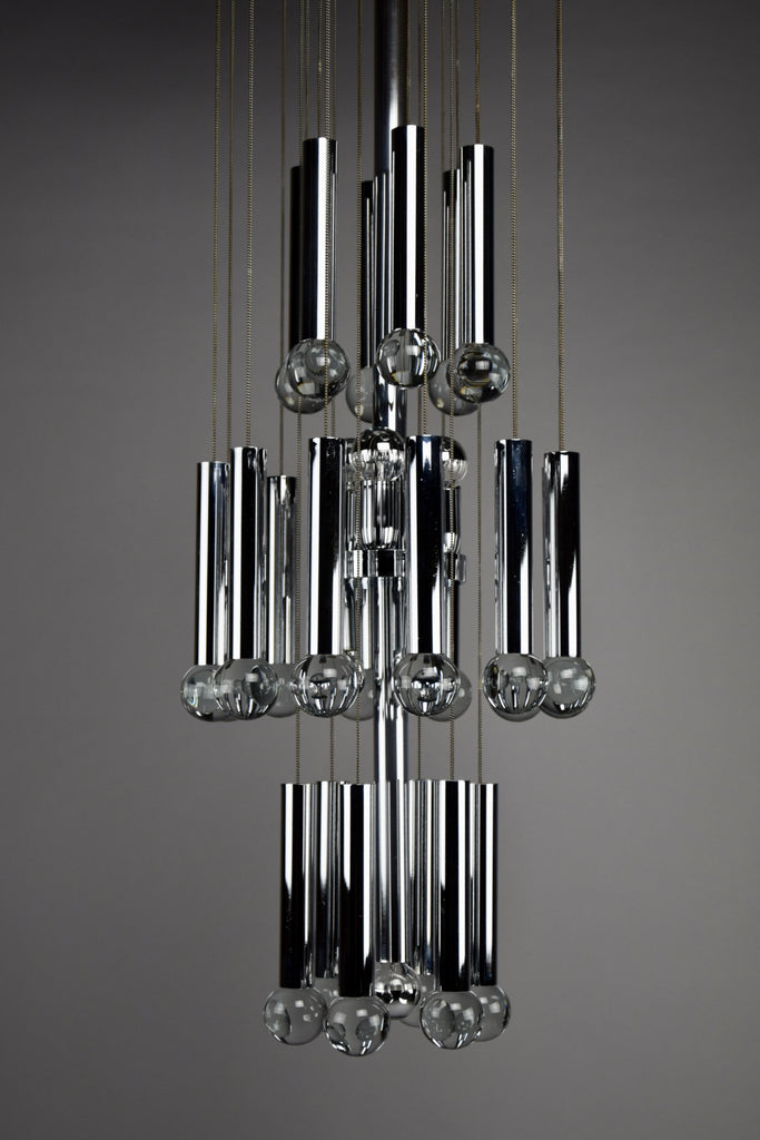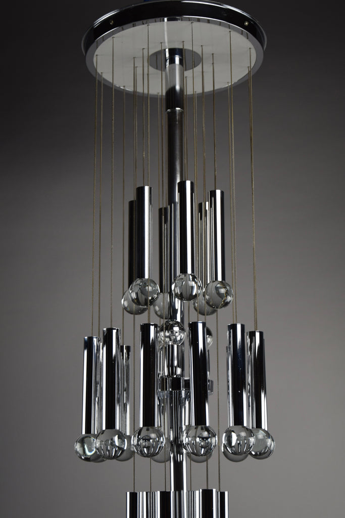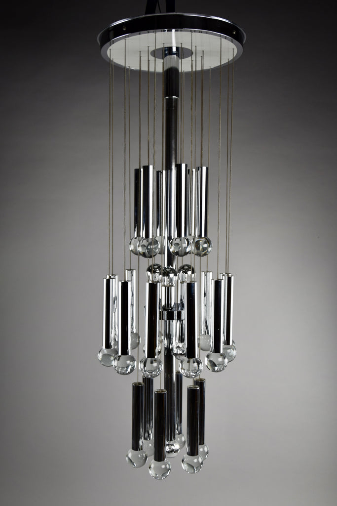Sciolari`s first designs were Atom inspired pendants, but in the 1960s he shifted to conventional chandelier forms like the neoclassical Sciolari from the ovali collection.