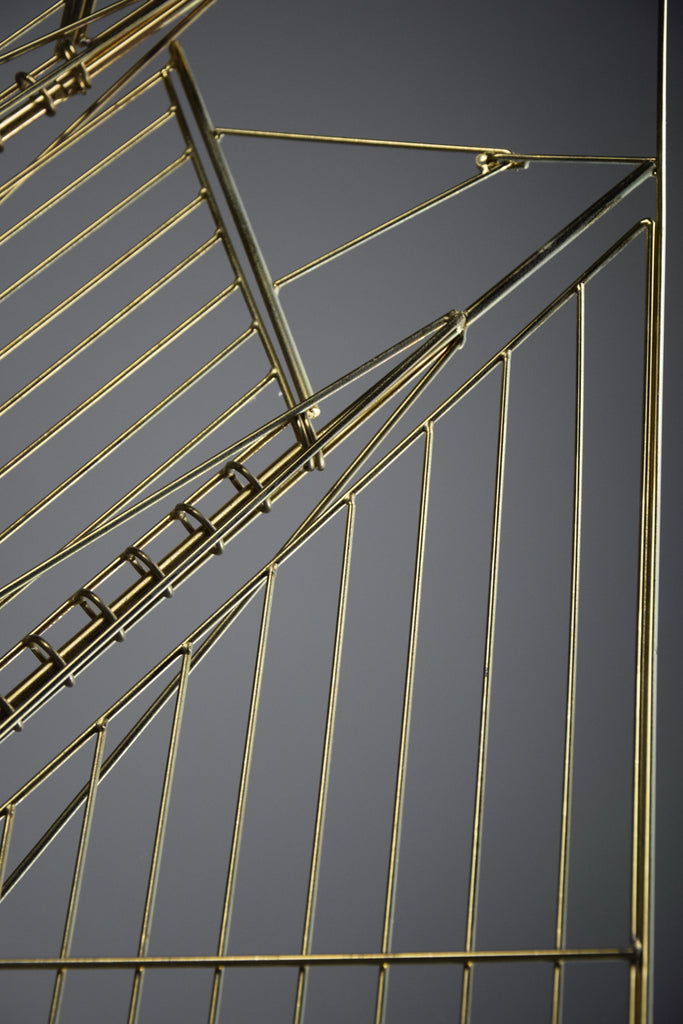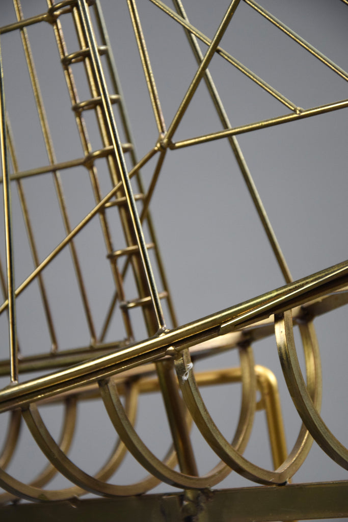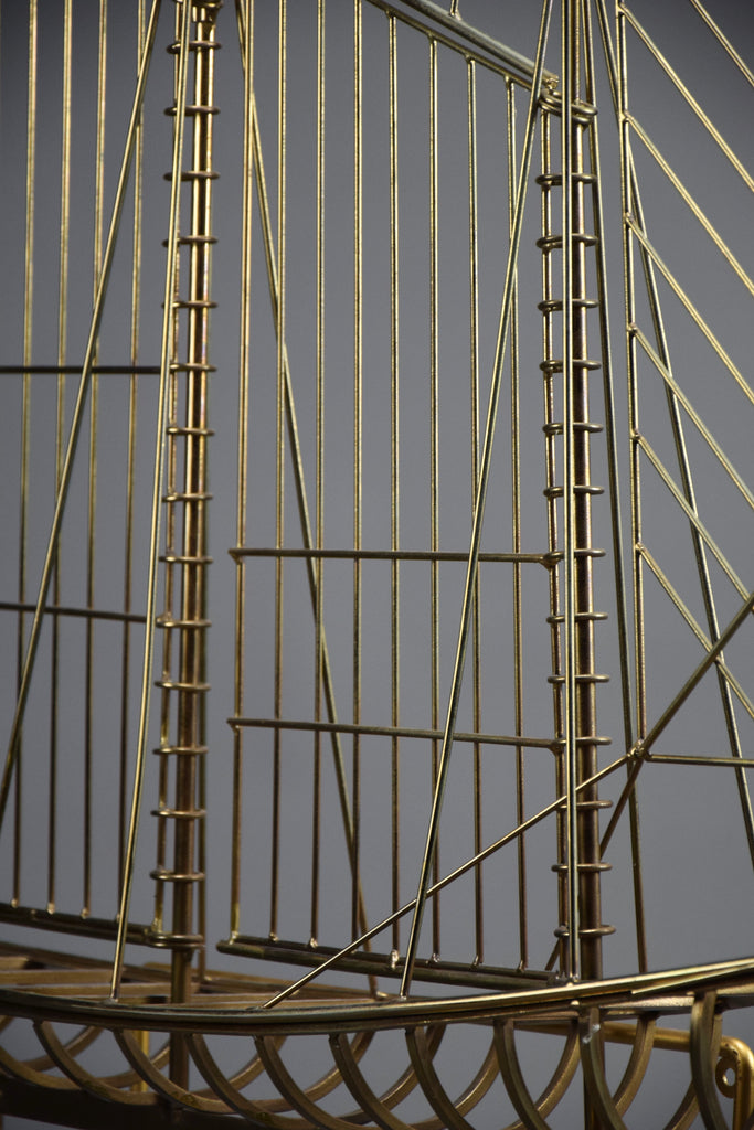 Elevate your collection with this exceptional 1976 mid-century modern brass wire sculpture by Curtis Jeré. This freestanding, three-dimensional piece is an early example of Jeré’s iconic work and captures the timeless elegance of a sailboat in full splendor. Measuring an impressive 118 cm in length and nearly 105 cm in height, this piece doubles as both a tabletop sculpture and a wall-mounted display, offering versatile placement options.