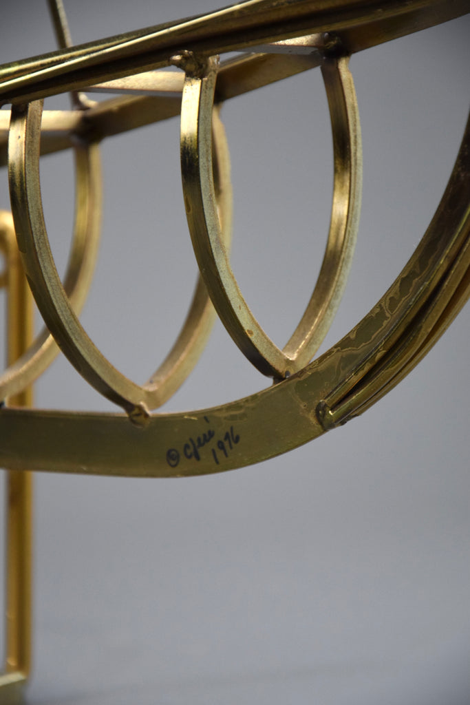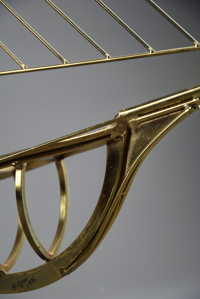 Every detail in this brass sailboat showcases the craftsmanship Curtis Jeré is renowned for, from the precise geometry of the sails to the graceful curvature of the hull. Signed and dated, it is a testament to its authenticity and historical significance. Remarkably preserved, this sculpture remains in excellent condition, embodying the refined aesthetics of the 1970s.