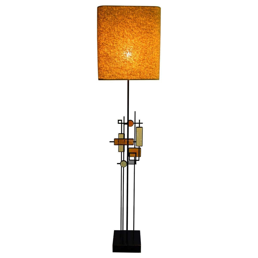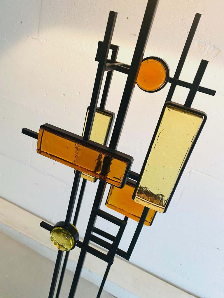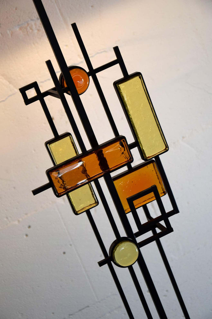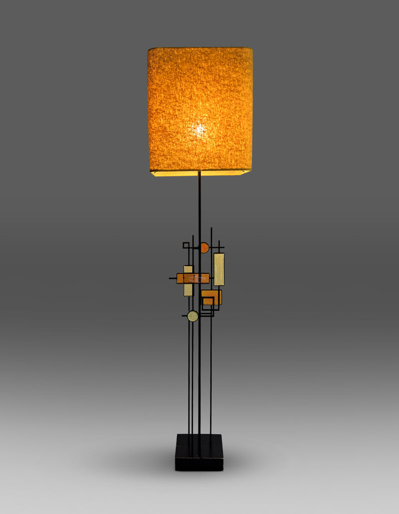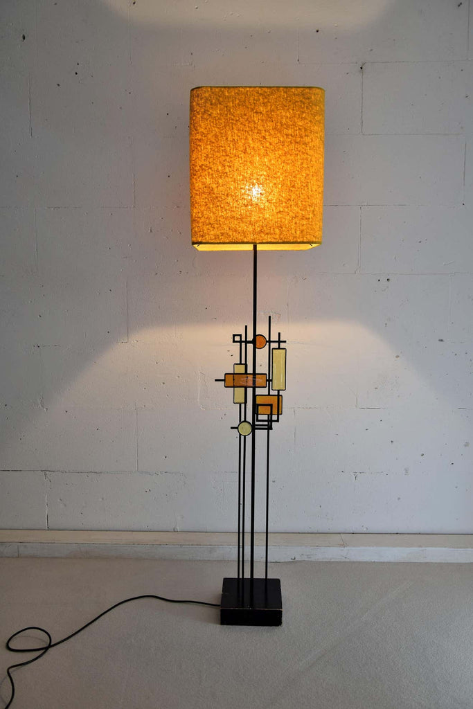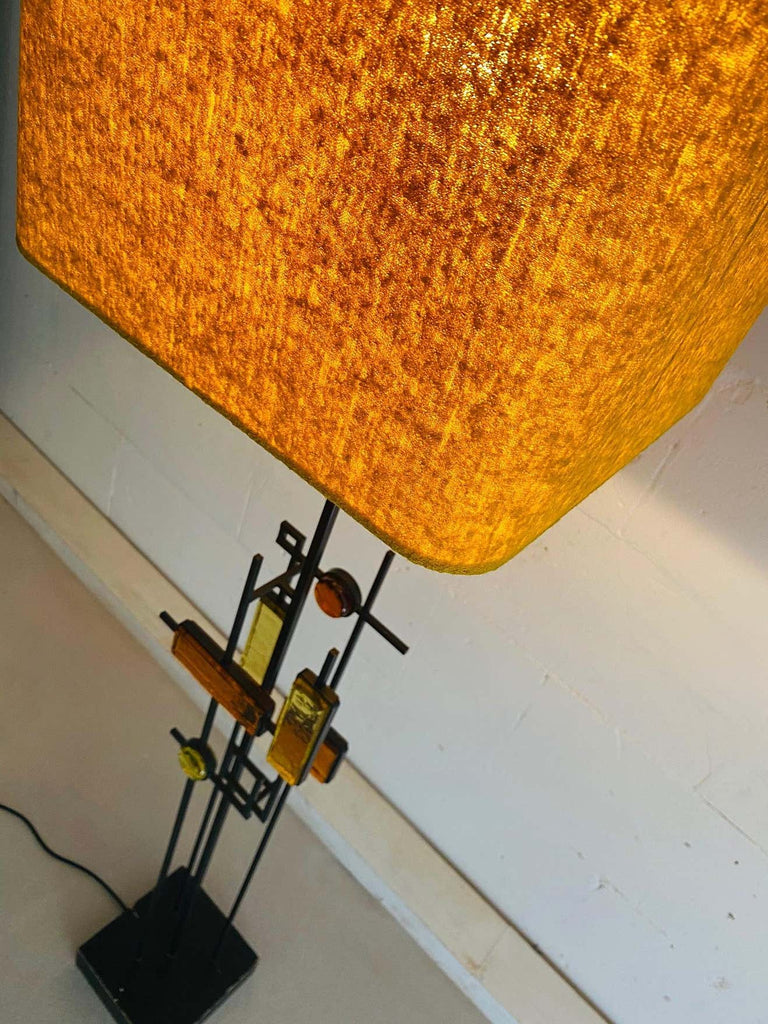Svend Aage Holm SørensenBlack wrought iron and glass floor or table lamp. Various pieces of thick amber and yellow glass in geometric shapes framed in black wrought iron and suspended on square thin metal rods above a square wooden base colored black. Designed by Svend Aage Holm Sørensen, Denmark, 1960. This gorgeous piece come with a new custom made Bouclé shade in the style of the period.