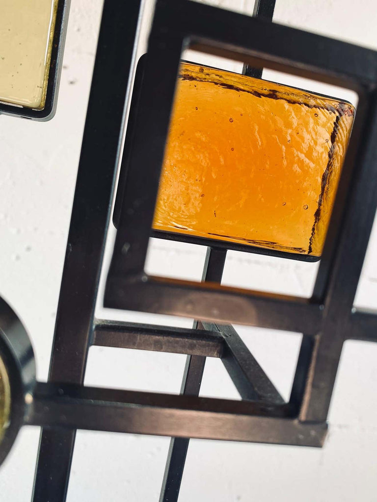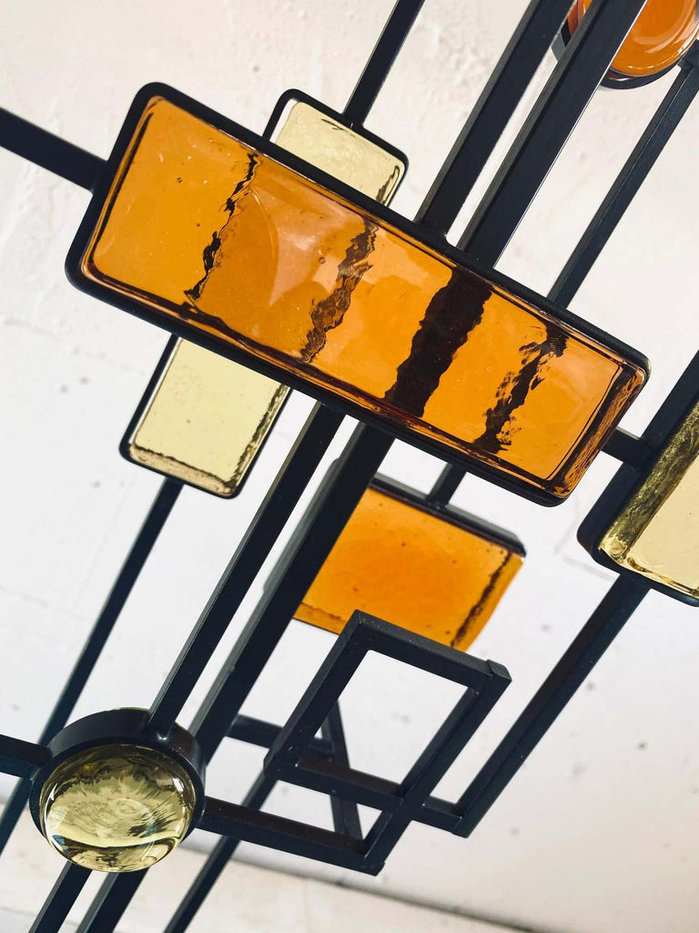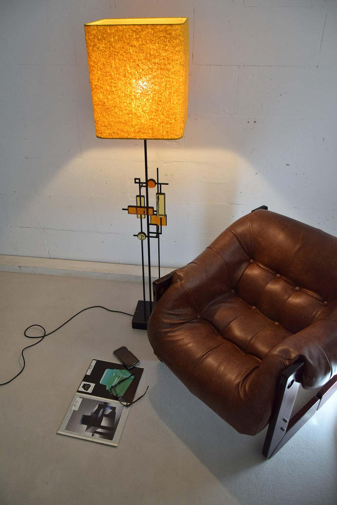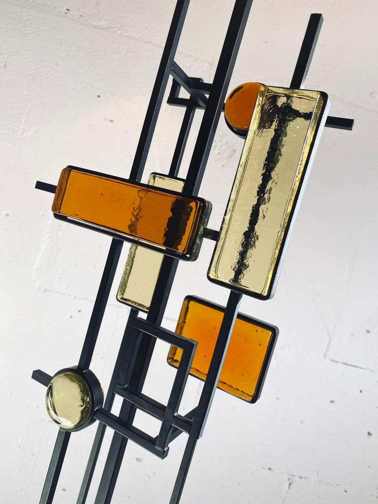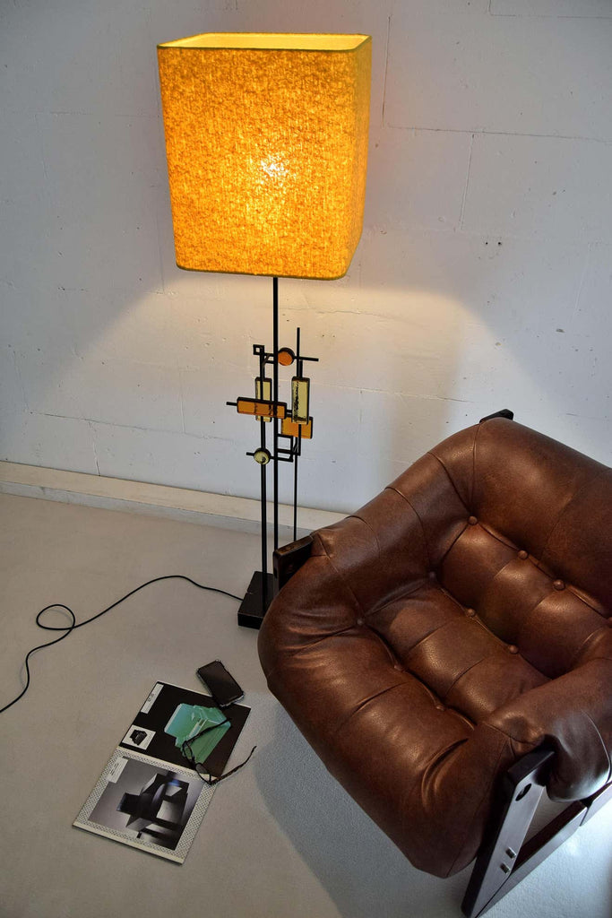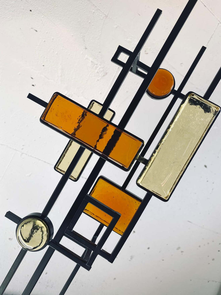 Svend Aage Holm SørensenBlack wrought iron and glass floor or table lamp. Various pieces of thick amber and yellow glass in geometric shapes framed in black wrought iron and suspended on square thin metal rods above a square wooden base colored black. Designed by Svend Aage Holm Sørensen, Denmark, 1960. This gorgeous piece come with a new custom made Bouclé shade in the style of the period.