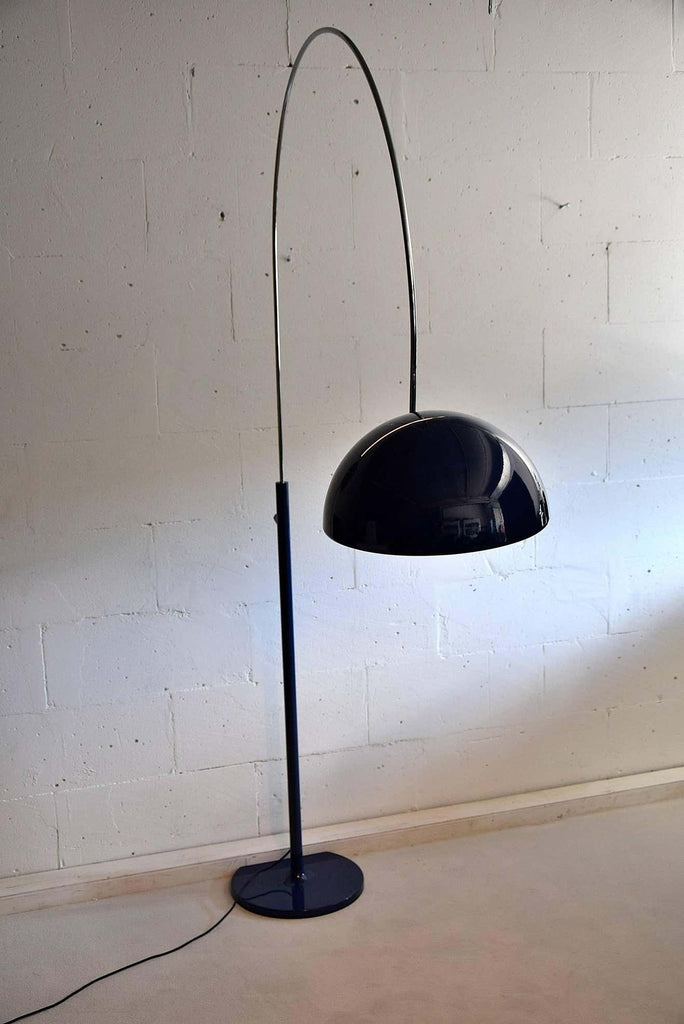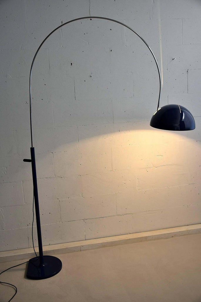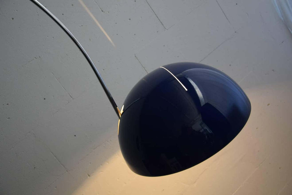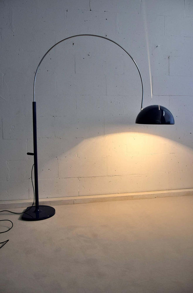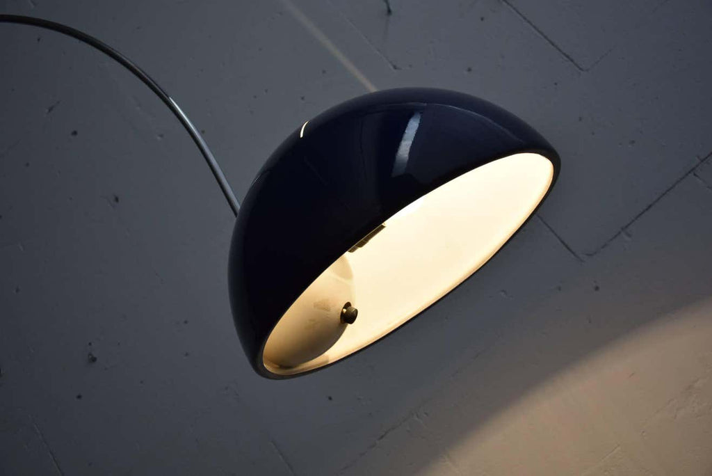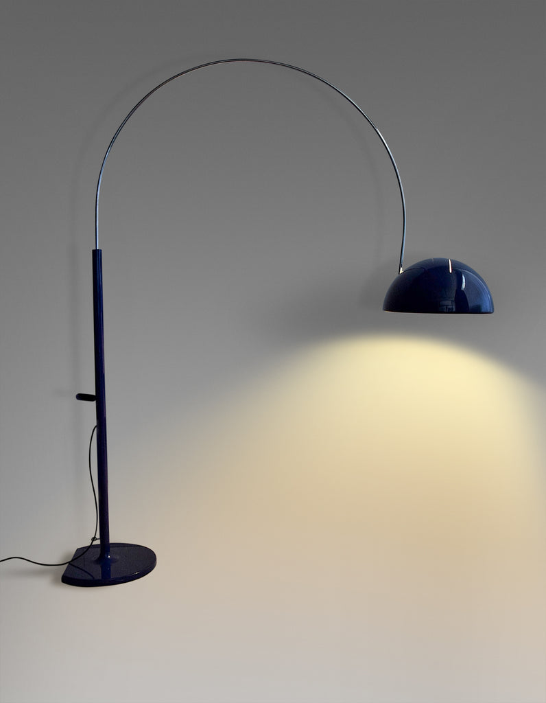 Joe ColomboMid century modern navy blue and chrome floor lamp. Adjustable, arched Coupé floor lamp with semi-spherical stove lacquered aluminium reflector, chrome armature, and lacquered metal base. Designed by Joe Colombo and produced by Oluce, circa 1967. A sophisticated design that is complex to manufacture, the lamp features a grooved shaft with a bakelite handle for adjusting the height and pivoting the armature. The reflector is fitted with a joint to adjust its inclination. The base is rounded but straight at the back, for flush fitting against the wall, where it can rotate through 180 degrees, changing how a floor lamp functions as an element of space design.