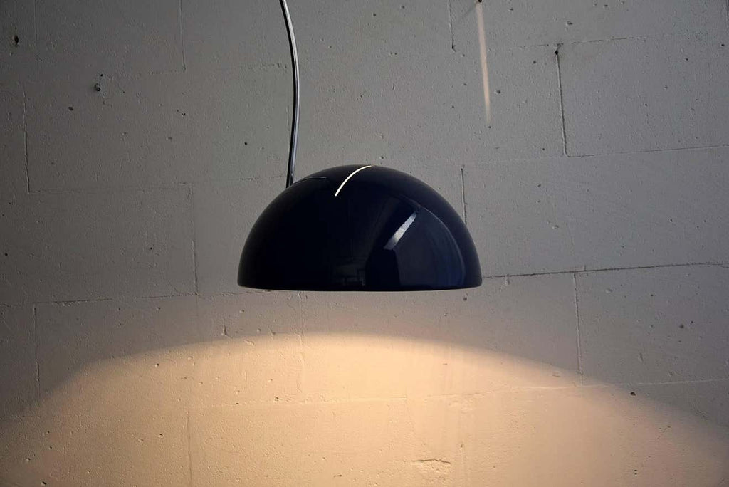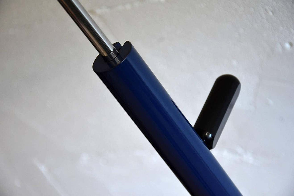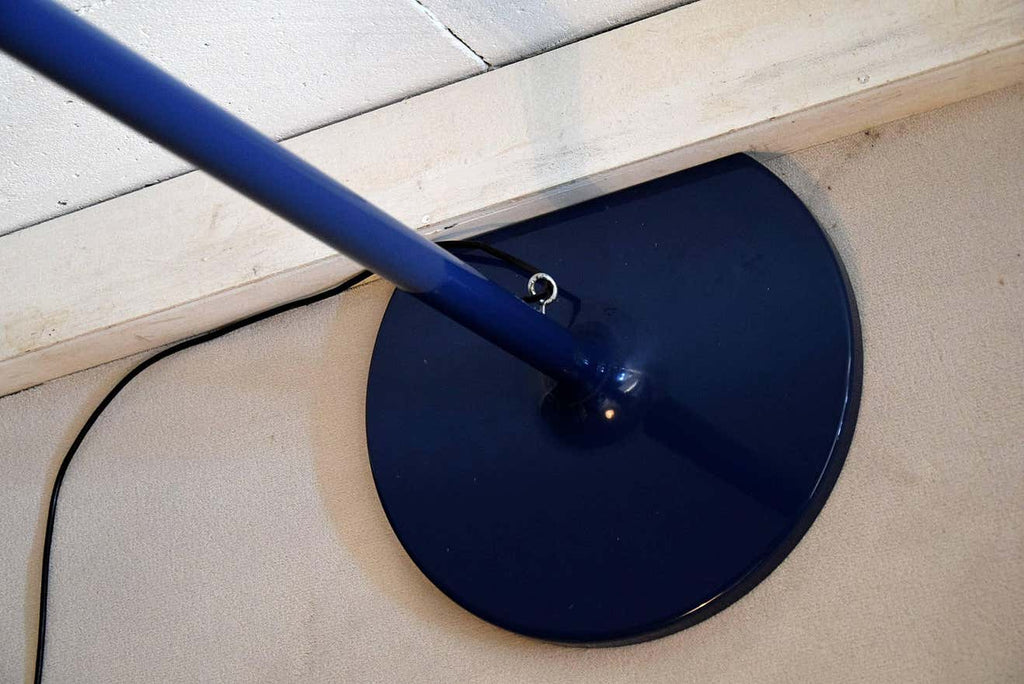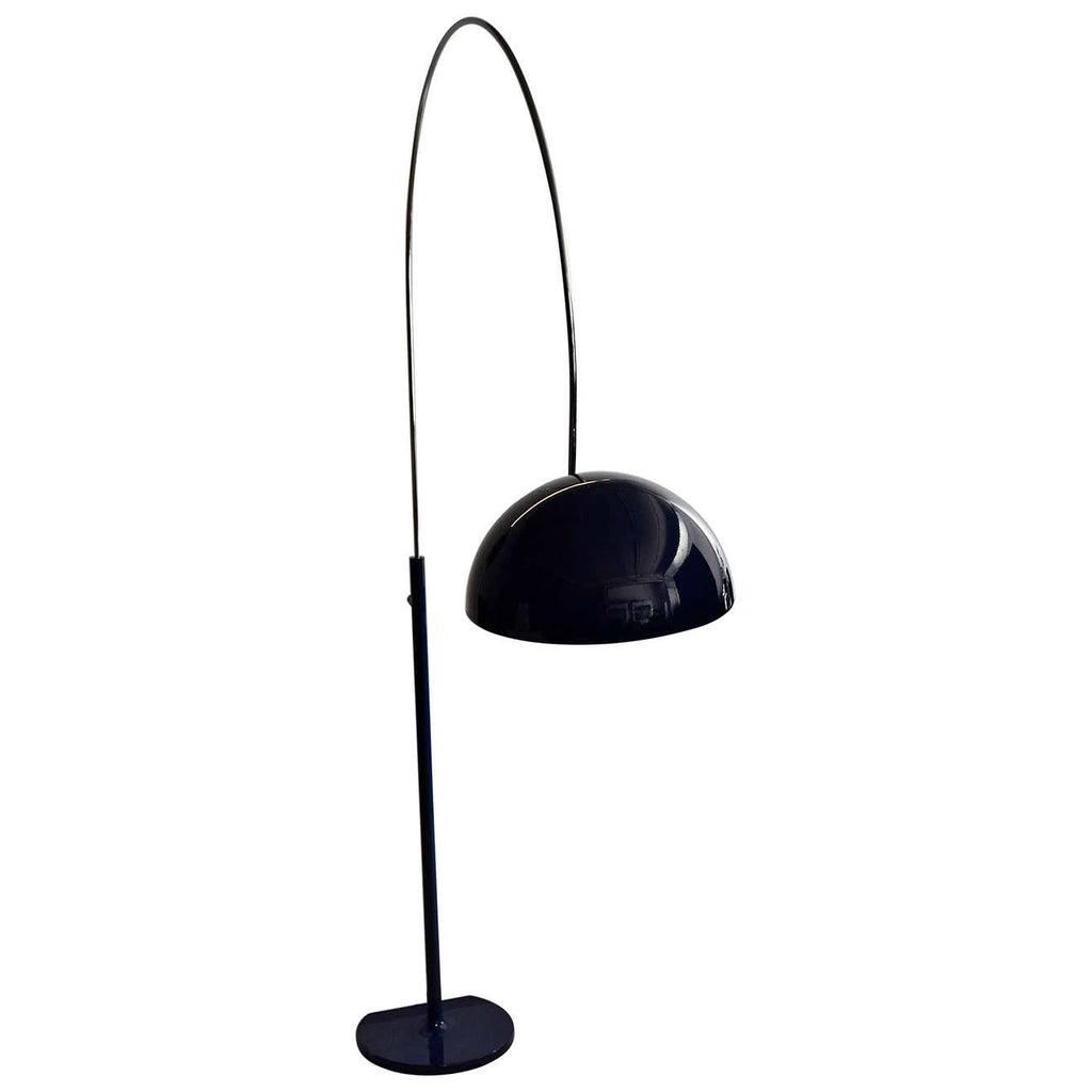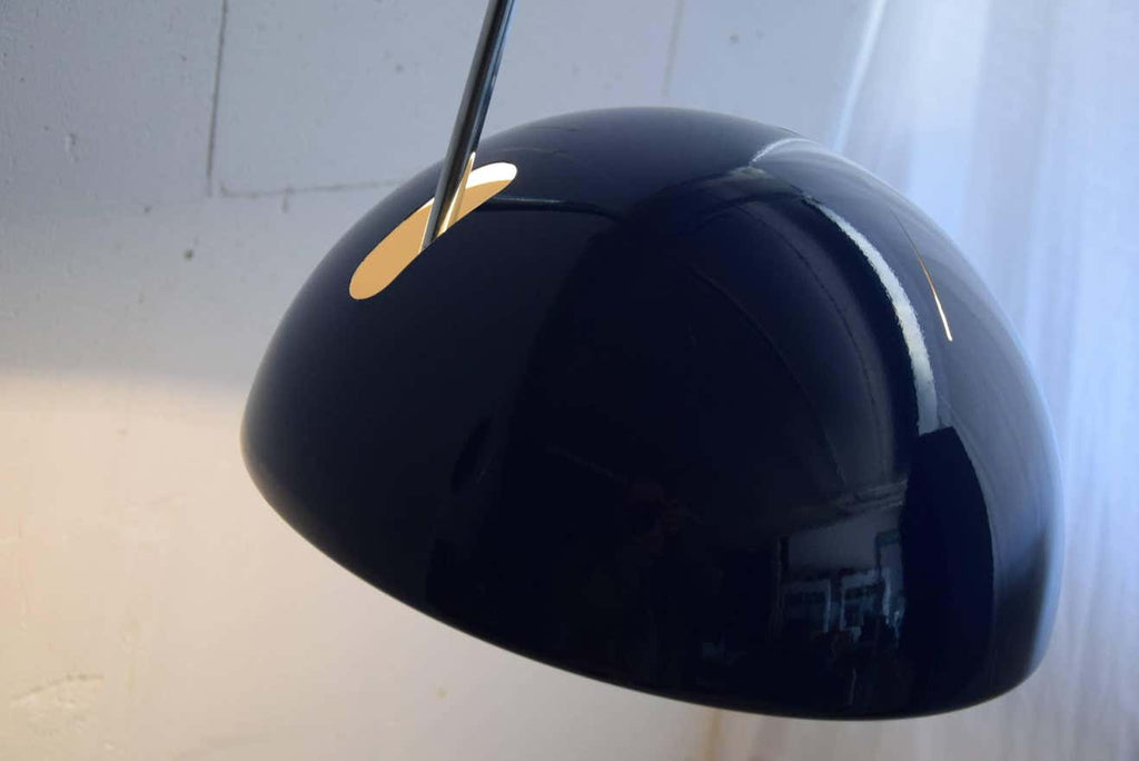 Joe ColomboMid century modern navy blue and chrome floor lamp. Adjustable, arched Coupé floor lamp with semi-spherical stove lacquered aluminium reflector, chrome armature, and lacquered metal base. Designed by Joe Colombo and produced by Oluce, circa 1967. A sophisticated design that is complex to manufacture, the lamp features a grooved shaft with a bakelite handle for adjusting the height and pivoting the armature. The reflector is fitted with a joint to adjust its inclination. The base is rounded but straight at the back, for flush fitting against the wall, where it can rotate through 180 degrees, changing how a floor lamp functions as an element of space design.